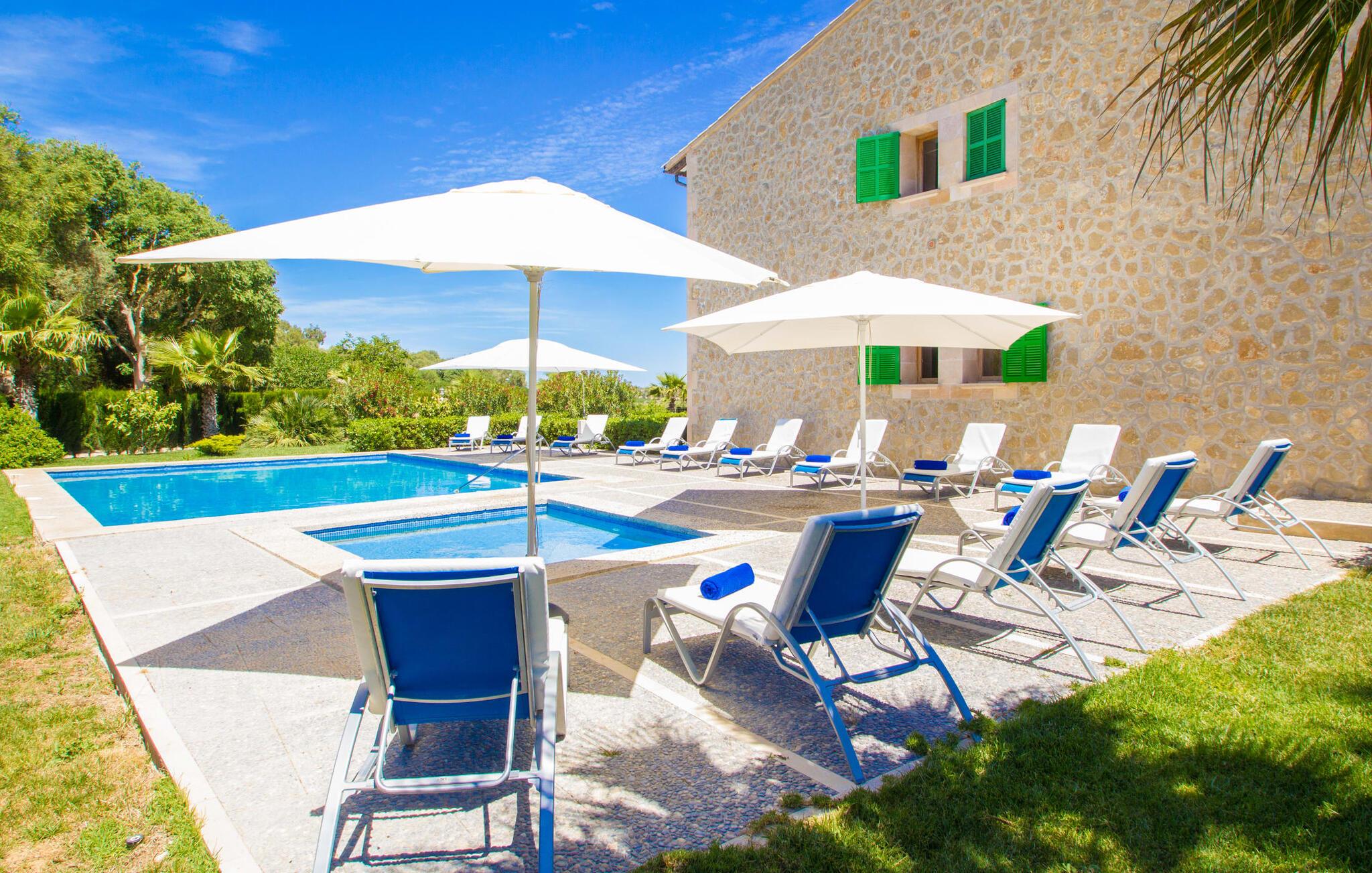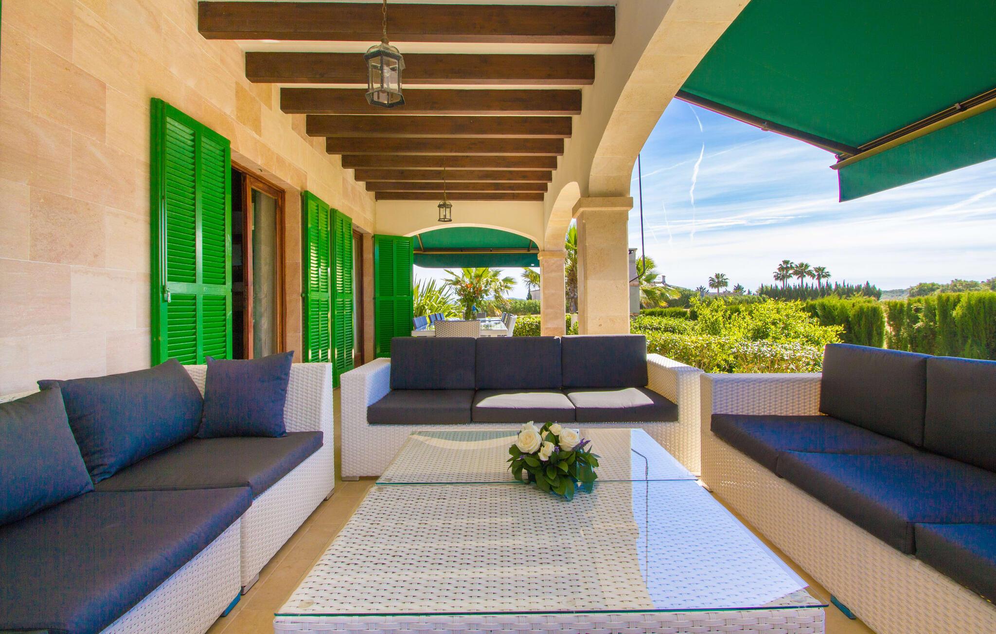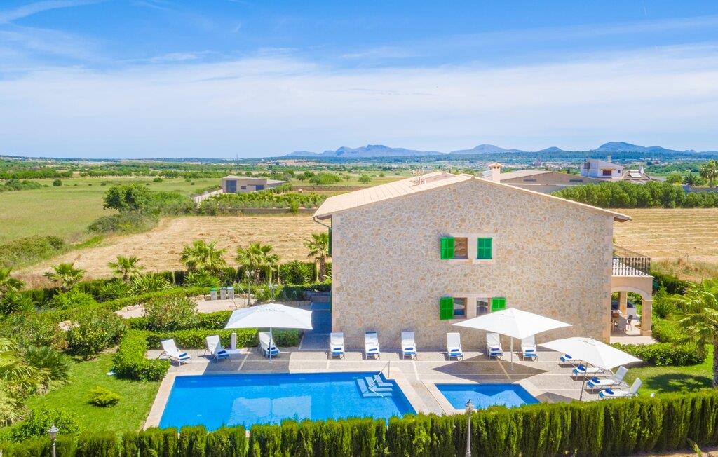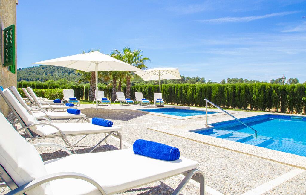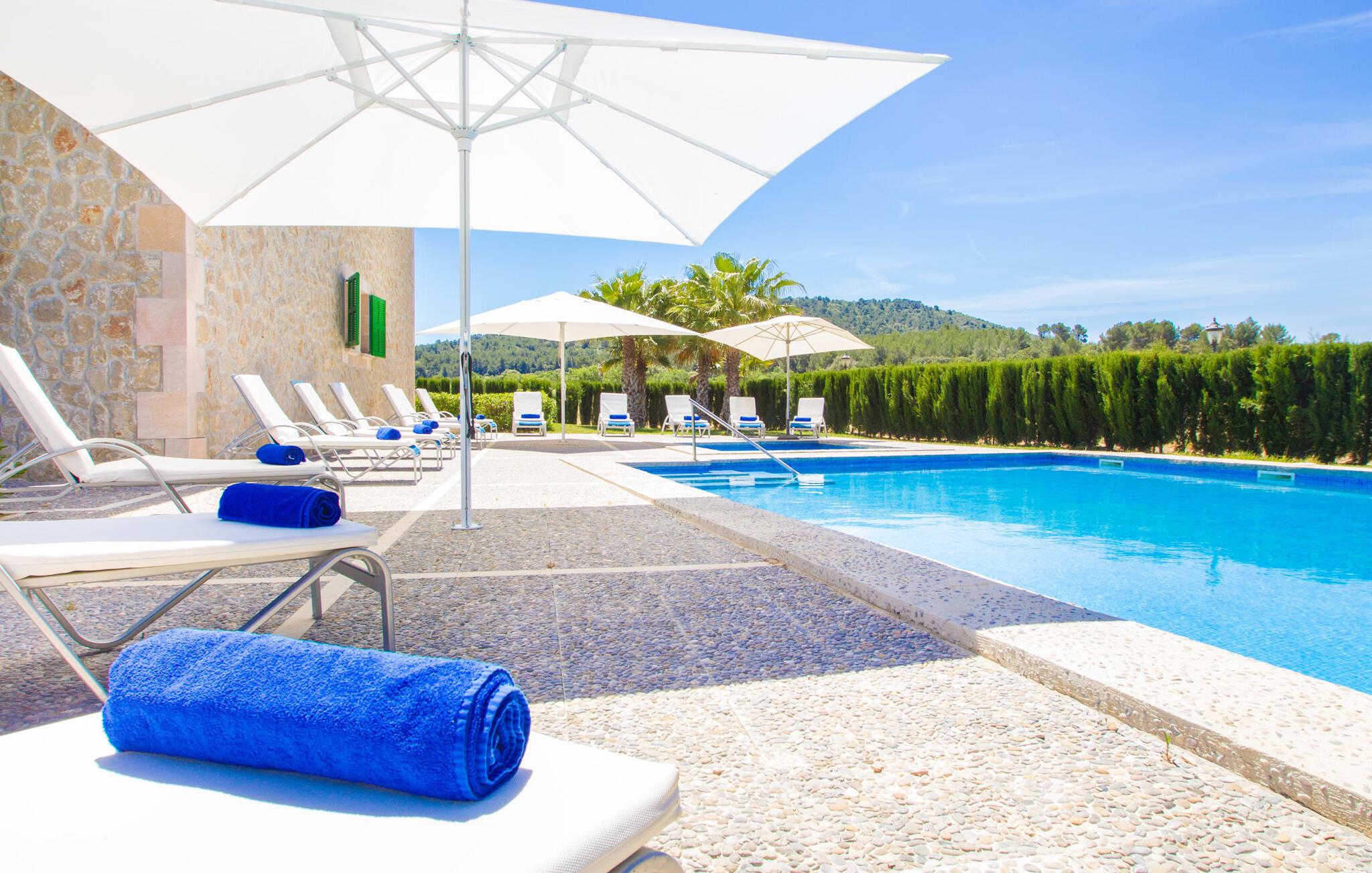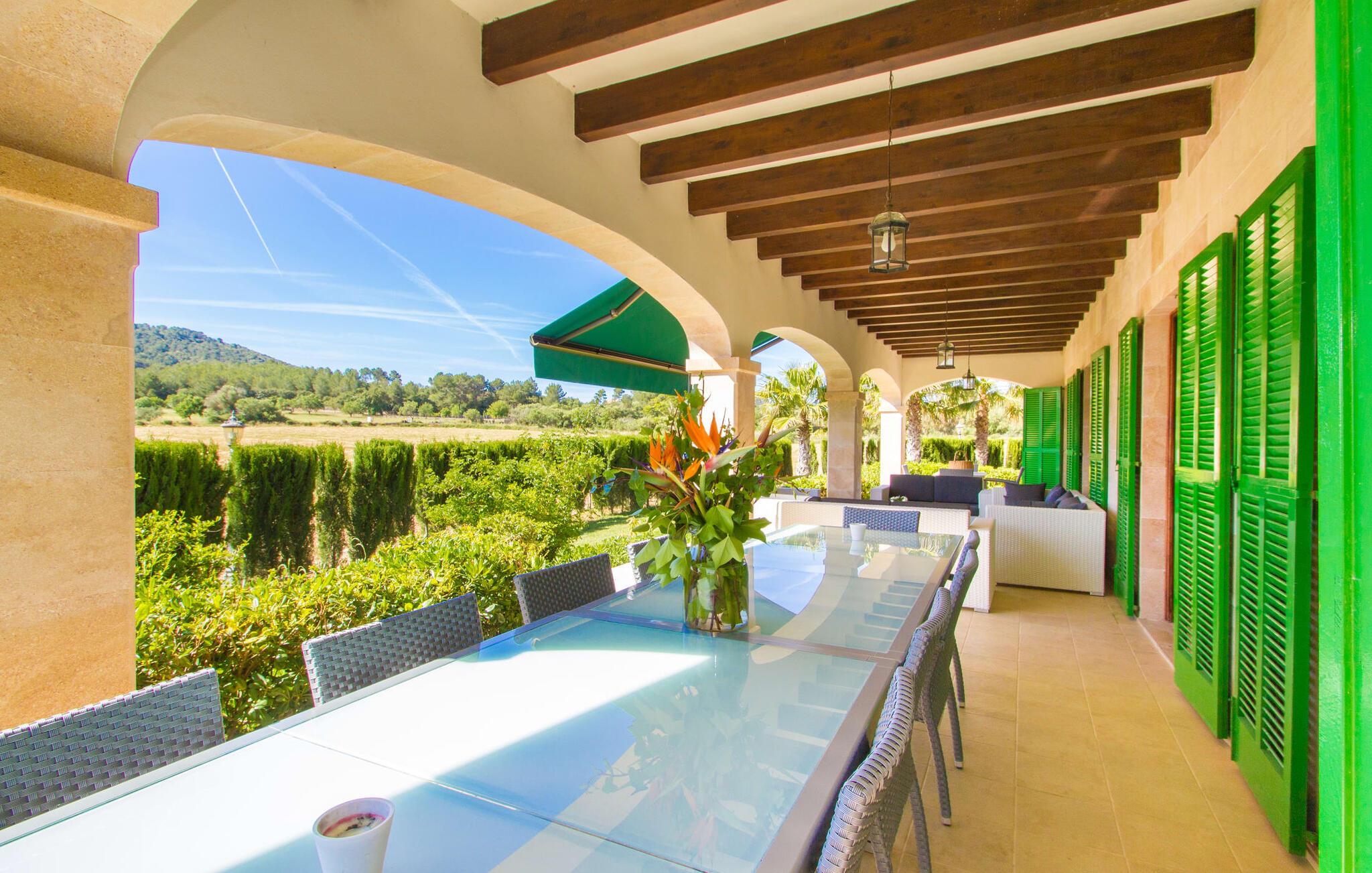 Det helt nybyggede hus er den mallorcanske families seneste erhvervelse. "Palmeral" kombinerer perfekt villaferie med hotelatmosfære. Yderligere oplysninger kan findes nedenfor. Den store omkringliggende ejendom er for nylig blevet omdannet til en pragtfuld have med græsplæner og terrasser samt smuk middelhavslignende landskabspleje. Dette er et fantastisk legeområde for børn, der er potentielle medrejsende. Stien, der fører til villaen, er, i overensstemmelse med navnet, omkranset af palmer. Rundt om huset finder I attraktive siddepladser i sol og skygge, så I kan opdage mange potentielle yndlingssteder. Havens hjerte er poolområdet med to pools og den tilstødende solterrasse. I den store pool kan I svømme hele dagen lang, mens de små kan lege trygt i den lave pool. I kan slappe af på liggestolene af høj kvalitet og nyde en forfriskende dukkert, når I har lyst. Den overdækkede terrasse er forbundet med poolområdet, og de to borde har komfortabel plads til op til 16 personer. Her kan I holde en stor og lækker grillfest på en varm aften, hvilket helt sikkert bliver højdepunktet på enhver ferie. Måske har I købt nogle friske lokale ingredienser på det ugentlige marked i Sineu, som nu bliver tilberedt. Det perspektiv, man kan nyde herfra, er simpelthen storslået.