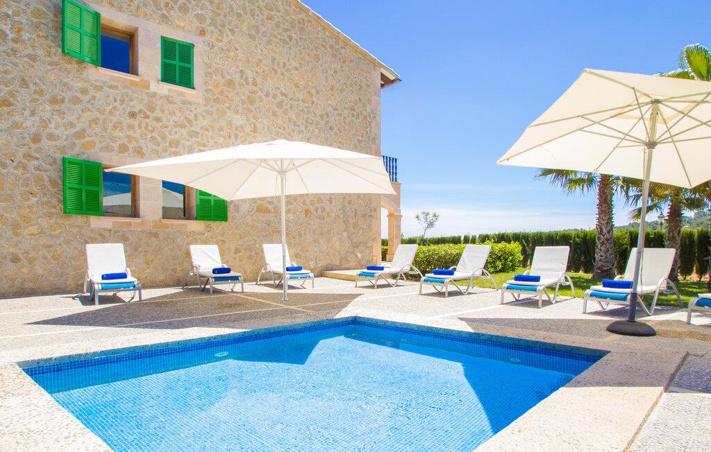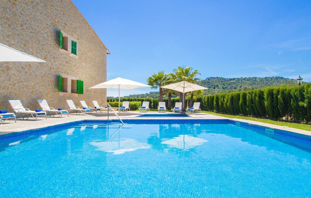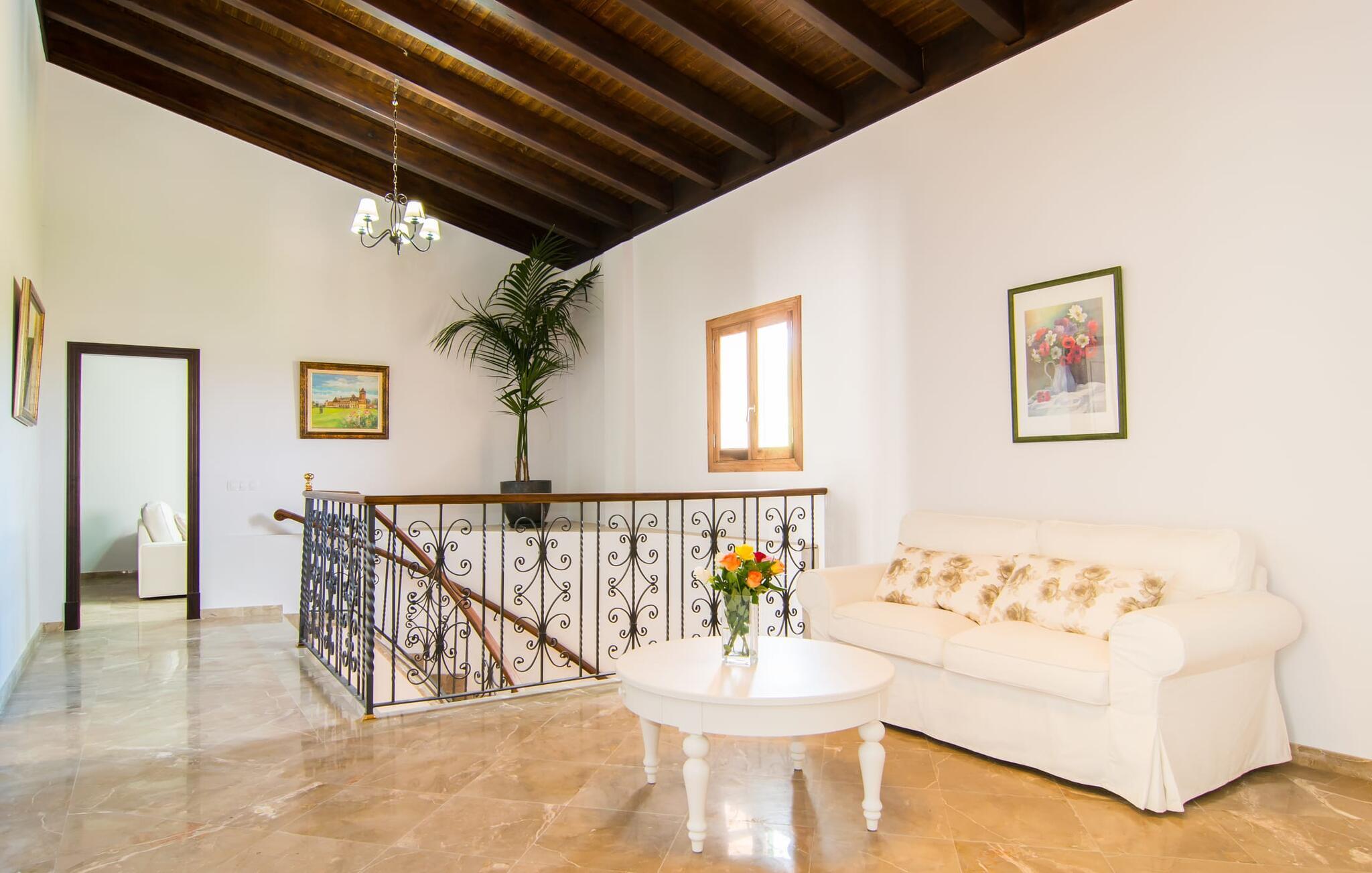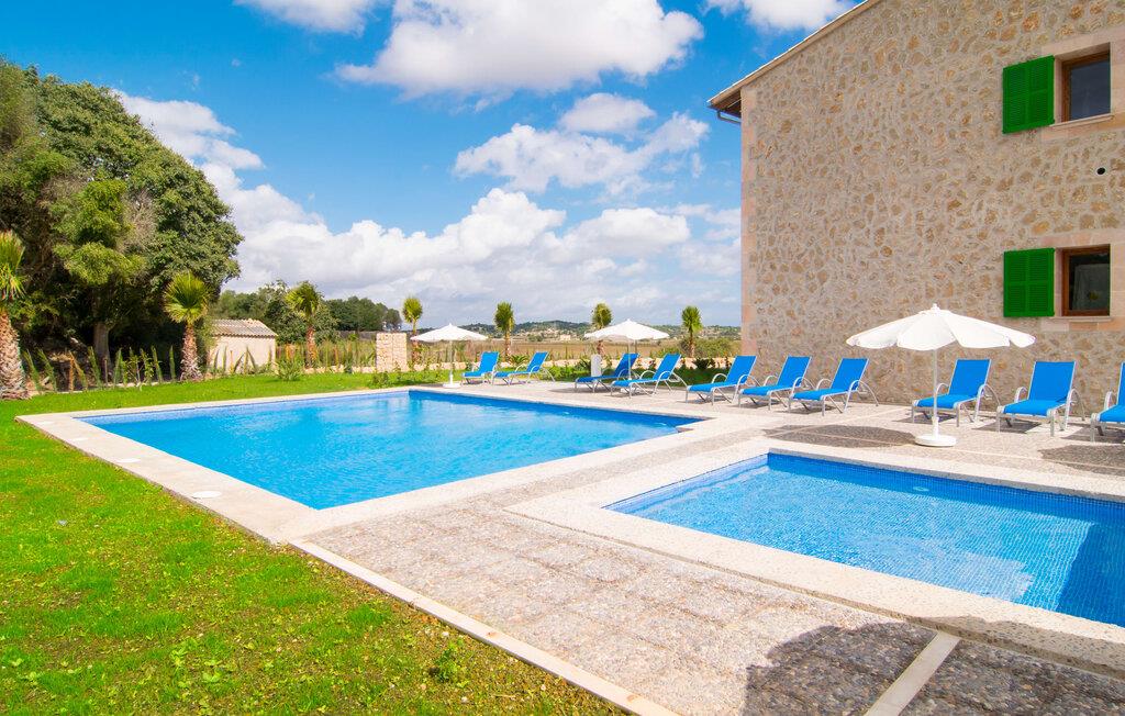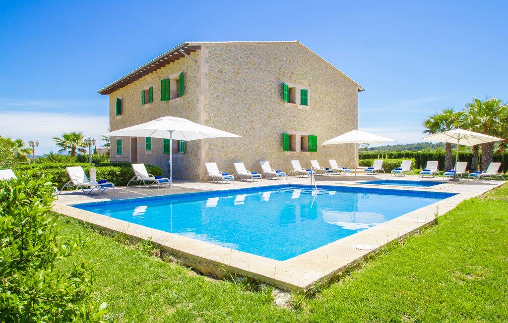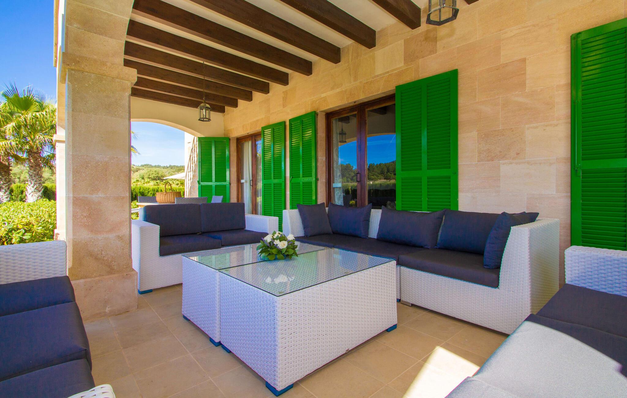 Det helt nybyggede hus er den mallorcanske families seneste erhvervelse. "Palmeral" kombinerer perfekt villaferie med hotelatmosfære. Yderligere oplysninger kan findes nedenfor. Den store omkringliggende ejendom er for nylig blevet omdannet til en pragtfuld have med græsplæner og terrasser samt smuk middelhavslignende landskabspleje. Dette er et fantastisk legeområde for børn, der er potentielle medrejsende. Stien, der fører til villaen, er, i overensstemmelse med navnet, omkranset af palmer. Rundt om huset finder I attraktive siddepladser i sol og skygge, så I kan opdage mange potentielle yndlingssteder. Havens hjerte er poolområdet med to pools og den tilstødende solterrasse. I den store pool kan I svømme hele dagen lang, mens de små kan lege trygt i den lave pool. I kan slappe af på liggestolene af høj kvalitet og nyde en forfriskende dukkert, når I har lyst. Den overdækkede terrasse er forbundet med poolområdet, og de to borde har komfortabel plads til op til 16 personer. Her kan I holde en stor og lækker grillfest på en varm aften, hvilket helt sikkert bliver højdepunktet på enhver ferie. Måske har I købt nogle friske lokale ingredienser på det ugentlige marked i Sineu, som nu bliver tilberedt. Det perspektiv, man kan nyde herfra, er simpelthen storslået.