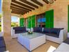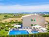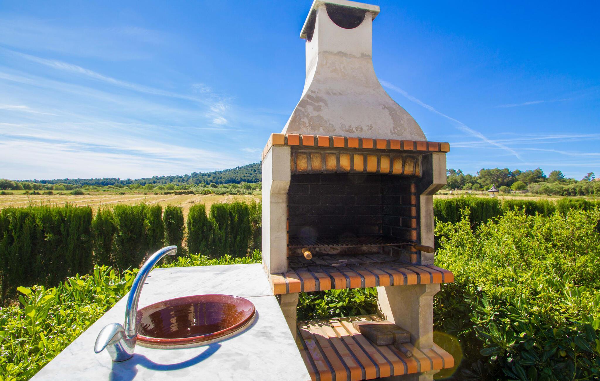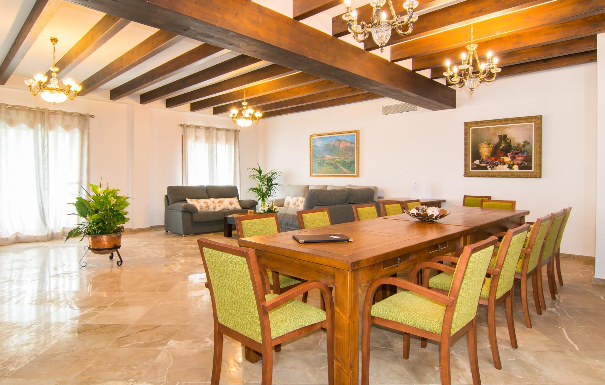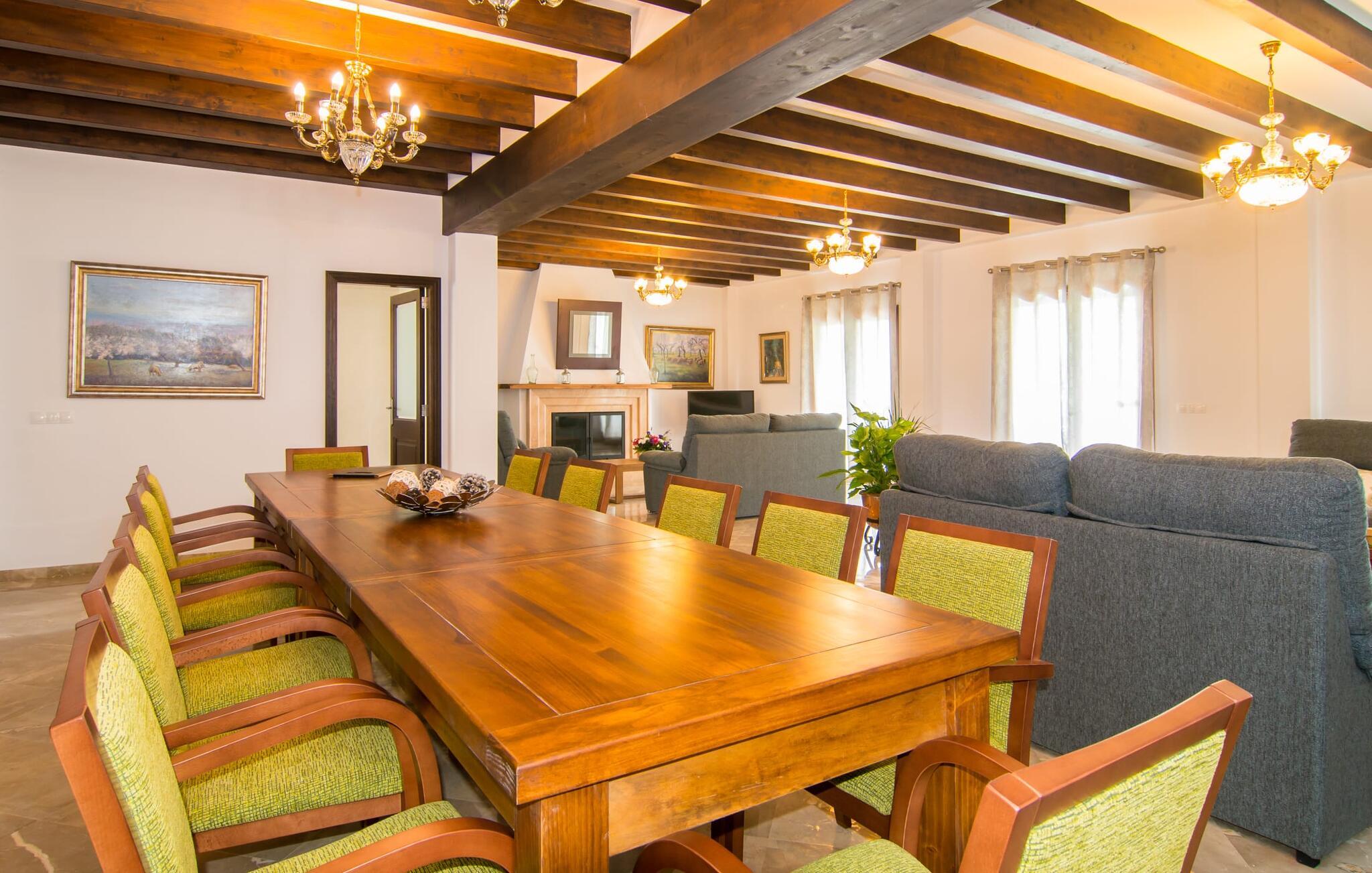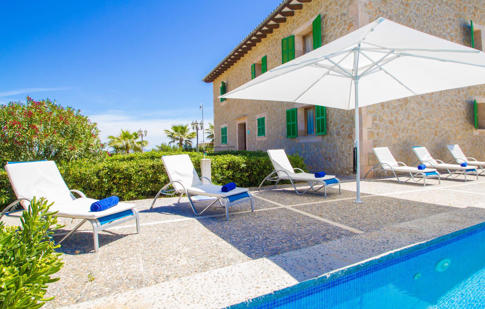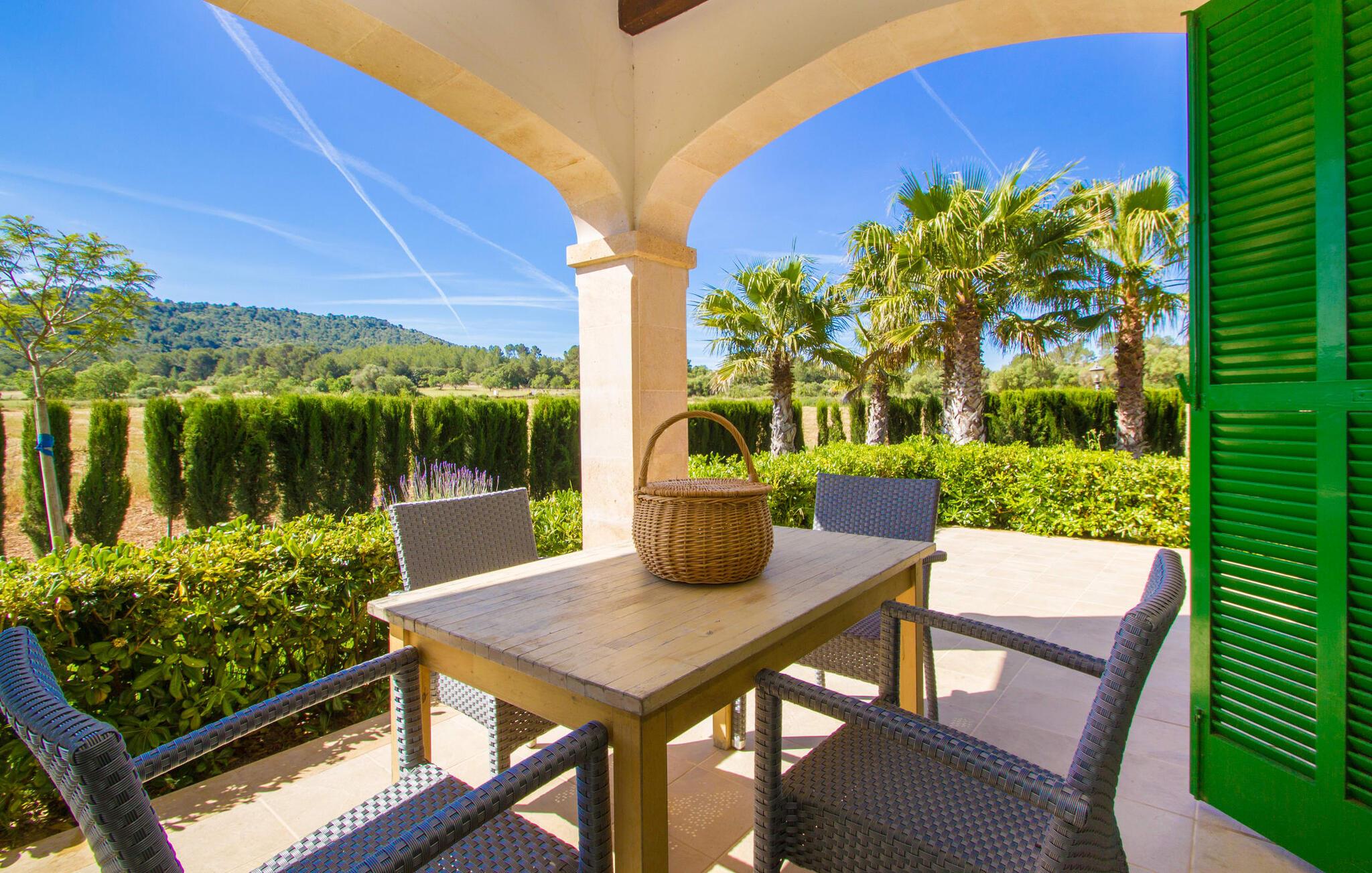 Det helt nybyggede hus er den mallorcanske families seneste erhvervelse. "Palmeral" kombinerer perfekt villaferie med hotelatmosfære. Yderligere oplysninger kan findes nedenfor. Den store omkringliggende ejendom er for nylig blevet omdannet til en pragtfuld have med græsplæner og terrasser samt smuk middelhavslignende landskabspleje. Dette er et fantastisk legeområde for børn, der er potentielle medrejsende. Stien, der fører til villaen, er, i overensstemmelse med navnet, omkranset af palmer. Rundt om huset finder I attraktive siddepladser i sol og skygge, så I kan opdage mange potentielle yndlingssteder. Havens hjerte er poolområdet med to pools og den tilstødende solterrasse. I den store pool kan I svømme hele dagen lang, mens de små kan lege trygt i den lave pool. I kan slappe af på liggestolene af høj kvalitet og nyde en forfriskende dukkert, når I har lyst. Den overdækkede terrasse er forbundet med poolområdet, og de to borde har komfortabel plads til op til 16 personer. Her kan I holde en stor og lækker grillfest på en varm aften, hvilket helt sikkert bliver højdepunktet på enhver ferie. Måske har I købt nogle friske lokale ingredienser på det ugentlige marked i Sineu, som nu bliver tilberedt. Det perspektiv, man kan nyde herfra, er simpelthen storslået.