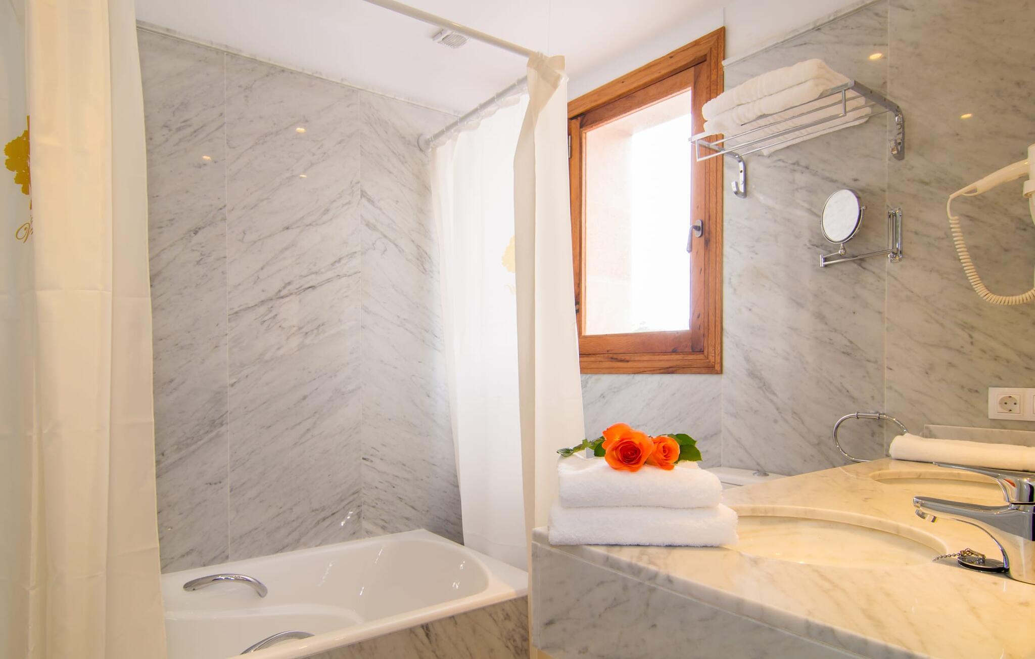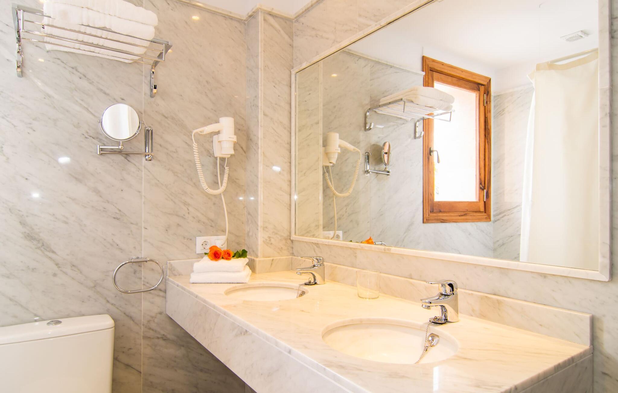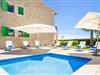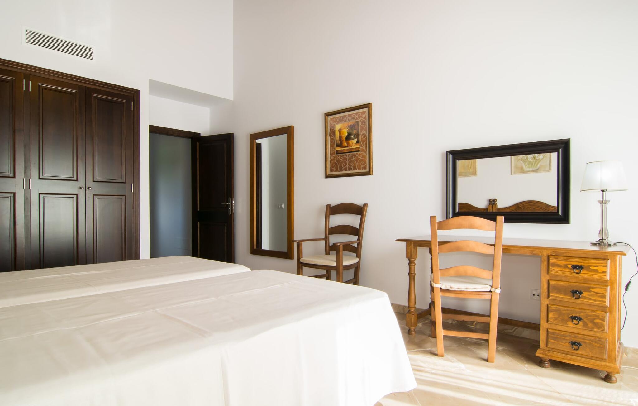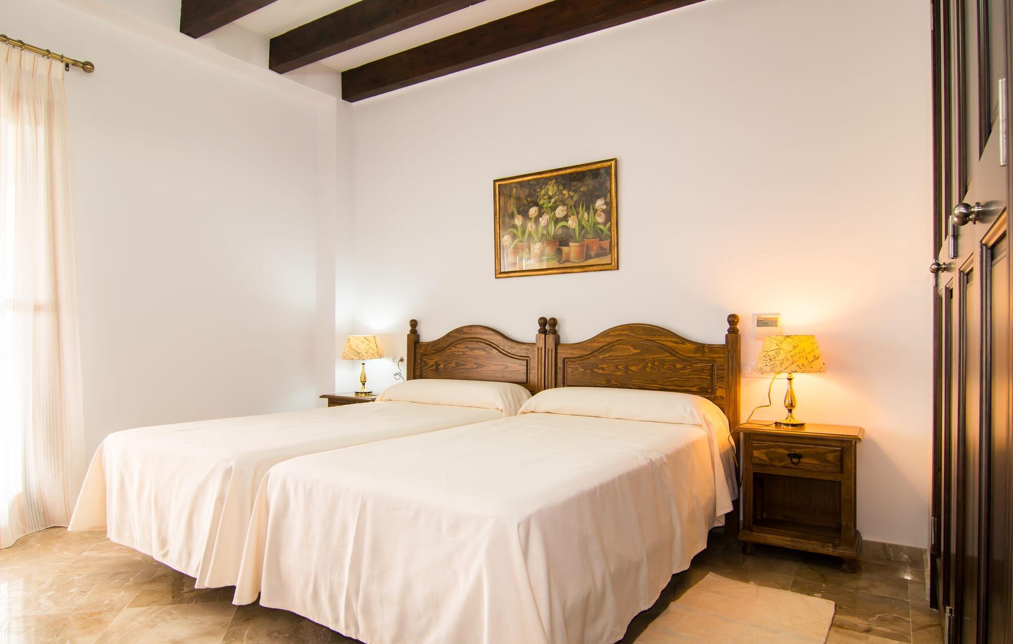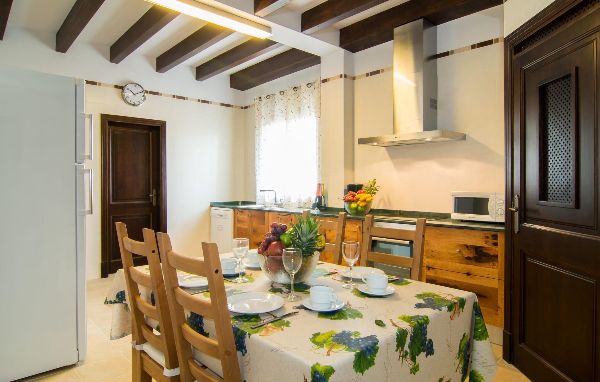 Det helt nybyggede hus er den mallorcanske families seneste erhvervelse. "Palmeral" kombinerer perfekt villaferie med hotelatmosfære. Yderligere oplysninger kan findes nedenfor. Den store omkringliggende ejendom er for nylig blevet omdannet til en pragtfuld have med græsplæner og terrasser samt smuk middelhavslignende landskabspleje. Dette er et fantastisk legeområde for børn, der er potentielle medrejsende. Stien, der fører til villaen, er, i overensstemmelse med navnet, omkranset af palmer. Rundt om huset finder I attraktive siddepladser i sol og skygge, så I kan opdage mange potentielle yndlingssteder. Havens hjerte er poolområdet med to pools og den tilstødende solterrasse. I den store pool kan I svømme hele dagen lang, mens de små kan lege trygt i den lave pool. I kan slappe af på liggestolene af høj kvalitet og nyde en forfriskende dukkert, når I har lyst. Den overdækkede terrasse er forbundet med poolområdet, og de to borde har komfortabel plads til op til 16 personer. Her kan I holde en stor og lækker grillfest på en varm aften, hvilket helt sikkert bliver højdepunktet på enhver ferie. Måske har I købt nogle friske lokale ingredienser på det ugentlige marked i Sineu, som nu bliver tilberedt. Det perspektiv, man kan nyde herfra, er simpelthen storslået.