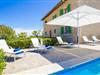 I kan opholde jer diskret og uforstyrret i små eller store grupper i hele opholdsområdet i denne moderne, rummelige villa. Når I træder ind i huset, bliver I mødt af enestående æstetik og en atmosfære af luksuriøs livsstil. Udvalgte, unikke elementer og materialer af høj kvalitet overrasker i en usædvanlig harmonisk og sofistikeret kombination. En meget rummelig stue/spisestue tilbyder et stort spisebord til 12 personer samt to komfortable sofagrupper, hvor I virkelig kan føle jer hjemme. I den ene side af stuen er der en brændeovn og et fladskærms-tv med satellitforbindelse: intet står i vejen for hyggelige aftener ved brændeovnen og underholdende tv-programmer. Det moderne og venlige køkken er fuldt udstyret. Udover køleskab, ovn, keramisk kogeplade, opvaskemaskine og mikrobølgeovn indbyder det rummelige køkken til at nyde madlavningen sammen om aftenen. Her har I også mulighed for at spise sammen med fire til seks personer. Soveværelserne er rummelige, udstyret med møbler af høj kvalitet og stilfulde. Her, som i de fleste andre rum, finder vi træbjælker i loftet, som ikke kun ser stilfulde ud, men også skaber en meget attraktiv samlet atmosfære. Fraværet af mange distraherende tilbehør giver disse smukke rum et ligefremt udseende, som utvivlsomt har til formål at opfordre en til at søge behagelig fred og ro. Alle seks dobbeltværelser har egne badeværelser og en femstjernet hotelatmosfære af høj kvalitet. Det smagfulde design af marmorbadeværelserne fortsætter med at overraske. Disse er præsenteret i en meget moderne stil og er funktionelle og yderst komfortable.