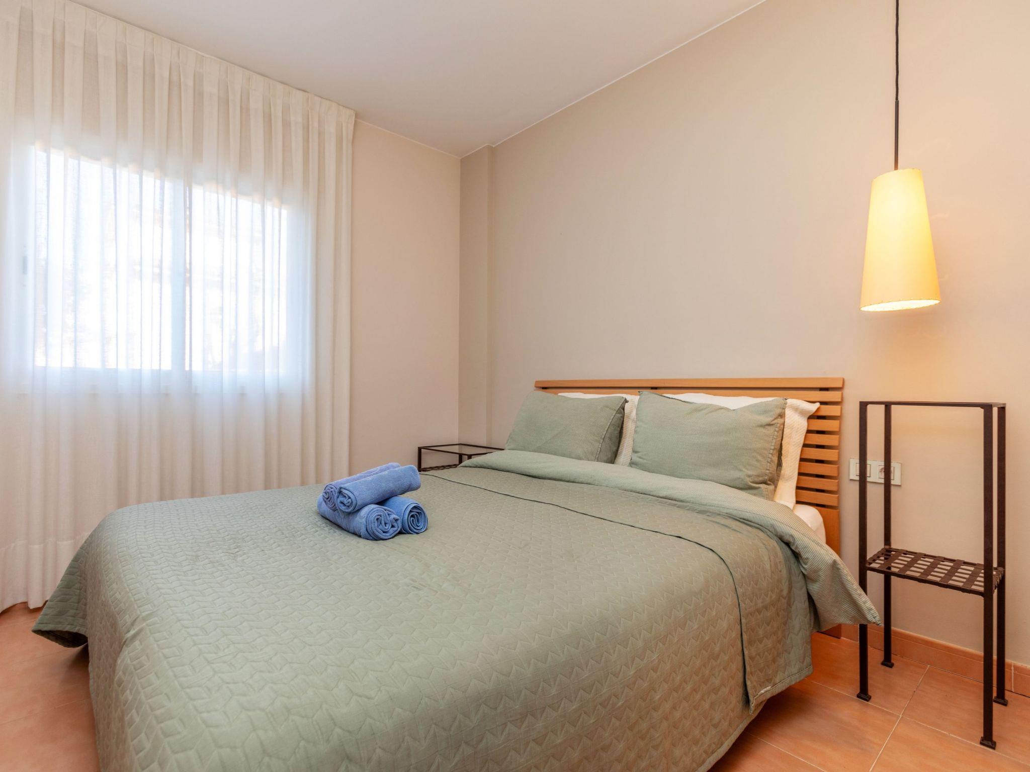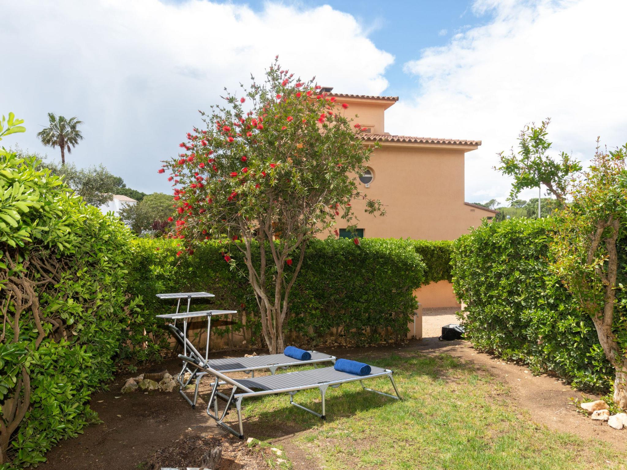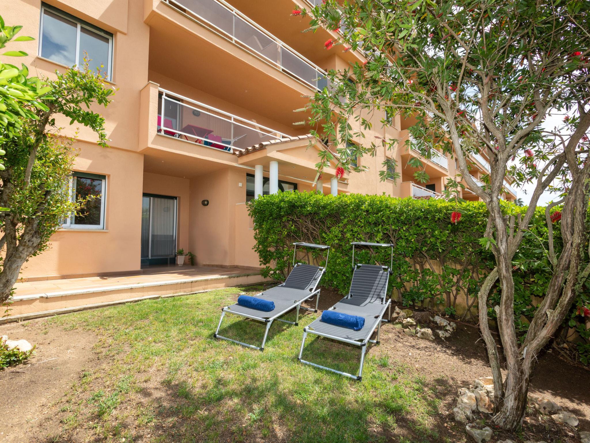 "Port Pals Garden & terrace", 3-room apartment 90 m2, on the ground floor. Practical furnishings: living/dining room with digital TV, air conditioning and forced-air heating. Exit to the patio. 1 room with 1 french bed (180 cm, length 200 cm), bath/WC, air conditioning and forced-air heating. 1 room with 1 x 2 bunk beds (90 cm, length 190 cm), air conditioning and forced-air heating. Exit to the patio. Open kitchen (oven, dishwasher, 4 ceramic glass hob hotplates, toaster, kettle, microwave, freezer, grill, electric coffee machine). Bath/WC. No heating option. Patio. Terrace furniture, deck chairs (2), covered balcony. Partial distant view of the sea and the countryside. Facilities: washing machine, iron, children's high chair, baby cot, hair dryer. Internet (WiFi, free). Garage. Please note: suitable for families. TV only ES. HUTG-075105 // Reg. Nr.: ESFCTU00001700700018979700000000000000000HUTG-0751059