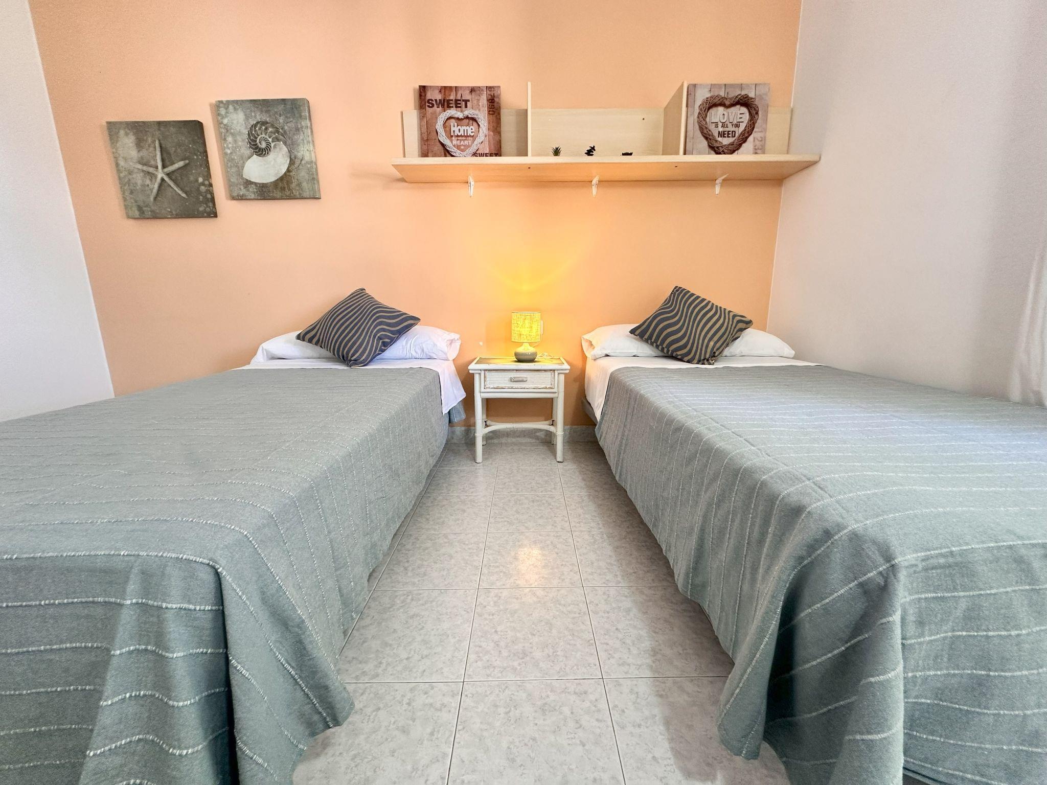 "Nautic Golf C III", 3-room apartment 65 m2. Practical furnishings: living/dining room with dining table and digital TV. Exit to the terrace. 1 room with 1 french bed (145 cm, length 190 cm). 1 room with 1 pull-out bed (2 pers. 2 x 90 cm, length 190 cm). Open kitchen (oven, dishwasher, 3 ceramic glass hob hotplates, microwave). Bath/WC. Boiler (100 litres). No heating option. Terrace. Terrace furniture. View of the swimming pool. Facilities: washing machine, iron, children's high chair, baby cot, hair dryer. Internet (WiFi, free). Parking space n C301 Exterior. Please note: TV only ES. TV smart. HUTG-003334 // Reg. Nr.: ESFCTU00001700700014510600000000000000000HUTG-0033342