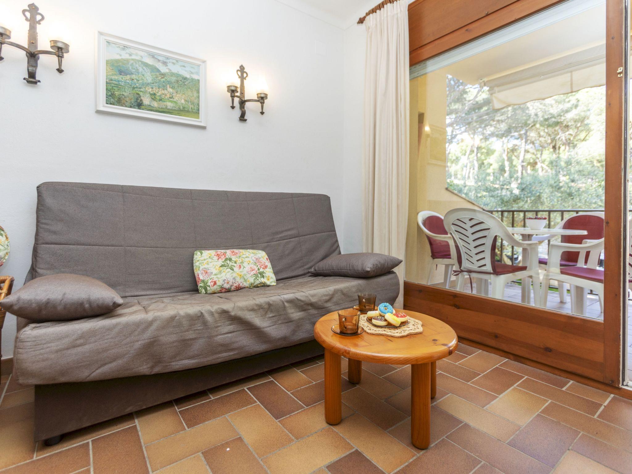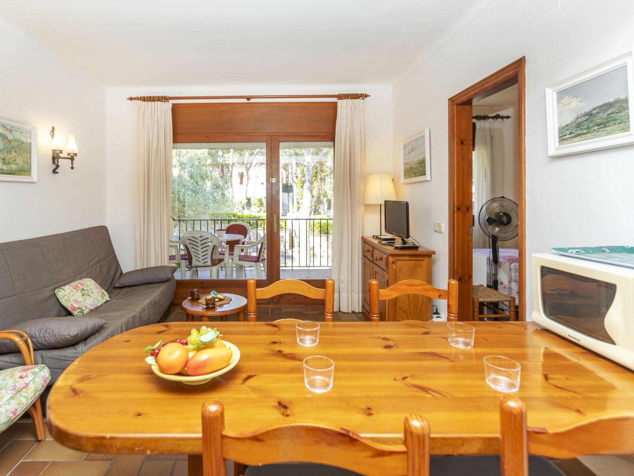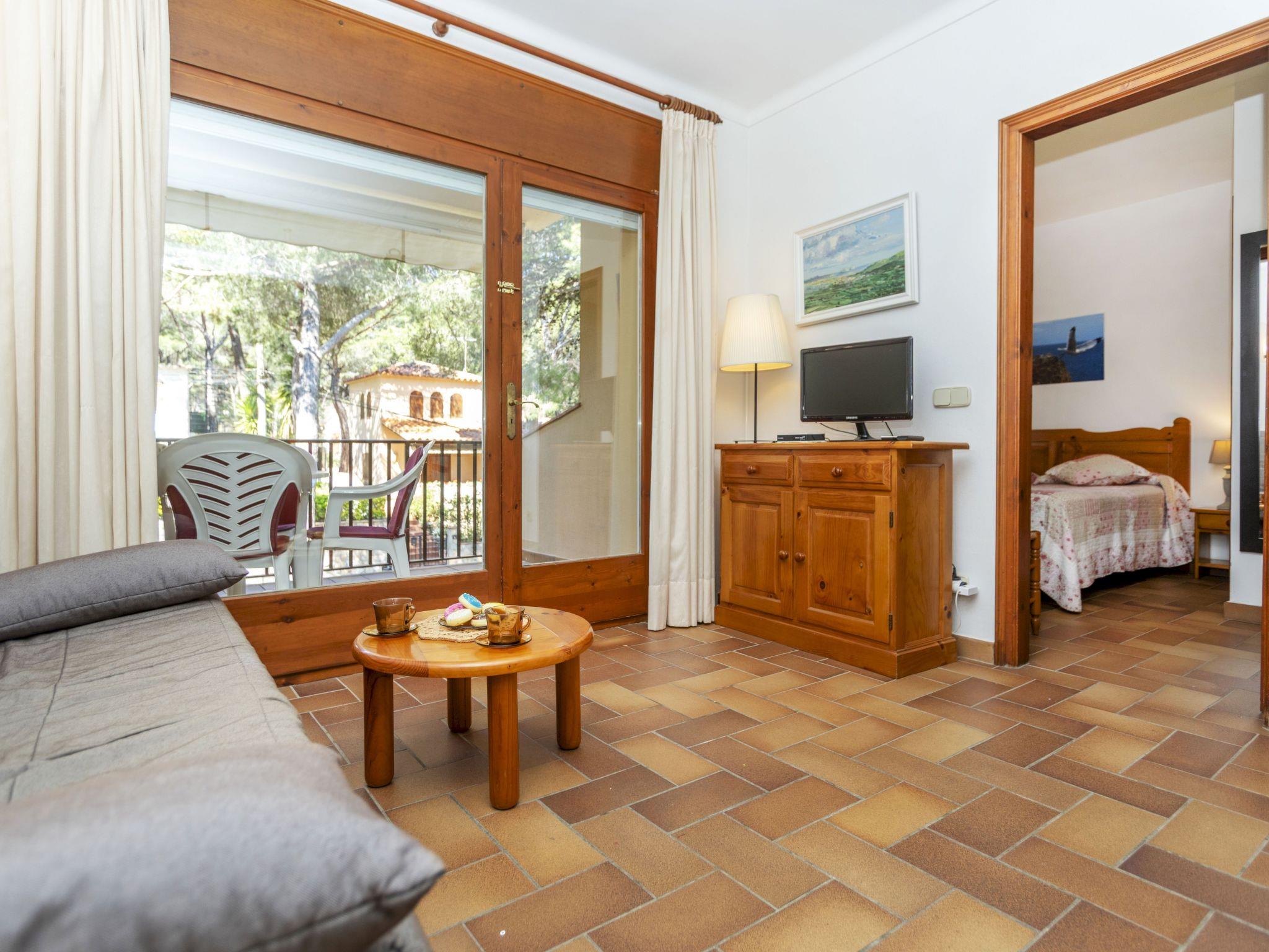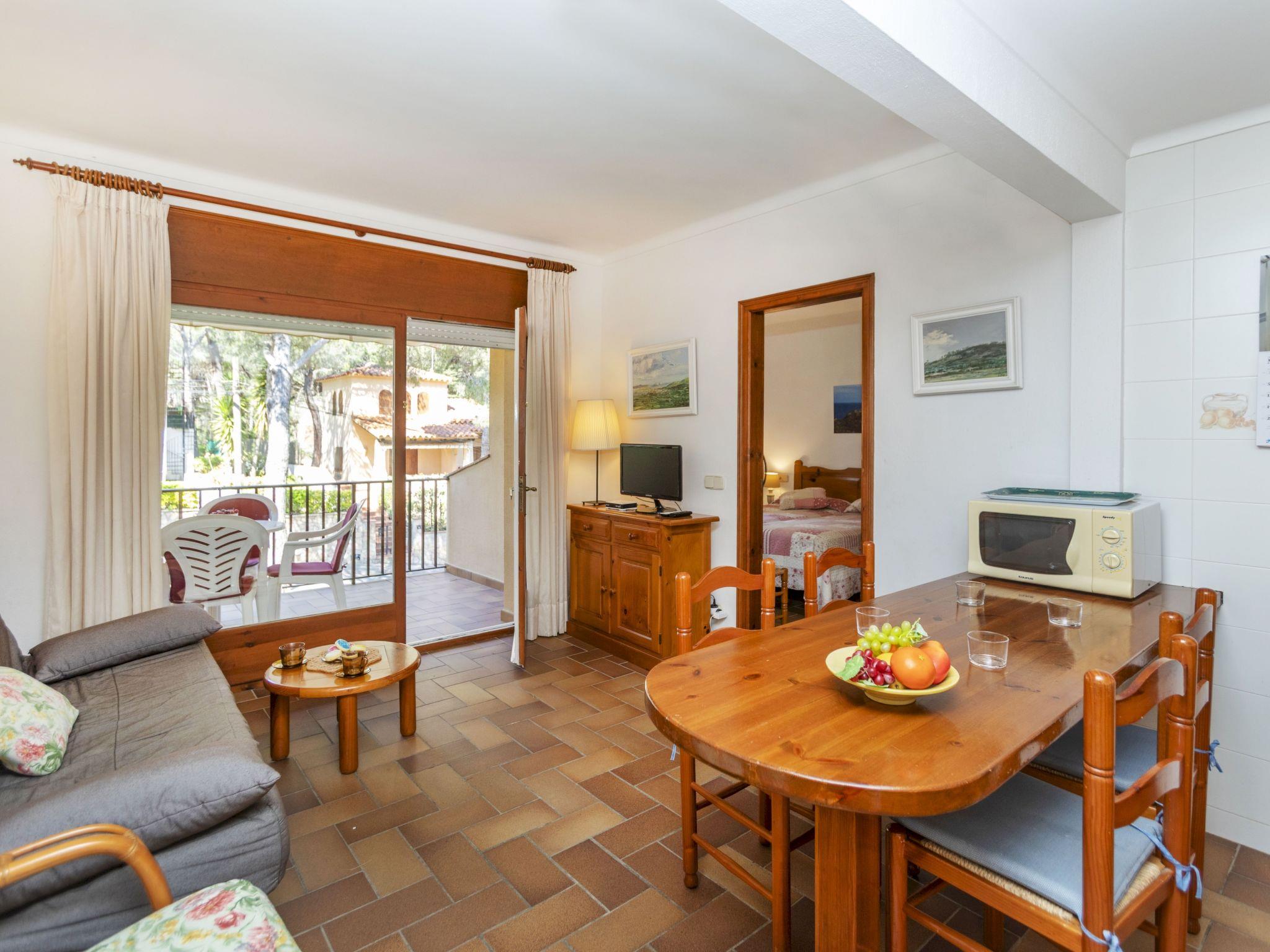 "Melis II M4 Playa de Pals", 2-room apartment 40 m2 on 1st floor. Practical and cosy furnishings: living/dining room with 1 sofabed (135 cm, length 190 cm), satellite TV, flat screen, electric heater and fan. Exit to the terrace. 1 room with 2 beds (80 cm, length 190 cm), shower/WC and electric heater. Open kitchen (4 ceramic glass hob hotplates, toaster, kettle, electric coffee machine, combination microwave). Terrace 6 m2. Terrace furniture. View of the garden. Facilities: safe, iron, children's high chair, baby cot for up to 2 year olds, hair dryer. Internet (WiFi, free). Parking. Please note: non-smokers only. TV only ES, DE, FR. Fire extinguisher, no lift. HUTG-001768 // Reg. Nr.: ESFCTU00001700700002183700000000000000000HUTG-0017681