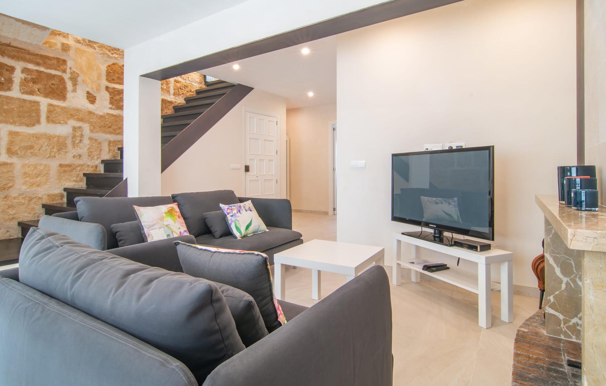 Herfra kan I gøre næsten alt til fods - det smarte feriehus "Pare Vives" i Pollença er simpelthen perfekt til en afslappende ferie på Mallorca. Især hvis I ikke vil køre rundt i en lejebil, hver gang I skal shoppe eller gå på restaurant. Takket være den centrale beliggenhed er I praktisk talt midt i ø-livet - men I kan også til enhver tid trække jer tilbage til jeres egne private fire vægge. I dette tilfælde vil I ikke gå glip af noget: Det meget veludstyrede feriehus byder på næsten al den komfort, I kan ønske jer under jeres ferie på Mallorca. Et særligt højdepunkt er den smukke tagterrasse. Derfra har I ikke kun en vidunderlig udsigt over de tilstødende tage af landsbyen. I kan også nyde solen, forfriske jer i den interne minipool og så spise sammen ved det store bord, hvad I har tilberedt på grillen og i det lille, men hyggelige udekøkken. “Pare Vives” imponerer over hele linjen – også med hensyn til indretningen. Dette smukke feriehus er designet med stor smag og sans for detaljer. Den vellykkede blanding af gammelt og moderne udstråler en behagelig hjemlig lethed, hvor I straks kan føle jer hjemme og godt tilpas. Takket være de mange vinduer, lyse farver og smart placeret loftsbelysning, er der pænt lyst overalt Ind i mellem finder I rustikke naturstensvægge, der giver huset et typisk mallorcansk præg. I stueetagen finder I den hyggelige opholds- og spisestue, hvor I kan samles om den hyggelige pejs. Det åbne køkken ligger kun få skridt væk - så der er ingen lange gåture fra komfuret til bordet med fuld bakke. To soveværelser med dobbeltsenge og to badeværelser, hvoraf det ene har eget badeværelse, fuldender boligarealet på denne etage. Et andet smukt soveværelse med dobbeltseng kan nås via den stilfulde åbne trappe. I Pollença, på den nordlige del af øen, finder I det smarte rækkehus "Pare Vives" - en fremragende udstyret perle med en fremragende beliggenhed. Fra tagterrassen med et smukt udekøkken og lille pool kan I nyde udsigten over byens tage - og jeres privatliv på samme tid. Huset ligger centralt på en akustisk mærkbar gade afhængig af vindretningen, så I nemt kan slentre gennem byen, shoppe og besøge restauranter til fods. Den nærmeste strand, Platja de Port de Pollença, ligger lidt over 6 km væk, og I kan parkere jeres lejebil i den private garage.