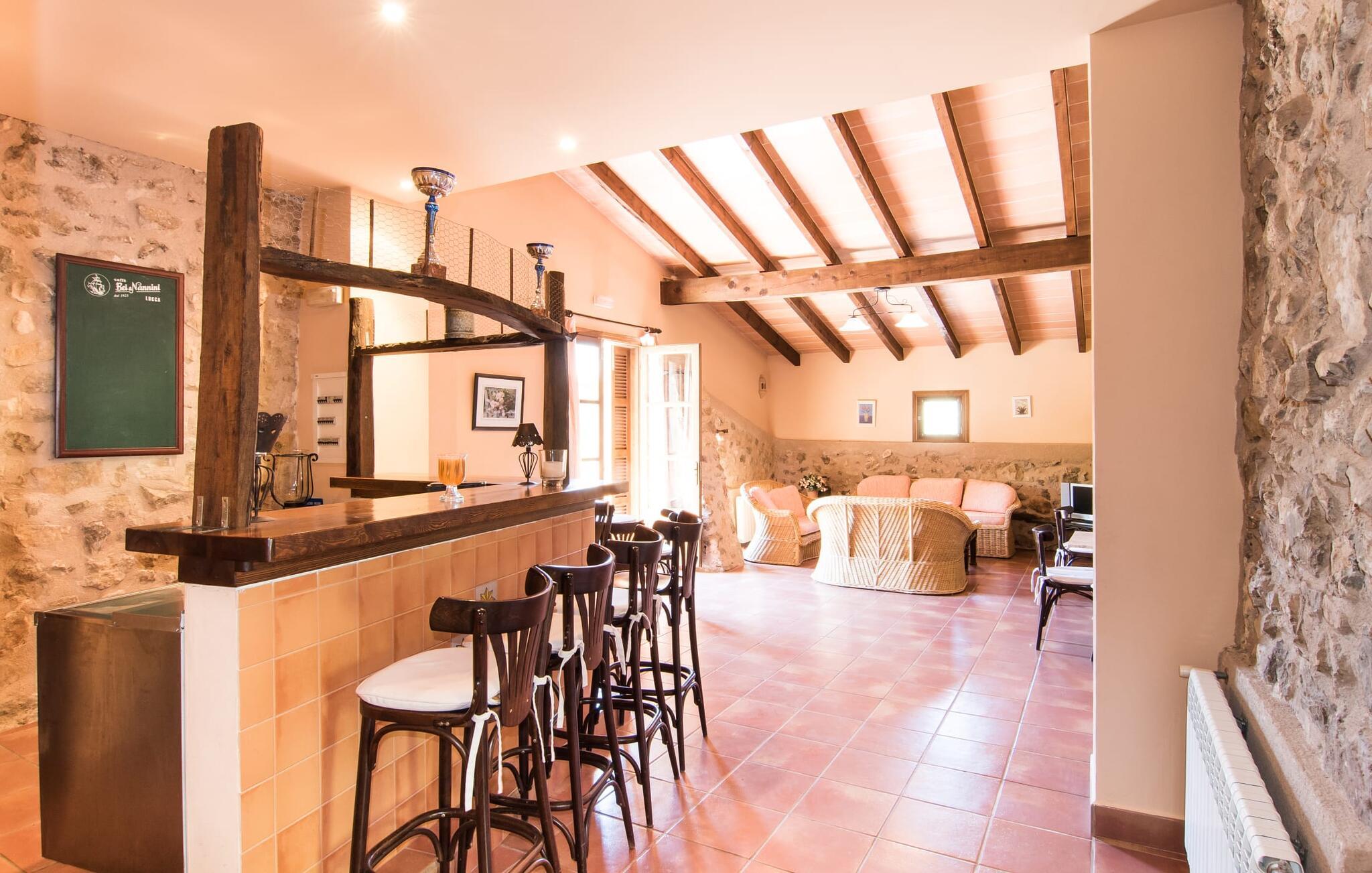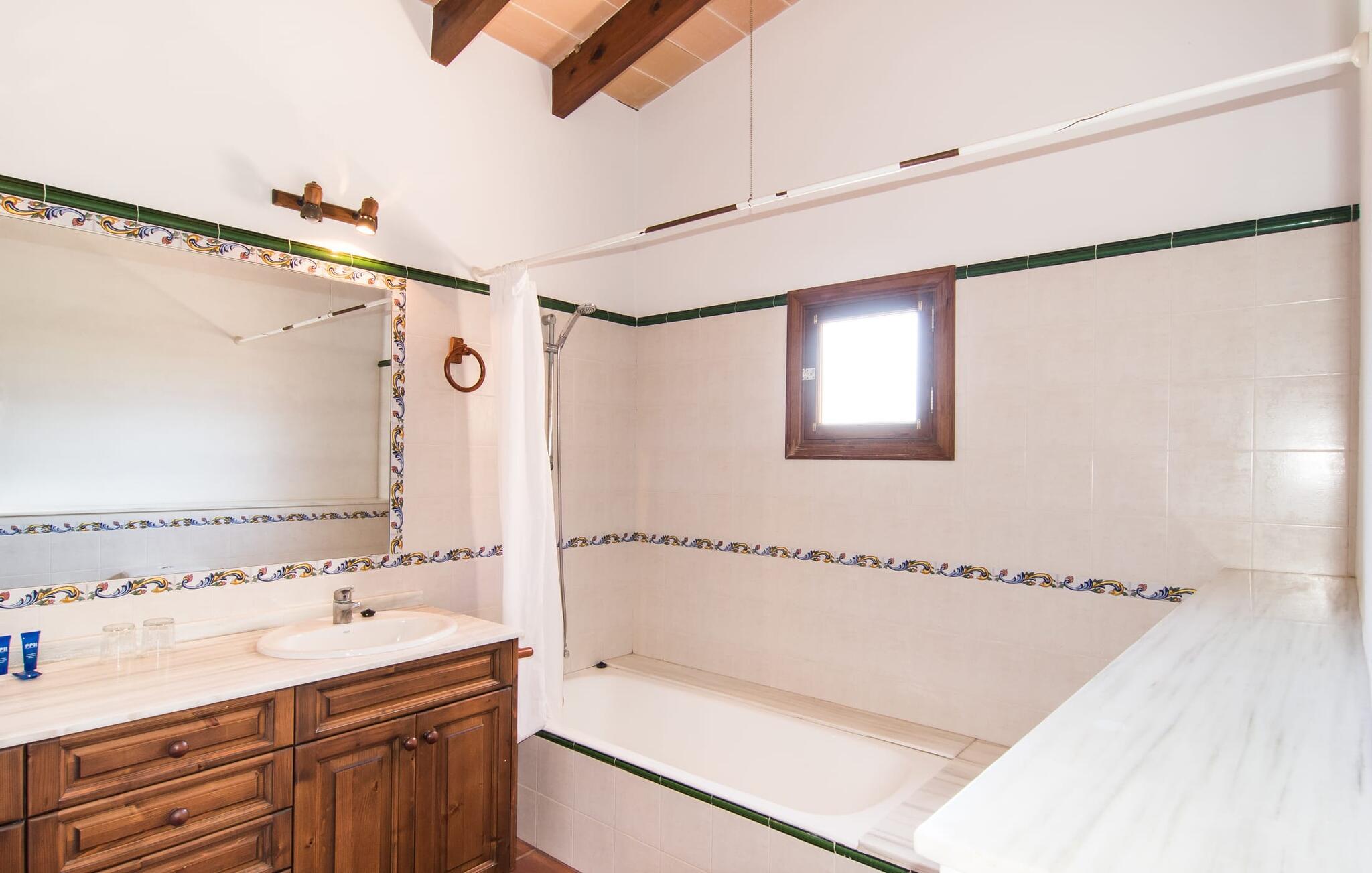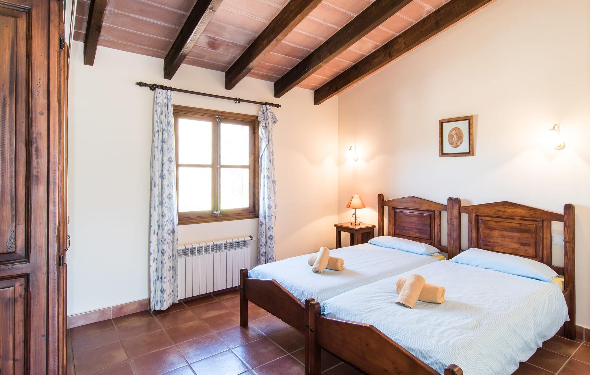 Blomster og grønt så langt øjet rækker - det rene paradis i en vidunderlig afsondret landlig beliggenhed og alligevel tæt på byen og havet - "Parreta", denne enorme ejendom, i en nøddeskal. Landhuskonceptet blev implementeret her på en utraditionel måde, da de ovennævnte 700 m² boligareal er fordelt mellem hovedbygningen og etageejendommene. Husene er forbundet af en smuk have fuld af kaktusser, knudrede oliventræer, kæmpe oleandere og andre blomstrende planter. Der er endda en joggingsti, hvor I kan tage en morgenløbetur. Den enorme fælles pool med et forarbejdet mosaikgulv har sporty dimensioner med banelængder på 16 m. Efter svømning kan I slappe af på en af liggestolene på solterrassen omkring poolen. Et smart fortelt med parasoller skaber et skyggefuldt sted for enden af poolen, et hyggeligt sted til glade bræt- eller kortspil. Der er et væld af siddepladser, som er smukt afsondret og private, men også nogle fællesarealer. Det er især rart, hvis I kan bruge et stort udendørs opholdsområde, især til større grupper. Denne ligger lige bag ved huset nær den murede grill, hvor I kan lave mad, spise og drikke sammen, mens I nyder det skønne vejr i en afslappet atmosfære. Når I rejser med en større gruppe, f.eks. en sportsklub, en større gruppe venner eller familie til en særlig lejlighed: Dette er det perfekte sted at tilbyde masser af plads og samtidig bevare en masse privatliv. Villa "Parreta" er perfekt designet til at rumme et så stort antal gæster. Huset er en god blanding af en klassisk privat villa og et hotel. Dette er dog indkvartering med egen forplejning, og I kan have denne rummelige ejendom helt for jer selv, uden personale eller andre gæster. Klassisk mallorcansk landstedsstil, blandet med enkel gæstfrihed parret med komfort, byder jer velkommen i alle værelser. I hovedhuset er der et perfekt udstyret køkken med alle tænkelige hvidevarer, herunder en opvaskemaskine. Dette bør varme hjerterne hos dem af jer, der laver mad som hobby. Når I ikke spiser udenfor, kan I samles i den overdådige spisestue med synlige bjælkevægge. Tag en drink i baren i loungen før middag, eller nyd en drink efter middagen efter det flerretters måltid, der er tilberedt sammen. En feriefølelse af meget individuel art er garanteret, hvis ferien var planlagt selv. Indkvartering er - og det er et absolut overbevisende træk ved denne sofistikerede og prisvenlige villa - i hovedbygningen eller i en separat bygning. På første sal i den restaurerede stenbrudsbygning er der to suiter bestående af et soveværelse, en stue og et en-suite badeværelse. Det rummelige dobbeltværelse med badeværelse på samme etage er det eneste uden et lille køkken og stue. Lige bag huset er der en fjerde selvforsynende og fuldt udstyret lejlighed. De øvrige fire lejligheder på hver 55 m² boligareal ligger i den aflange bygning lige ved siden af. Hver enhed har sit eget soveværelse, moderne flisebadeværelse og åbent opholds- og køkkenområde. Fra boligen er der direkte adgang til den overdækkede terrasse med bord og to stole - ideel for et øjeblik for to at nyde dette landlige paradis og dets behageligt milde klima fuldt ud. Placeringen af denne monumentale villa er ganske enkelt fascinerende, da Manacor kun ligger 10 minutter væk til en fantastisk gåtur og en butik til for eksempel de berømte mallorcanske perler, der fremstilles her. De omkringliggende byer, herunder den charmerende Son Macià, er nemme at nå på grund af den bekvemme beliggenhed og nærheden til den knapt hørbare landevej. jeres daglige indkøb vil blive gjort der og kan kombineres med en morgen Café Cortado på en lokal cafe. For at svømme, tag til den smukke fiskerlandsby Porto Cristo, hvor I efter en lang dag på stranden med adskillige vandsportsaktiviteter kan slentre langs promenaden om aftenen og få noget at spise på en af de smukke restauranter. Med hensyn til strande er der masser at vælge imellem, med det smukke såkaldte “Calas de Mallorca” kun et stenkast væk. Om aftenen kan I og jeres gruppe afslutte dagen i fred og afslapning med en hyggelig grillaften, indtil alle stjerner står højt på himlen. Den enorme villaejendom "Parreta" ligger i en vidunderlig, afsondret beliggenhed mellem Manacor og det fortryllende østlige kystlandskab. Separate boligenheder med et højt niveau af komfort og hygge er tilgængelige til jeres ferie. For shopping, besøg Son Macia eller Manacor, hvor der er et ugentligt marked om mandagen. Øens smukke strande, hvoraf nogle er rigtige insidertips som Cala Varques, er kun en kort køretur væk.