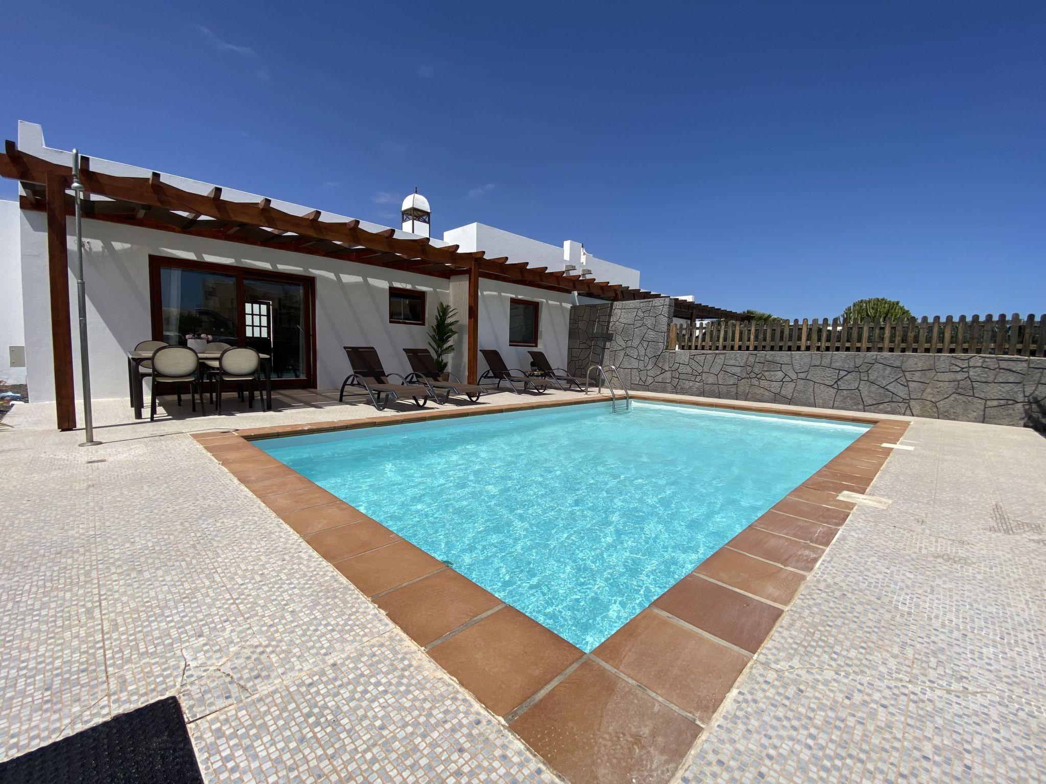 "Villa Capri en Playa Blanca", 3-room villa 65 m2. Object suitable for 2 adults + 2 children. Practical and tasteful furnishings: living room with satellite TV. Exit to the patio, to the swimming pool. 1 room with 1 french bed (160 cm, length 200 cm). 1 room with 2 beds (90 cm, length 190 cm). Kitchen (oven, dishwasher, 4 ceramic glass hob hotplates, toaster, kettle, microwave, freezer, electric coffee machine). Bath/WC, shower/WC. Natural stone floors. Terrace furniture, barbecue, deck chairs (4). Beautiful view of the swimming pool. Facilities: washing machine, dryer, iron, children's high chair, baby cot for up to 2 year olds, hair dryer. Internet (WiFi, free). Parking at the house. Please note: suitable for families. Non-smoking house. VV-35-3-0005249 // Reg. Nr.: ESFCTU0000350190004230810000000000000VV-35-3-00052494
