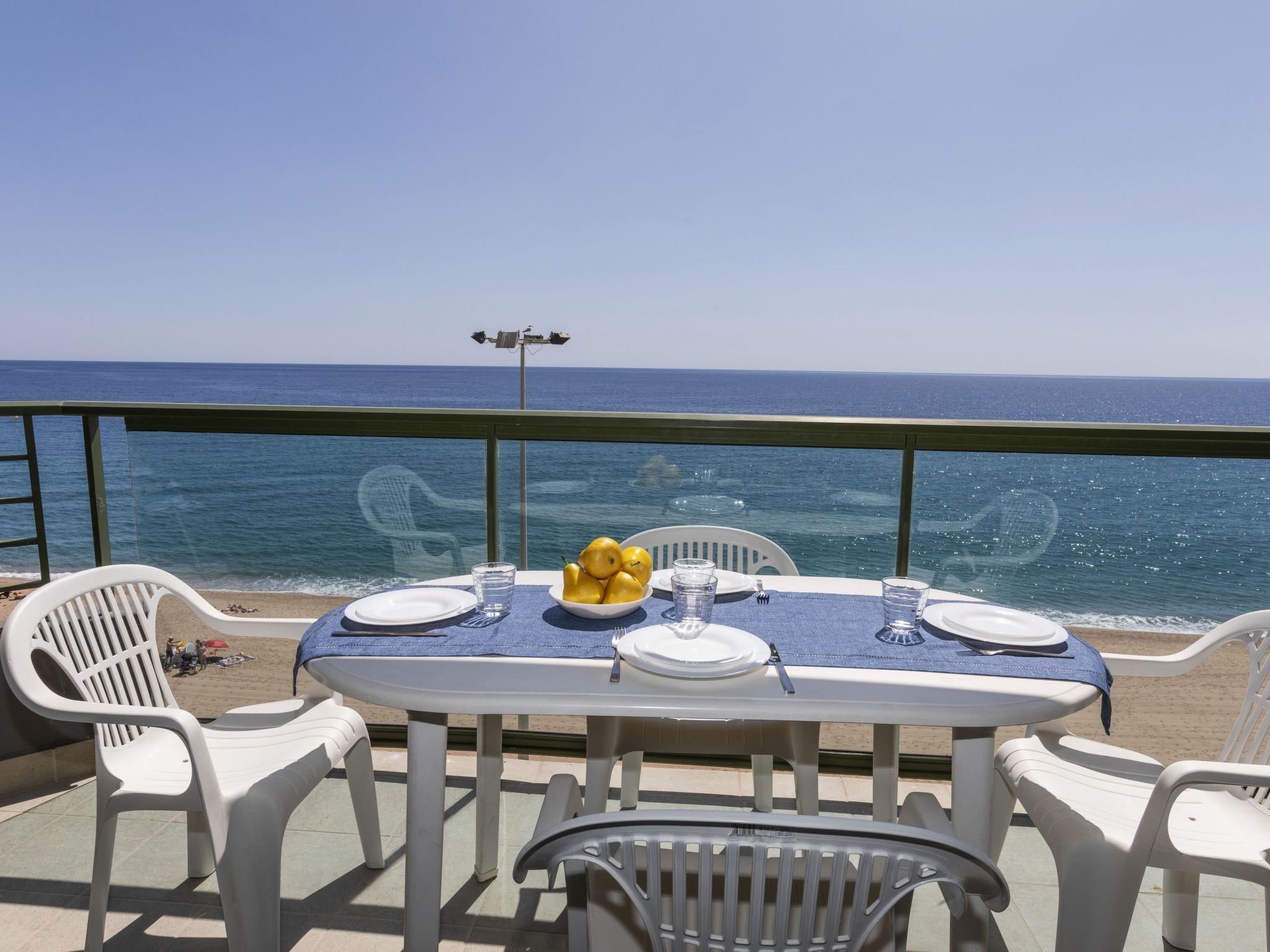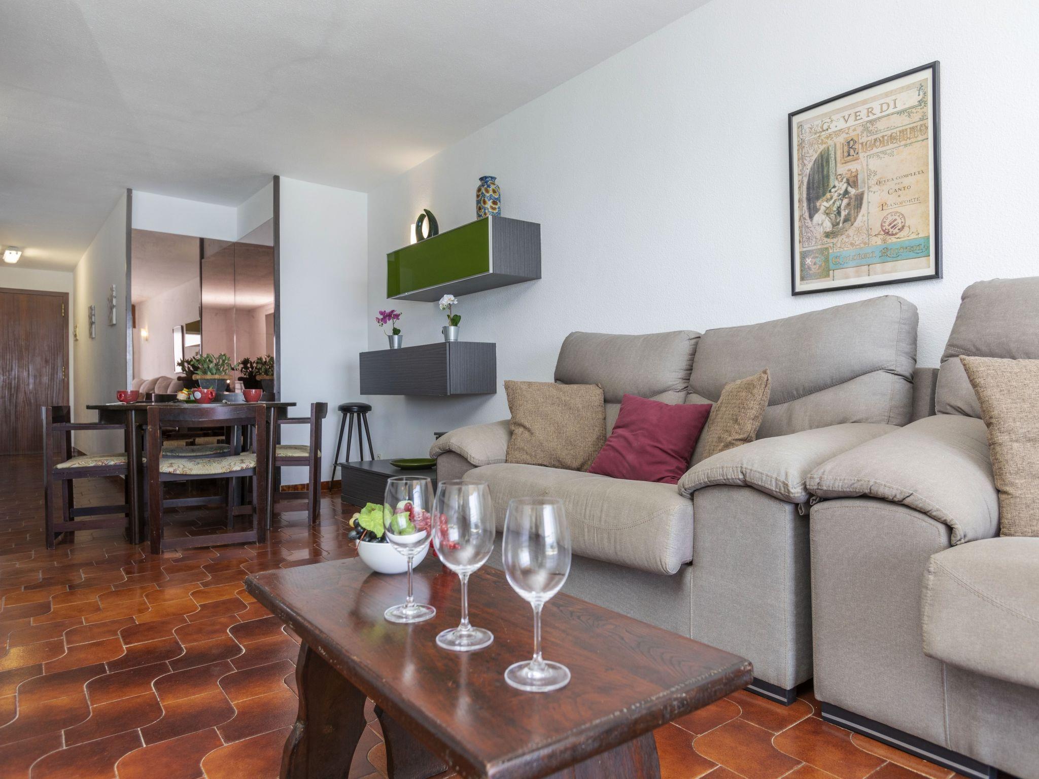 "Verd", 3-room apartment 65 m2 on 5th floor. Practical furnishings: living/dining room with digital TV. Exit to the terrace. 1 room with 1 french bed (150 cm, length 190 cm). Exit to the terrace. 1 room, without window with 1 x 2 bunk beds (90 cm, length 190 cm). Kitchen (oven, 4 ceramic glass hob hotplates, toaster, kettle, microwave, electric coffee machine). Bath/bidet/WC. Heating. Large terrace. Terrace furniture. Marvellous view of the sea. Facilities: washing machine, iron, children's high chair, baby cot, hair dryer. Please note: non-smokers only. TV only ES. HUTG-021249 // Reg. Nr.: ESFCTU00001701700010798100000000000000000HUTG-0212495