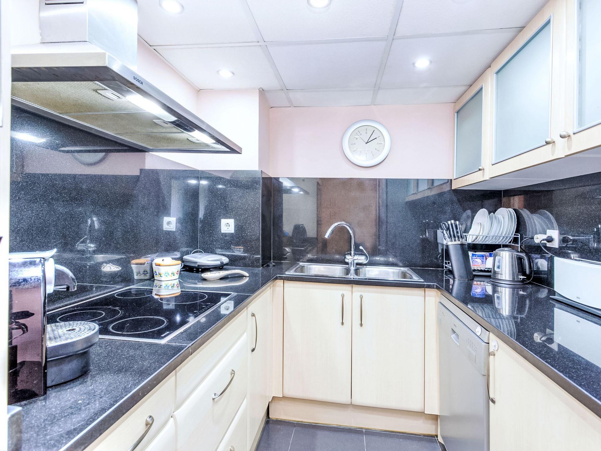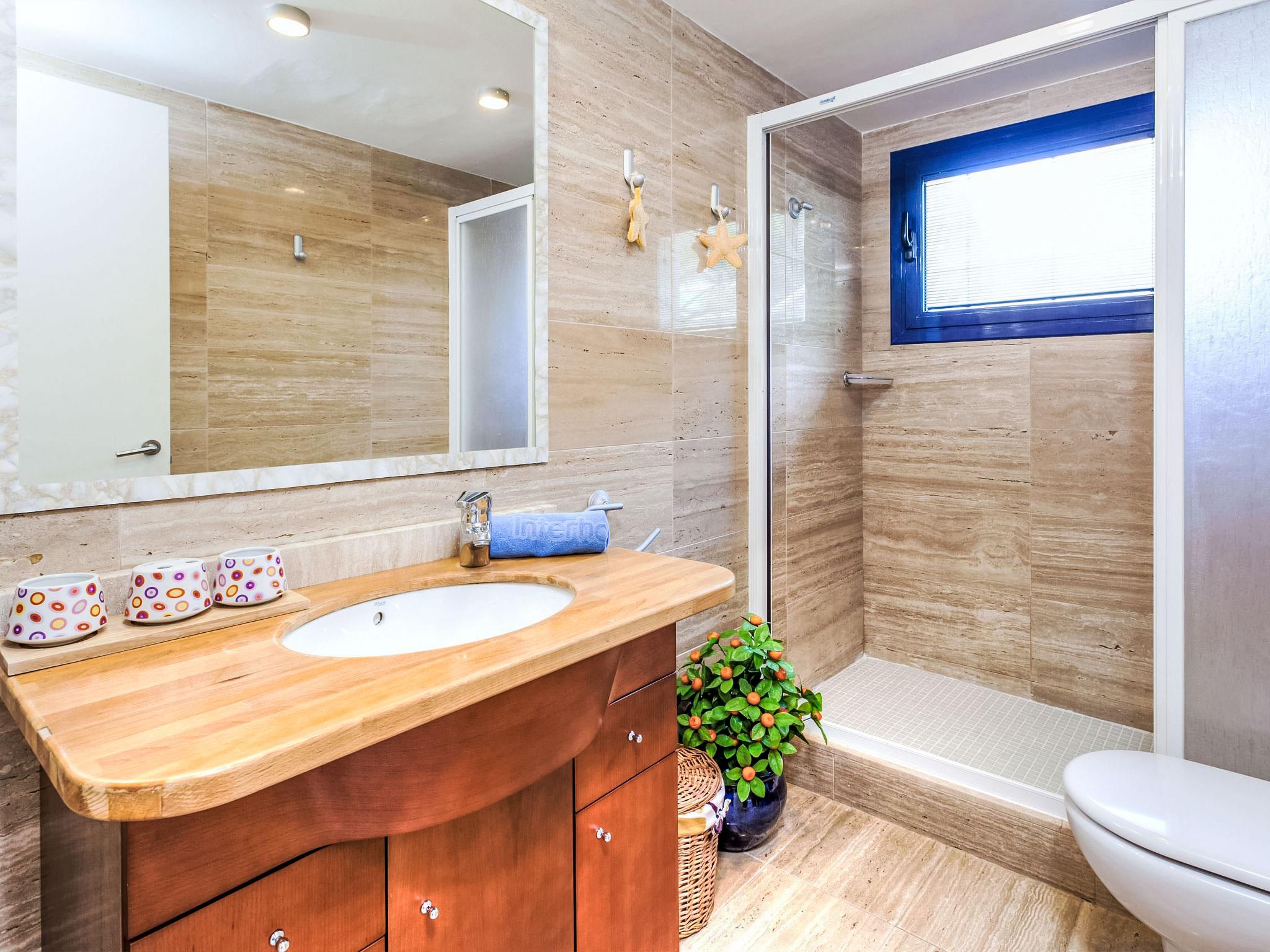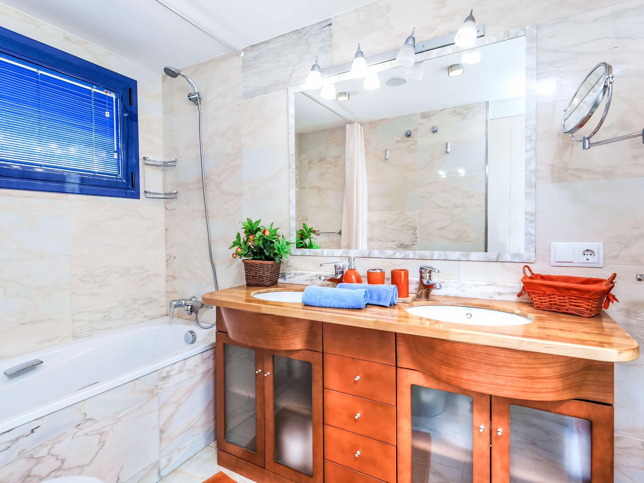 "Crystal", 5-room terraced house 223 m2 on 4 levels. Spacious, comfortable and stylish furnishings: 1 room with 1 french bed (150 cm, length 190 cm), air conditioning and forced-air heating. Exit to the terrace with 1 french bed (150 cm, length 190 cm), bath/WC, air conditioning and forced-air heating. Exit to the terrace with 1 x 2 bunk beds (80 cm, length 190 cm), air conditioning and forced-air heating. Shower/WC. Air-conditioning, forced-air heating. On the lower ground floor: mezzanine. Upper floor: living/dining room with satellite TV. Exit to the terrace. Kitchen (oven, dishwasher, 4 ceramic glass hob hotplates, toaster, kettle, microwave, freezer, electric coffee machine). Terrace furniture, deck chairs. Panoramic view of the mountains and the ocean. Facilities: washing machine, dryer, iron, baby cot, hair dryer. Internet (WiFi, free). Please note: non-smoking house. HUTG-034191 // Reg. Nr.: ESFCTU00001701700023202700000000000000000HUTG-0341911