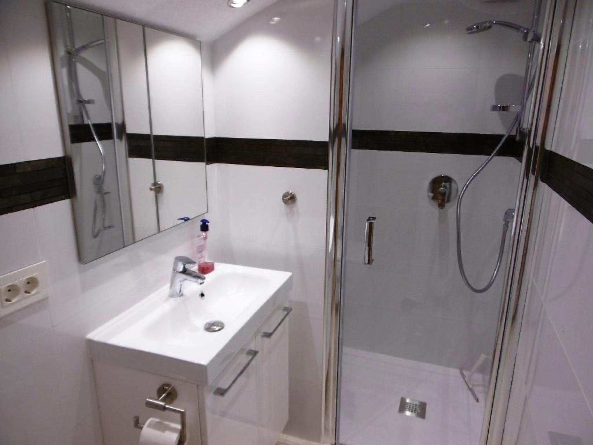 Opposite the kitchen is a bedroom with 2 single beds and another satellite TV. The corresponding renovated bathroom is equipped with a shower, washbasin with under-cabinet, mirrored cabinet and a toilet.