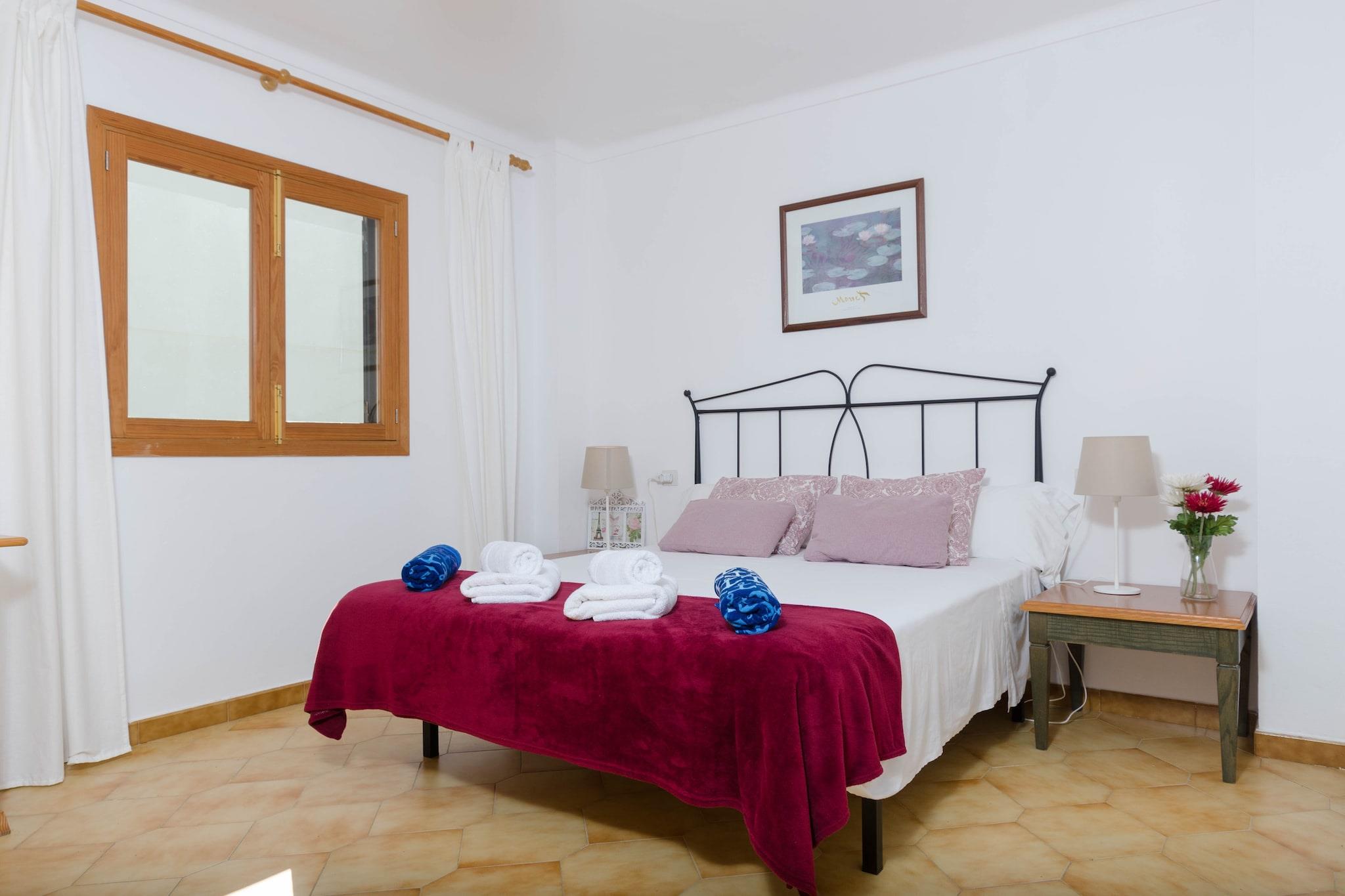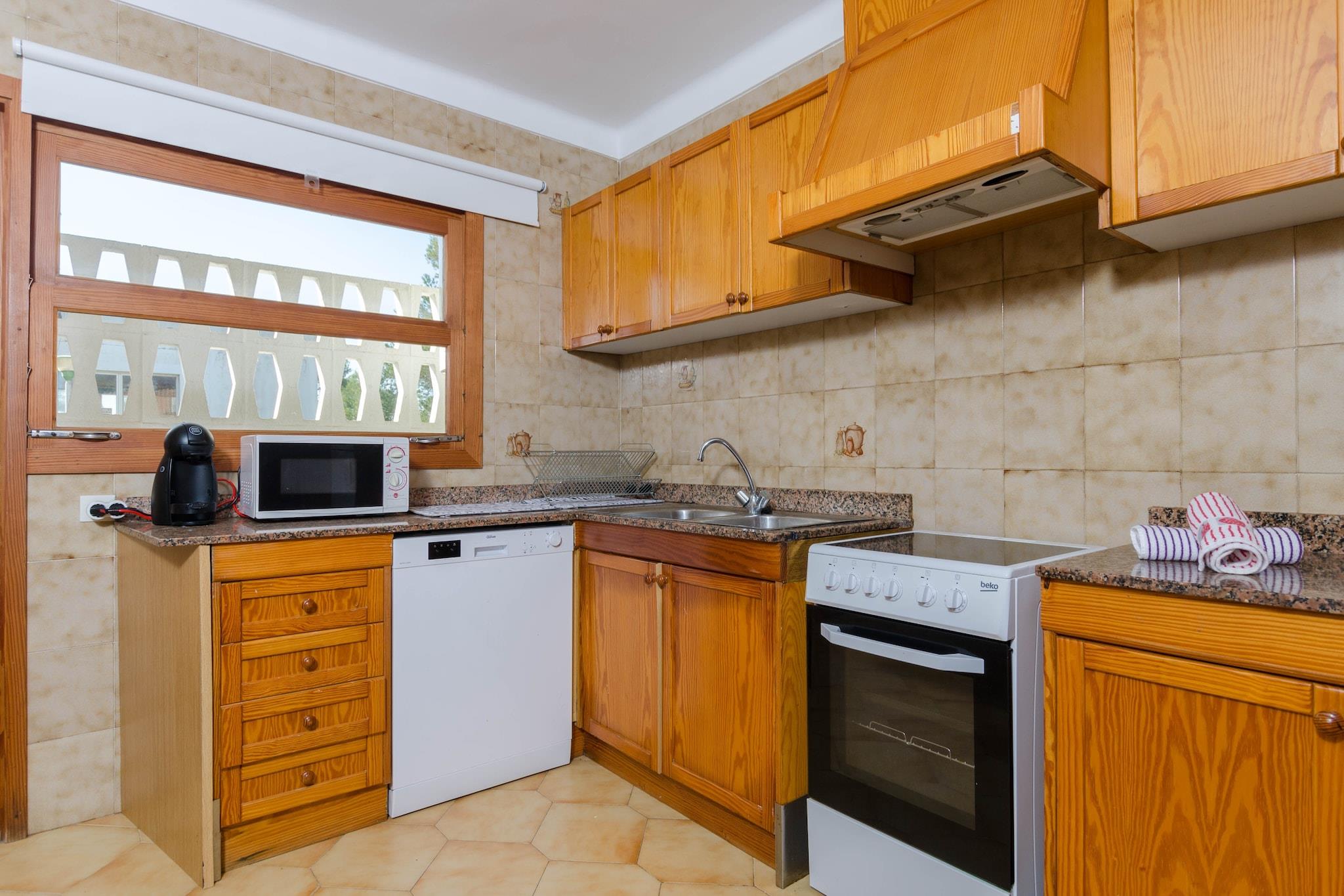 Alfresco og liggestole Træd ud på den private terrasse, hvor dagen begynder med frisk luft og slutter med et glas vin. Det udendørs rum har en kunstig græsplæne og to liggestole, ideel til at læse, slappe af eller nyde den mallorcanske sol. Blot en kort gåtur fra stranden kan du nyde nem adgang til Playa de Muros rolige vand, hvilket gør spontane svømmeture eller aftenture ubesværet bekvemme. Terrassen fungerer også som et perfekt sted for alfresco måltider efter en dag i solen. Luftige opholdsrum Indvendigt blander stue-spisestuen levende farver og komfortable møbler, hvilket skaber et fredeligt tilflugtssted. Udstyret med aircondition og satellit-tv er det det ideelle sted at slappe af, dele måltider eller nyde stille øjeblikke. Det traditionelle køkken, komplet med keramisk kogeplade og alle nødvendige apparater, lader dig tilberede hjemmelavede retter med lethed. Tre soveværelser sikrer afslappende nætter: en dobbeltseng med AC og to tvillinger med ventilatorer, to med skabe. Huset indeholder en barneseng, høj stol og to badeværelser - det ene med badekar, det andet med bruser. Førsteklasses kystbeliggenhed Beliggende kun 230 meter fra Playa de Muro, kombinerer dette rækkehus roen i et boligområde med bekvemmeligheden ved nærliggende tjenester. Caféer, restauranter, supermarkeder og butikker er alle inden for rækkevidde, mens golfentusiaster kan nå Alcanada-banen på 10 km. Puerto de Alcúdia ligger kun 8,4 km væk og byder på yderligere spise- og kulturelle oplevelser.