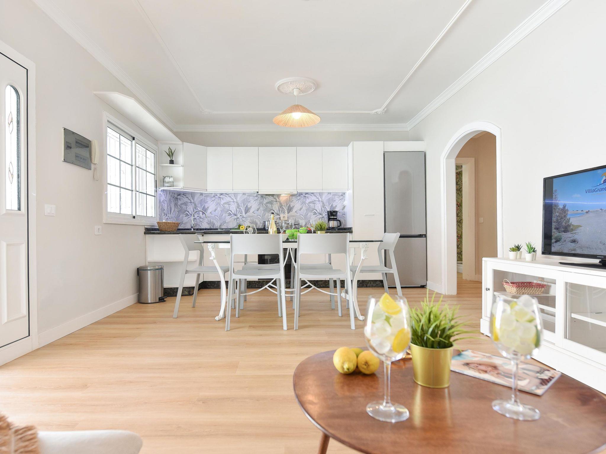"Nena Playa del Ingles", 5-room apartment 140 m2. Comfortable and cosy furnishings: living/dining room with dining table and digital TV. 2 rooms, each room with 1 french bed and air conditioning. 1 room with 1 x 2 bunk beds. Kitchen-/living room (oven, dishwasher, 3 ceramic glass hob hotplates, toaster, kettle, microwave, freezer, electric coffee machine) with dining table, dining nook. 2 showers/WC. Large terrace. Terrace furniture, barbecue, deck chairs. View of the resort. Facilities: washing machine, safe, iron, children's high chair, baby cot for up to 2 year olds, hair dryer. Internet (WiFi, free). Please note: non-smoking house. 2023-T10284 // Reg. Nr.: ESFCTU0000350130003073100000000000000VV-35-1-00202246