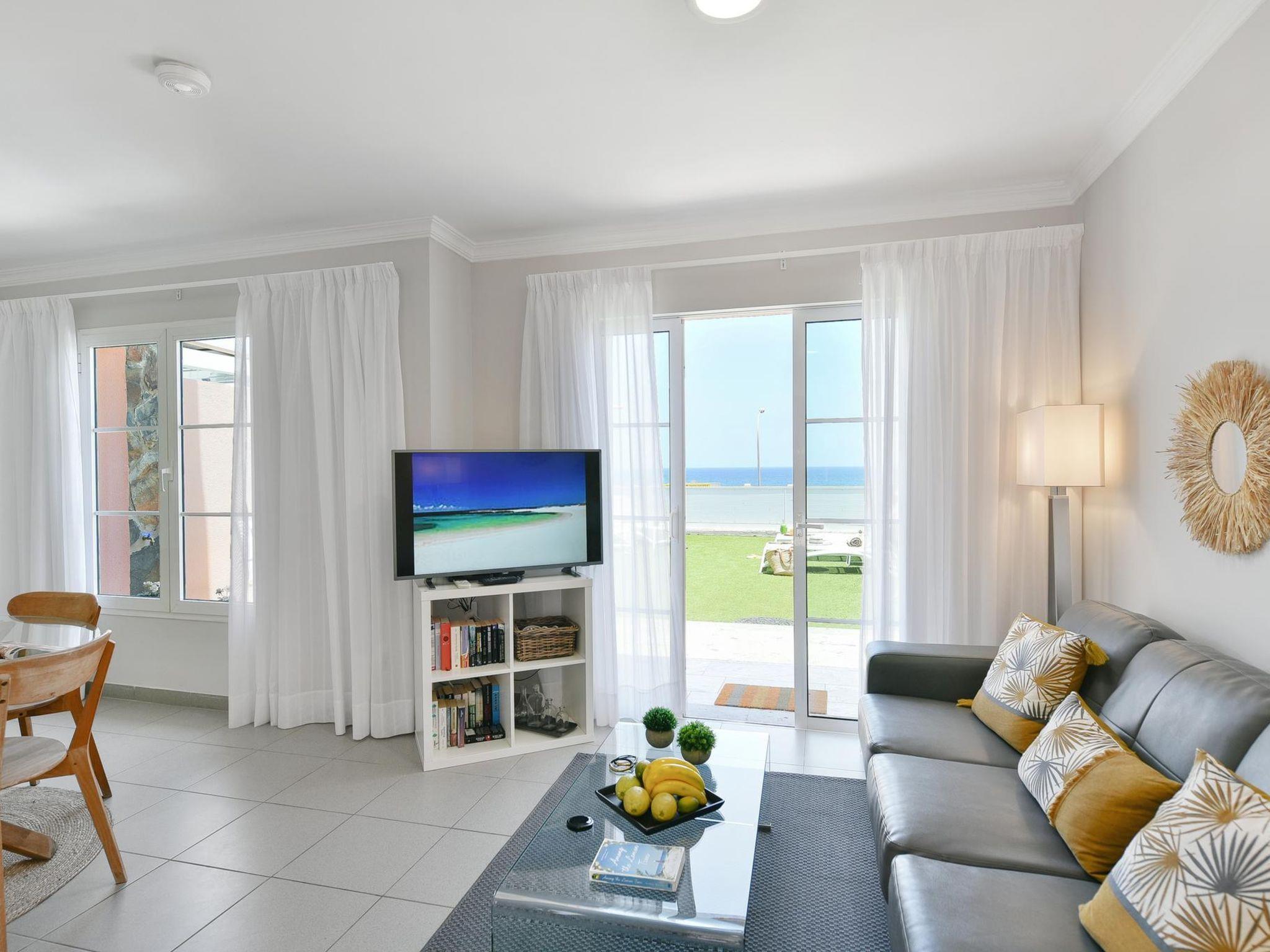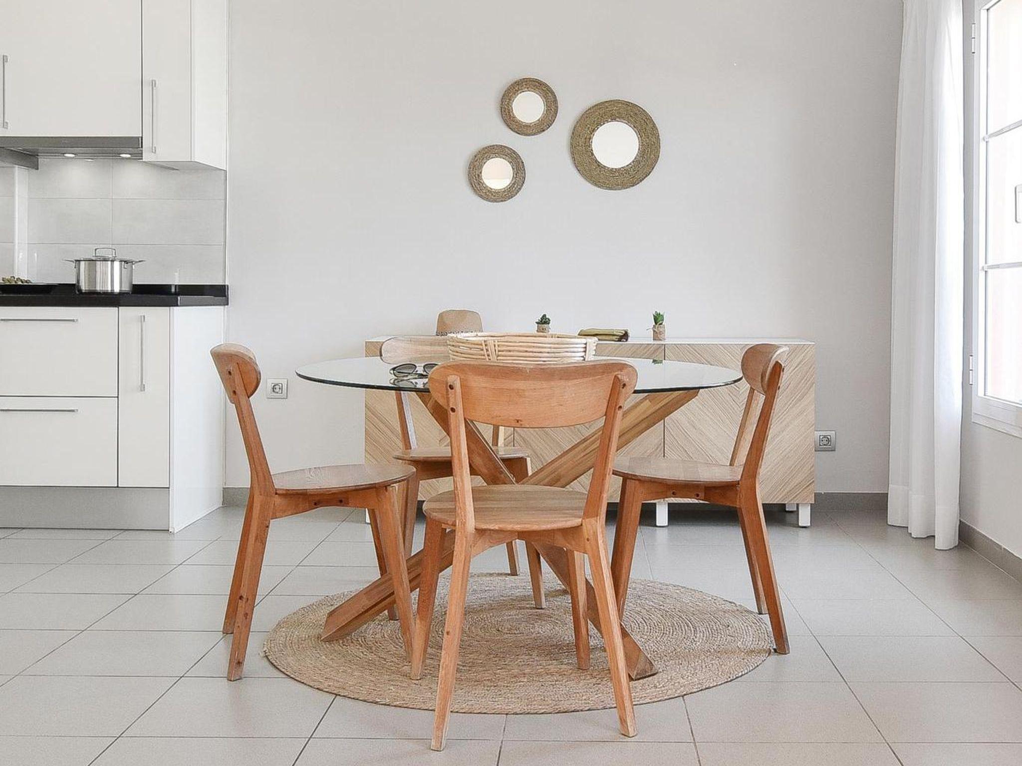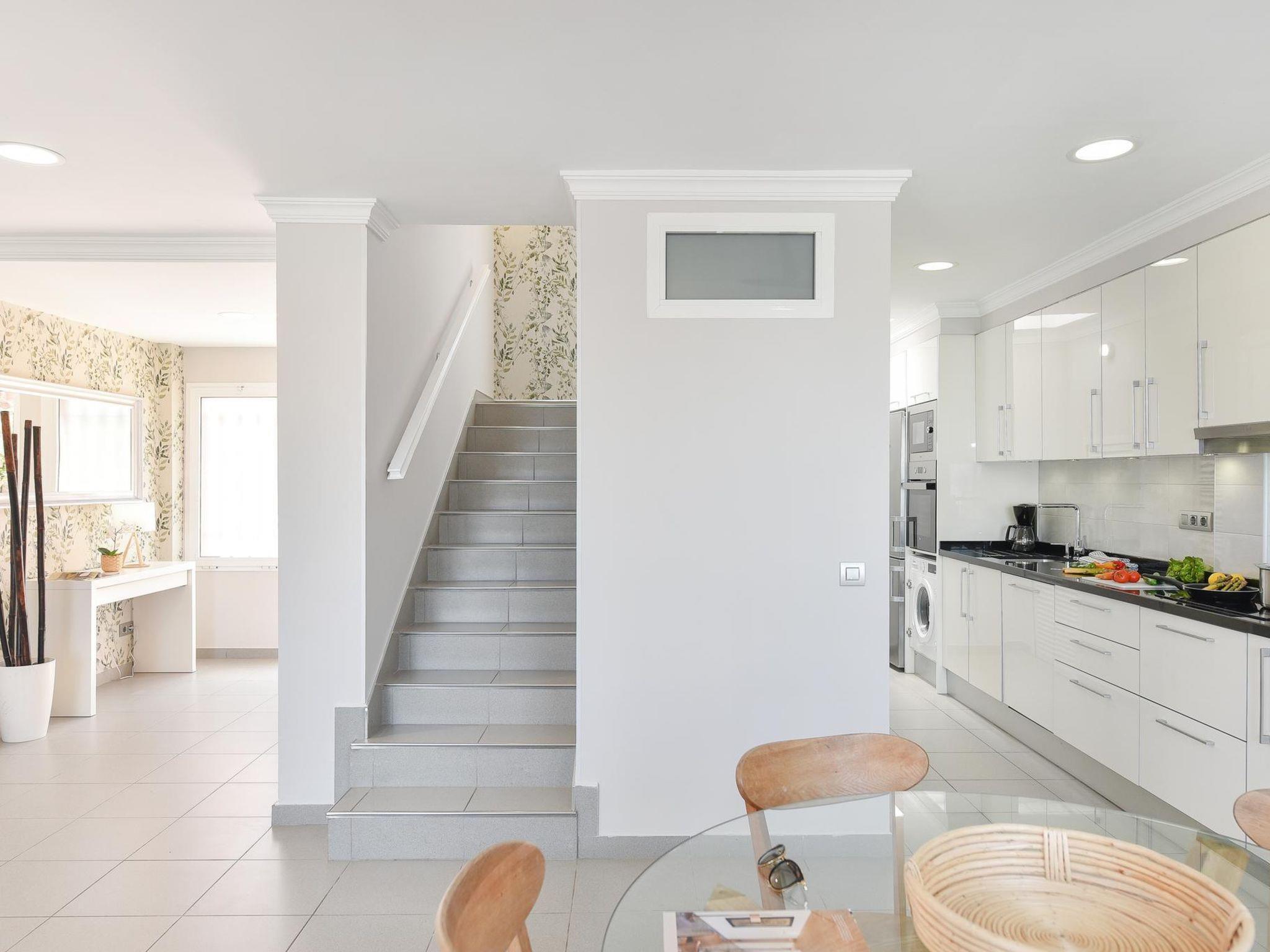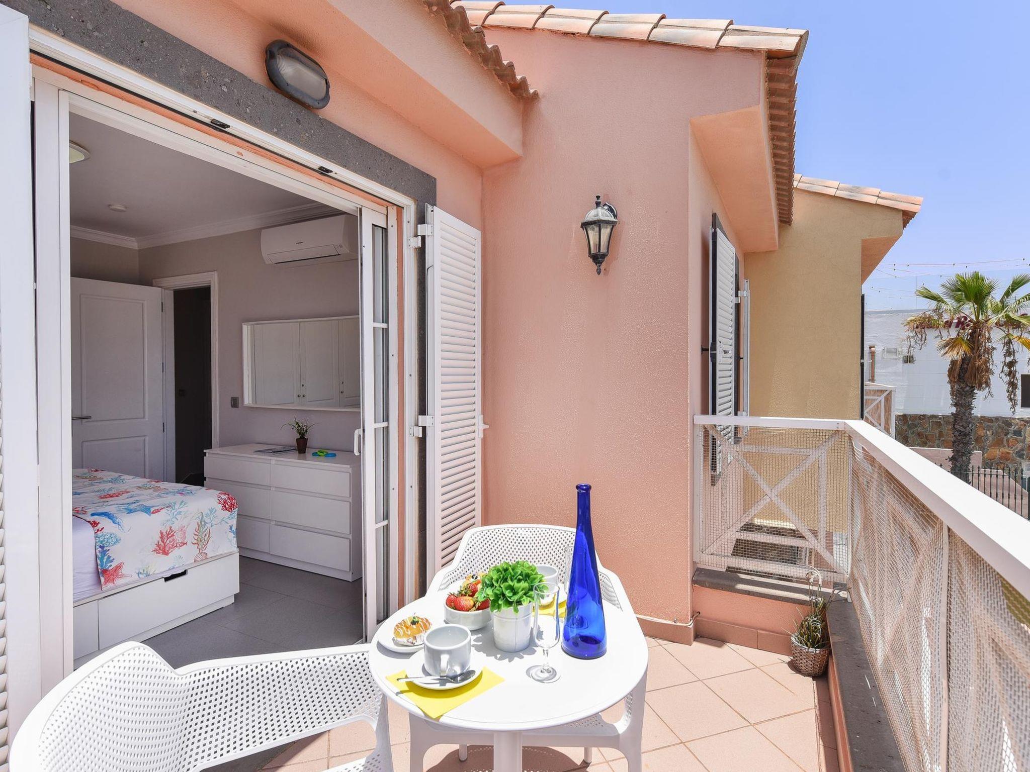 "Chalet Santa Ana 24", 3-room house 100 m2 on 2 levels. Comfortable and modern furnishings: living/dining room with dining table, digital TV and electric shutters. Exit to the patio. Open kitchen (oven, dishwasher, 3 ceramic glass hob hotplates, toaster, kettle, microwave, freezer, electric coffee machine). Shower/WC. Upper floor: 1 room with 1 french bed and air conditioning. Exit to the balcony. 1 room with 2 beds and air conditioning. Bath/WC. Balcony, patio. Terrace furniture, balcony furniture, deck chairs. View of the sea and the resort. Facilities: washing machine, safe, iron, children's high chair, baby cot for up to 2 year olds, hair dryer. Internet (WiFi, free). Parking (1 car). Please note: non-smoking house. 2023-T7505 // Reg. Nr.: ESFCTU0000350130003080270000000000000VV-35-1-00199146