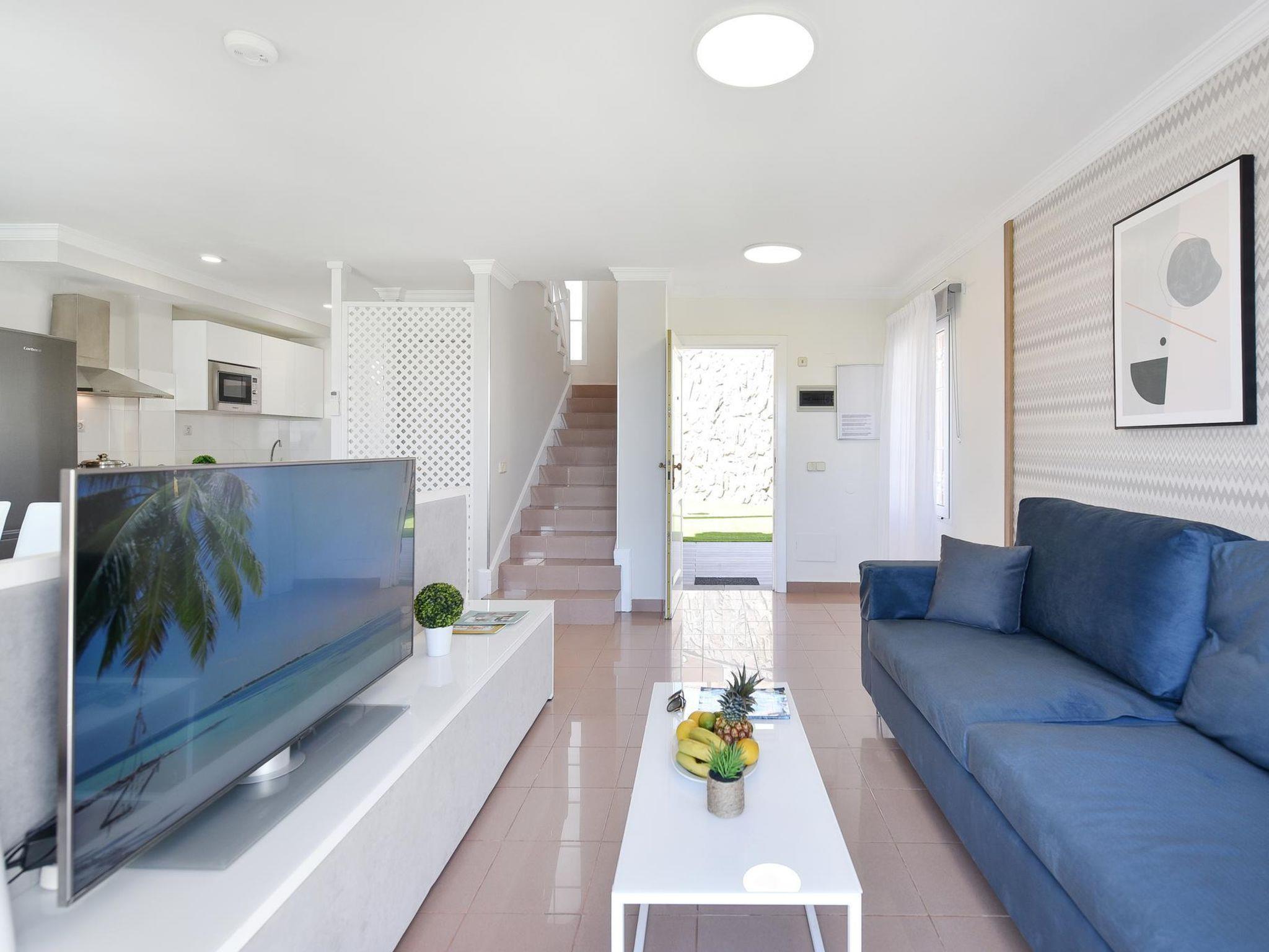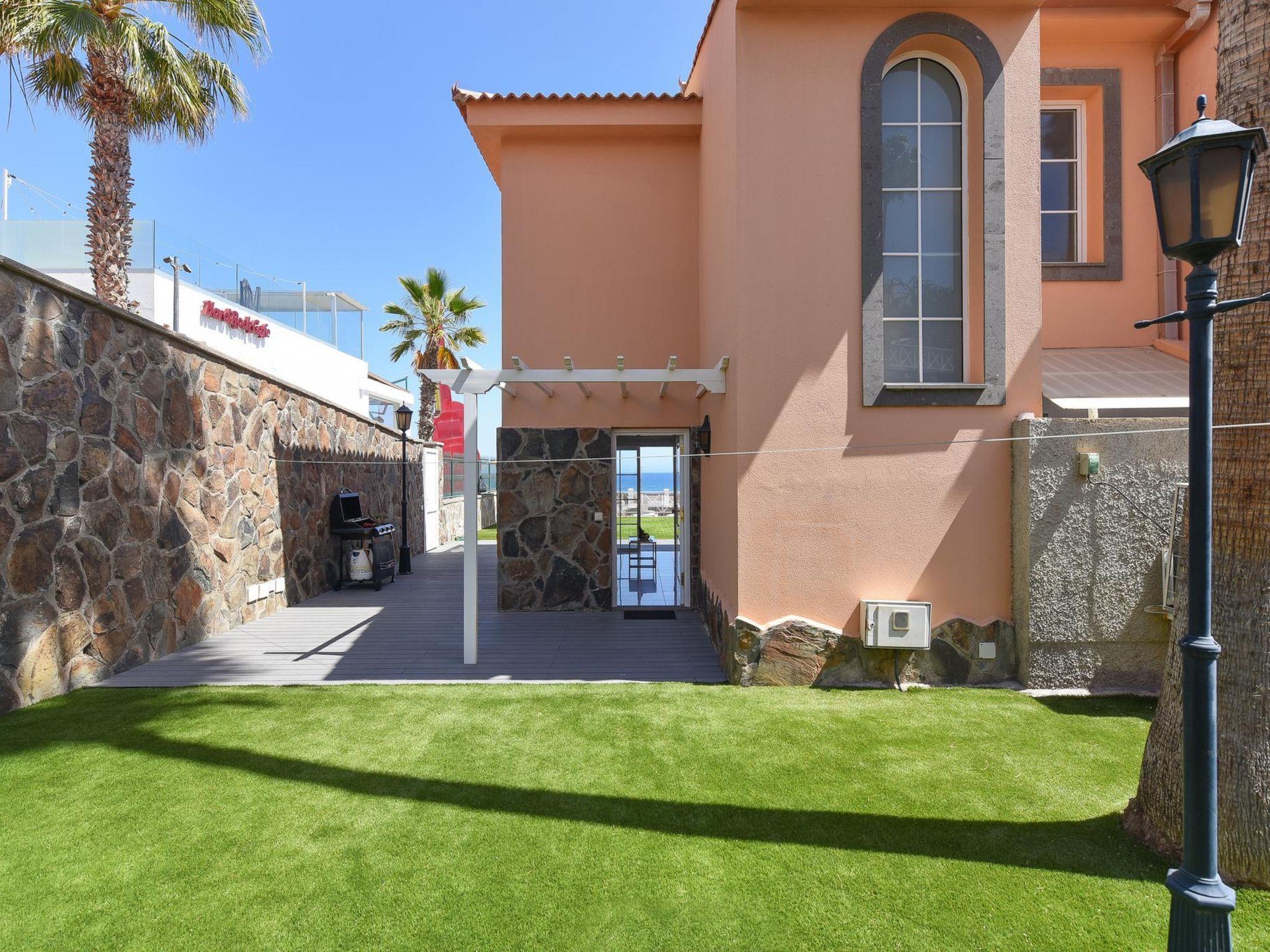 Modern, comfortable terraced house "Santa Ana 25". In the centre of Playa del Inglés, in a central, quiet position in the residential district, 100 m from the sea, 100 m from the beach. For shared use: swimming pool angular (16 x 8 m, seasonal availability: 01.Jan. - 31.Dec.). Outdoor shower. Private: garden (fenced) with lawn. Barbecue. In the house: sun terrace, air conditioning. Parking on the premises, public parking on the road. Bus stop "Shopping Center Cita" 600 m. The owner does not accept any youth groups. Neighbourhood highly sensitive to noise. Quietness and good behaviour expected.