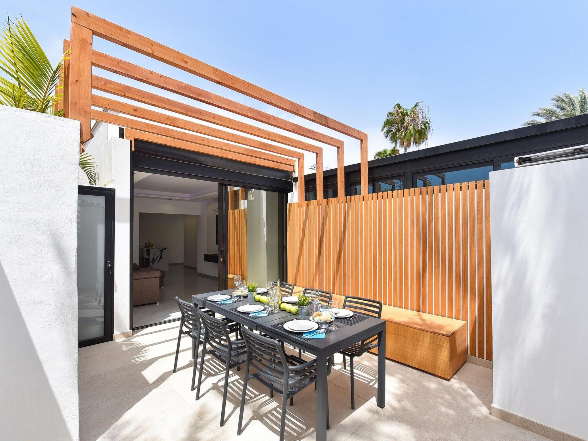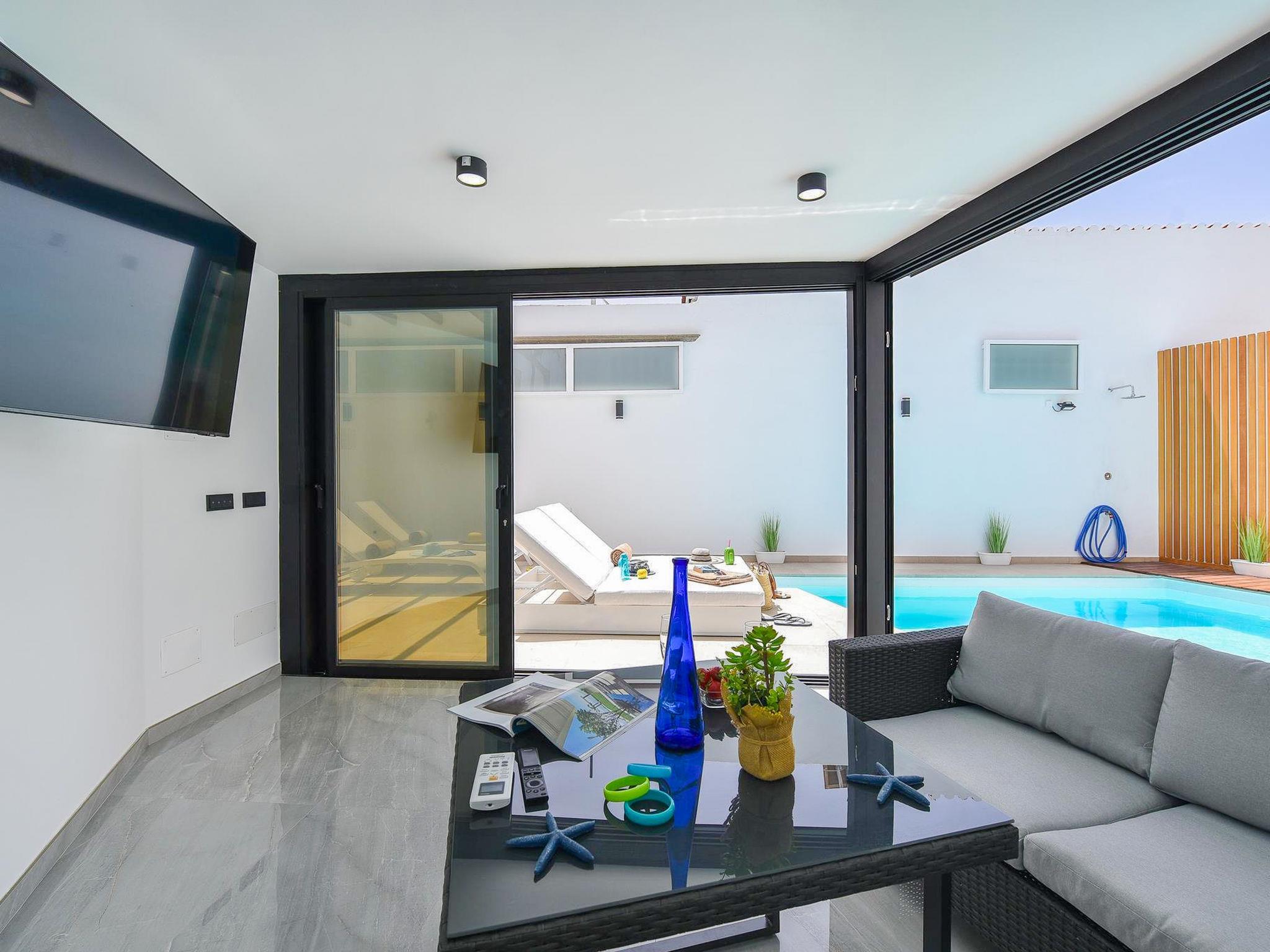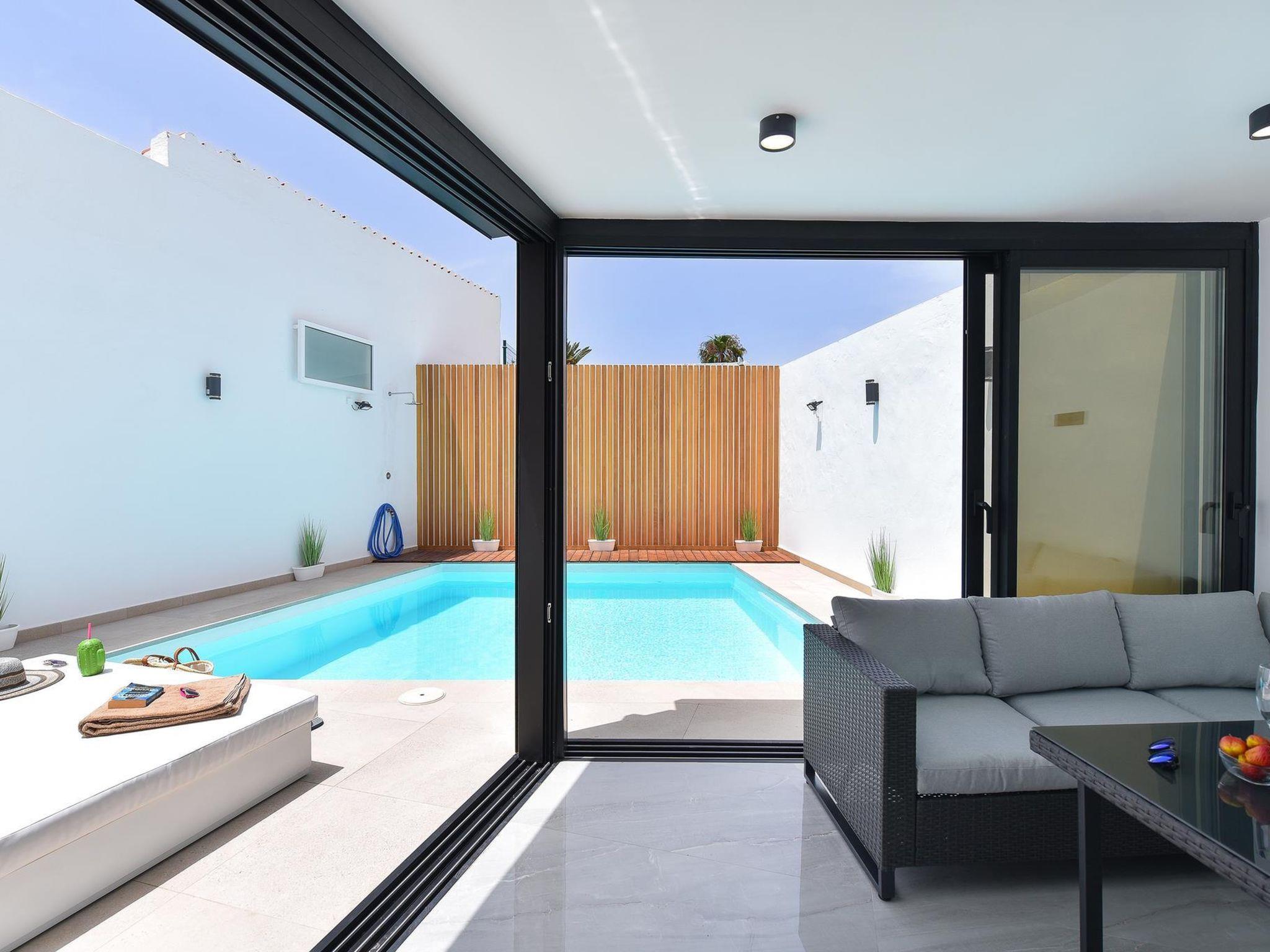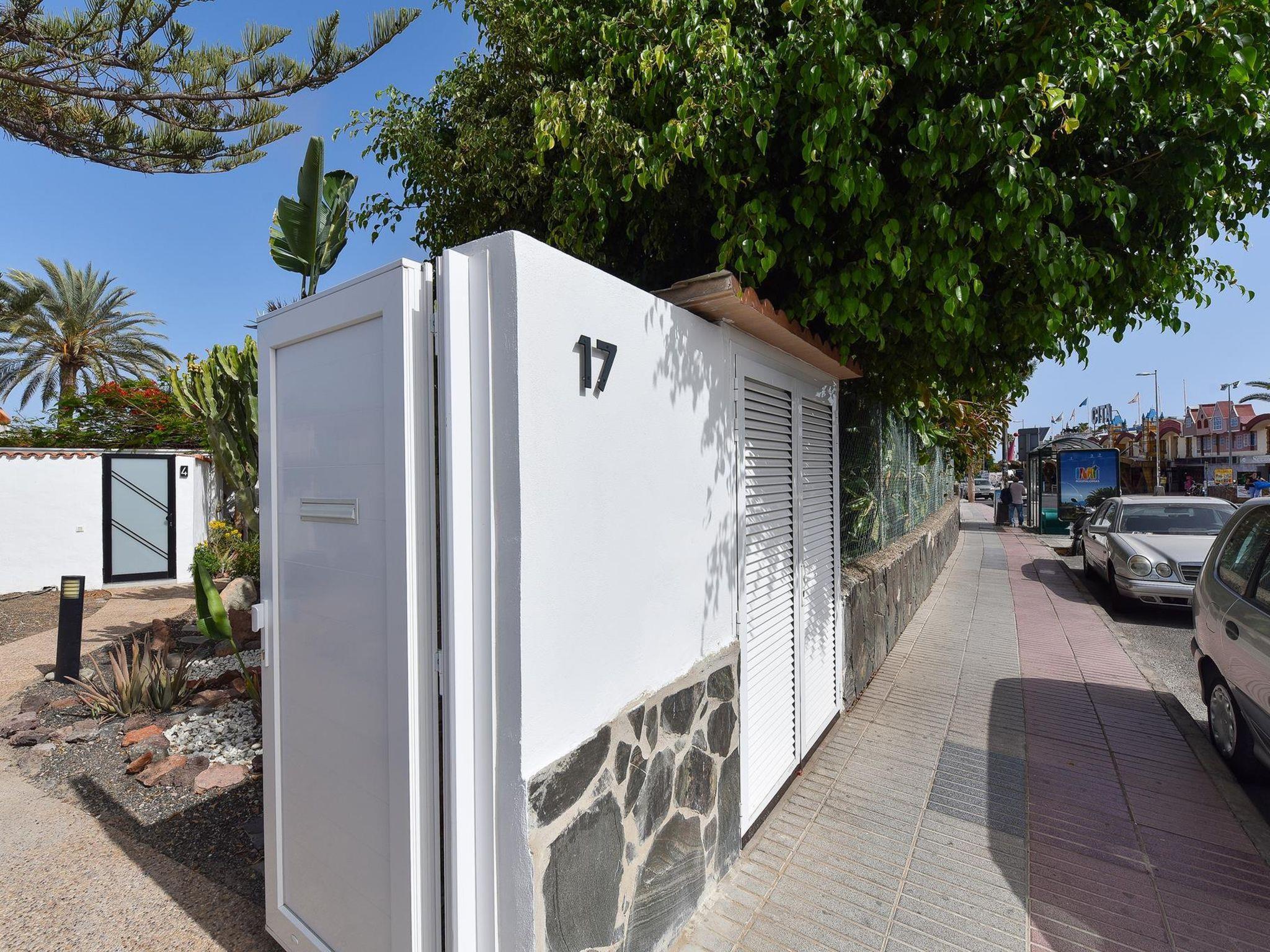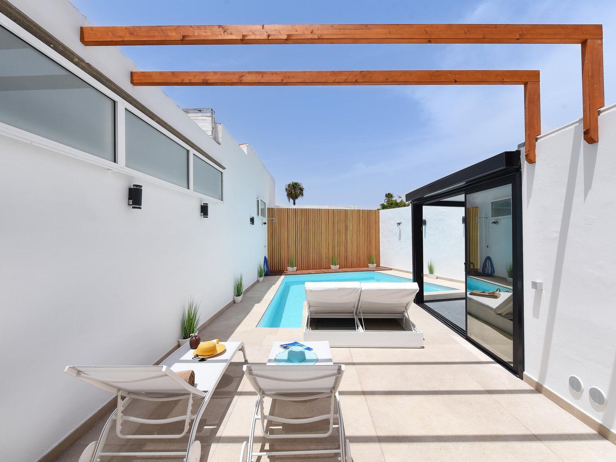 Modern, comfortable villa "Villa Aisha". In the centre of Playa del Inglés, in a central, busy position. Private: property (fenced), swimming pool (4 x 4 m, depth 150 - 150 cm, seasonal availability: 01.Jan. - 31.Dec.). Outdoor shower. In the house: air conditioning. Public parking on the road. Shop, supermarket 200 m, bus stop "Shopping Center Cita" 10 m. The owner does not accept any youth groups. Please note: airfield 35 km from the property. Neighbourhood highly sensitive to noise. Quietness and good behaviour expected.