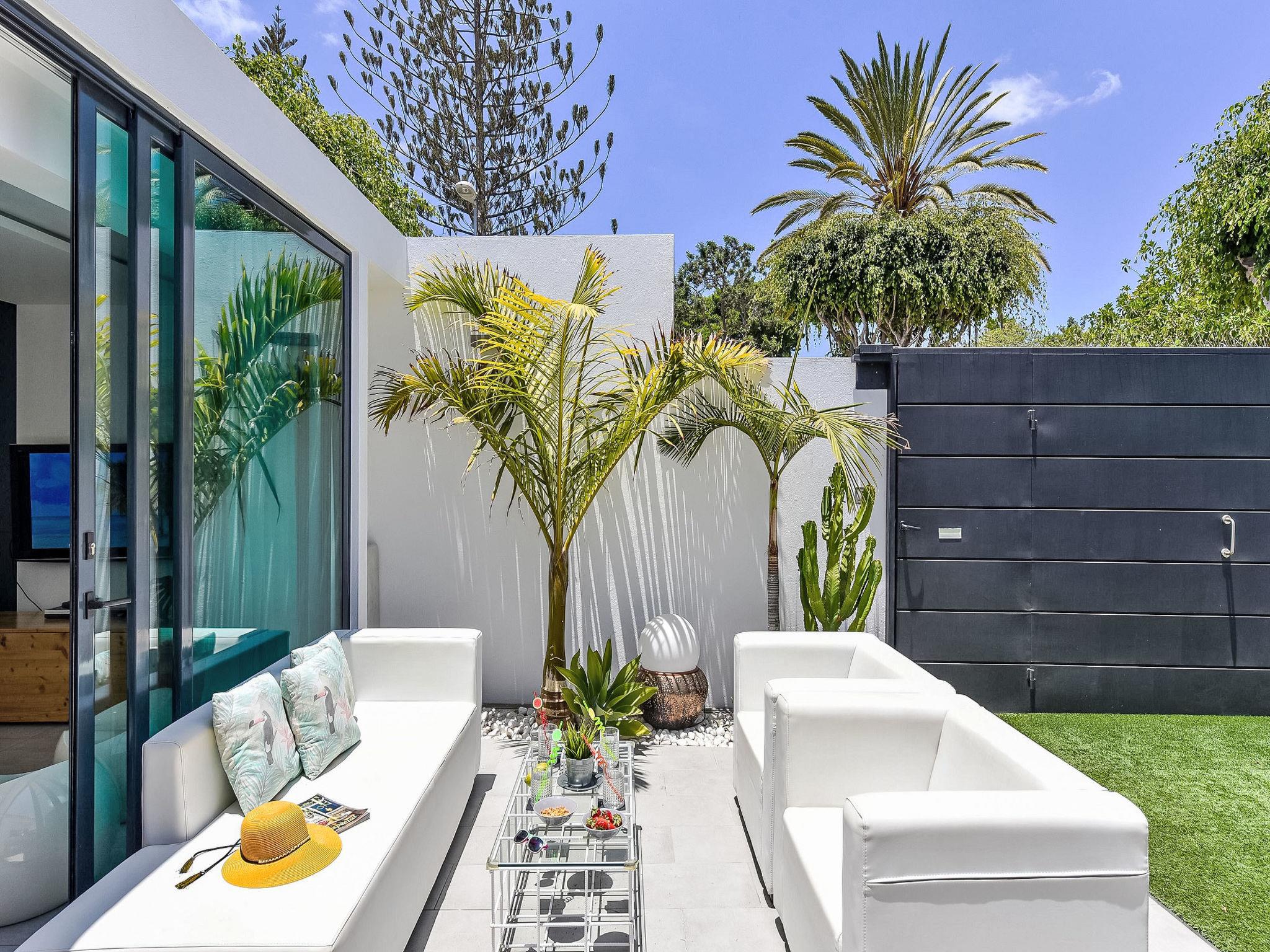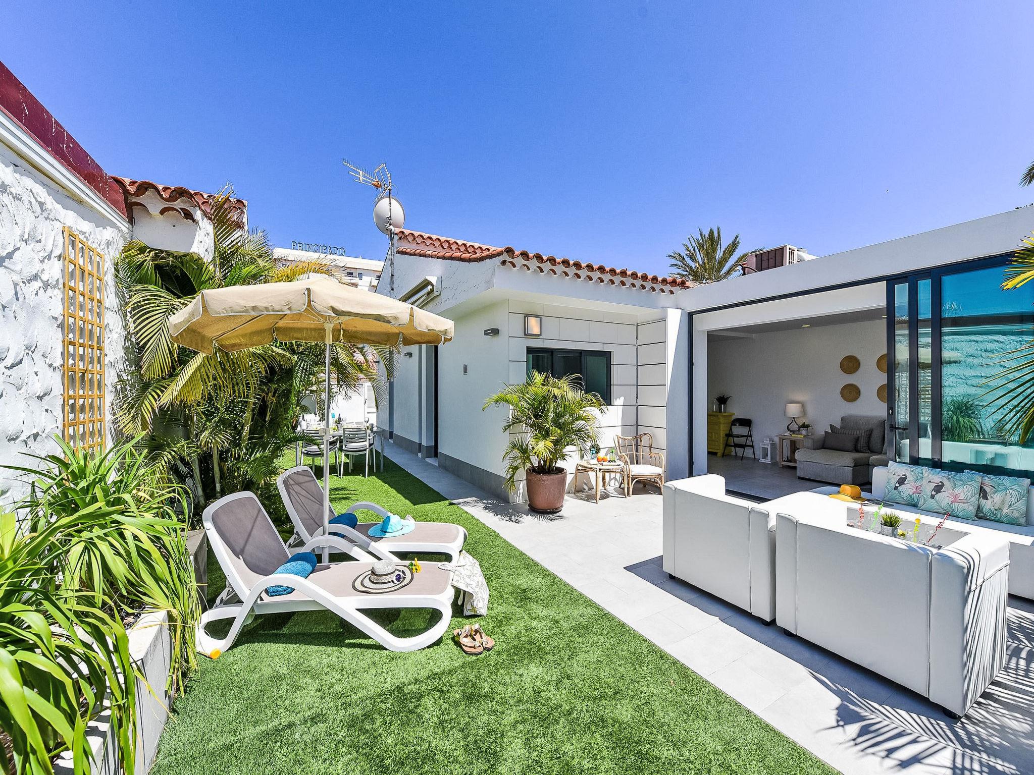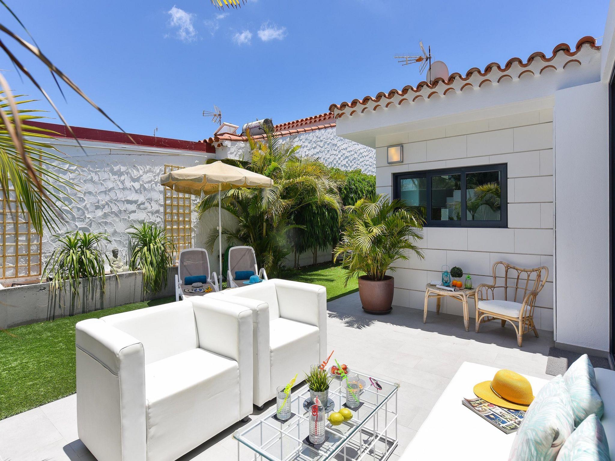 Very beautiful, comfortable bungalow "GD04". In the resort Playa del Inglés, excellent location: right in the centre but still quiet. For shared use: beautiful garden to relax, swimming pool angular (seasonal availability: 01.Jan. - 31.Dec.). Patio. In the house: internet access, WiFi, air conditioning, washing machine, tumble dryer. Public car park. Bus stop "AV de Bonn" 75 m. The owner does not accept any youth groups. Neighbourhood highly sensitive to noise. Quietness and good behaviour expected. late arrivals will have an extra cost to be paid in cash: 20:30-22:00: 30€, 22:00-00:00: 50€, 00:00-01:30: 80€.