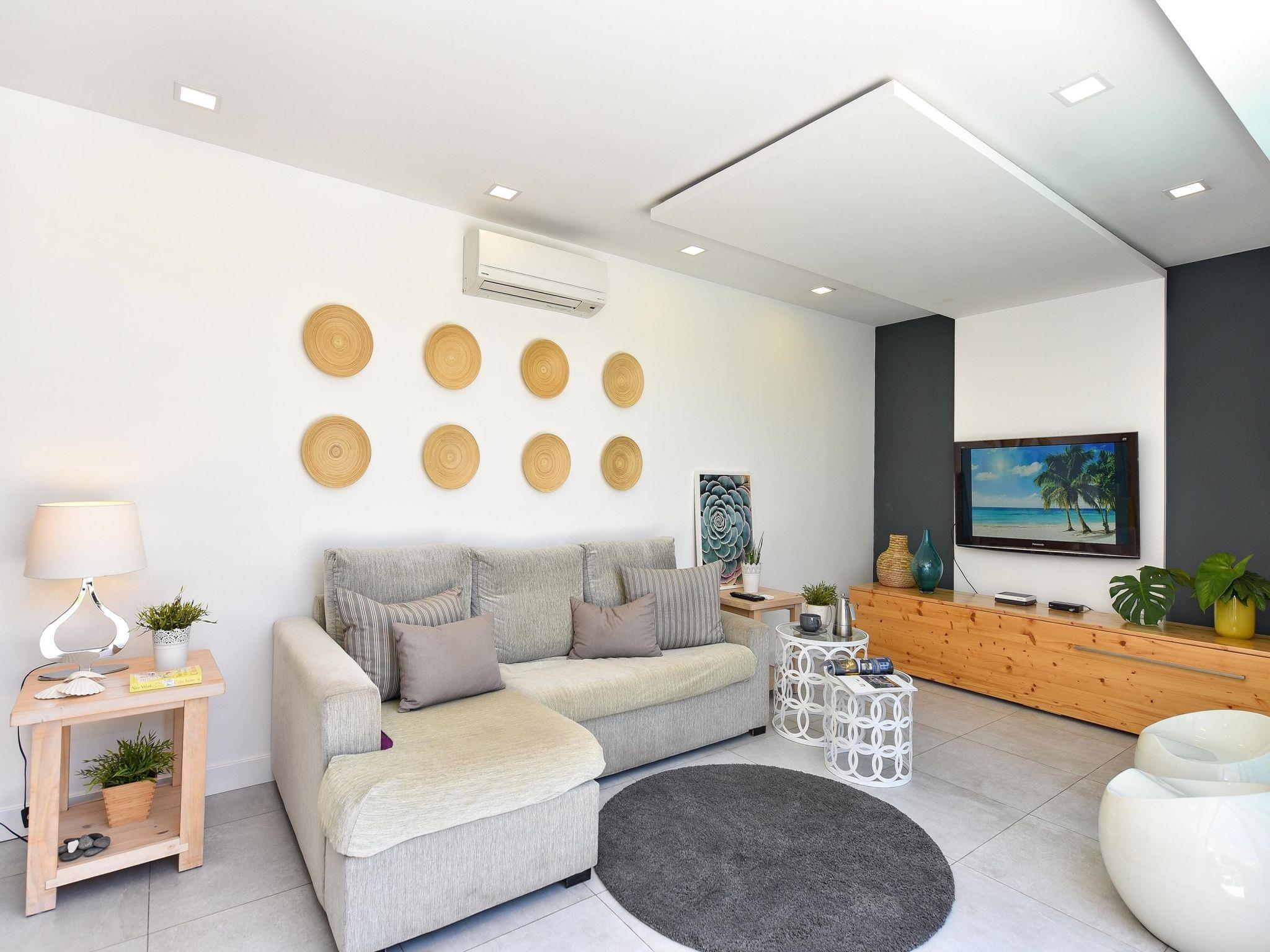 "GD04", 4-room bungalow 100 m2. Object suitable for 6 adults. Very comfortable and tasteful furnishings: living room with TV, flat screen and air conditioning. Exit to the patio. 1 open room with 1 french bed (150 cm, length 200 cm), TV, flat screen and air conditioning. 1 room with 1 french bed (150 cm, length 200 cm). 2 rooms, each room with 2 beds (90 cm, length 190 cm), air conditioning. Open kitchen (oven, dishwasher, 4 ceramic glass hob hotplates, toaster, kettle, microwave, freezer, electric coffee machine). 2 Baths/showers. Carpet. Deck chairs (2), sitting area. Facilities: washing machine, dryer, iron, children's high chair, baby cot for up to 2 year olds, hair dryer. Internet (WiFi, free). Please note: suitable for families. Non-smokers only. 2021-T1267 // Reg. Nr.: ESFCTU0000350130003705360000000000000VV-35-1-00155016