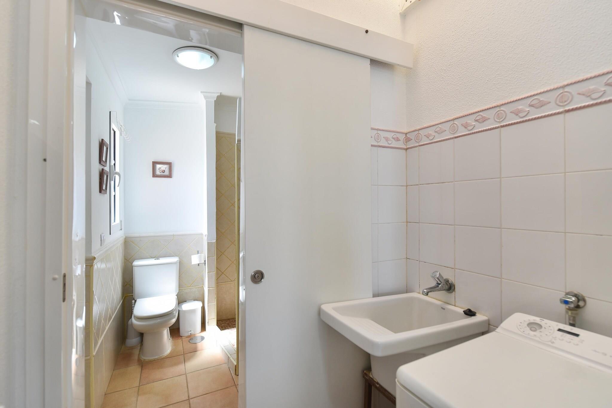 Stueetage: (åbent køkken(brødrister, komfur(glaskeramisk), kaffemaskine, ovn, mikrobølgeovn, køle-fryseskab), stue / spisestue(Fjernsyn(kabel, parabol, Smart-TV), spisebord, sofahjørne), toilet) På 1. etage: (Soveværelse med badeværelse(2x enkeltseng, bruser, håndvask, toilet), Soveværelse med badeværelse(2x enkeltseng, bruser, håndvask, toilet)) vaskemaskine, balkon, klimaanlæg, terrasse(privat), have(privat), havemøbler, grill(gas), parkering, swimmingpool(deles med andre gæster, 16 x 8 m.), barneseng, barnestol