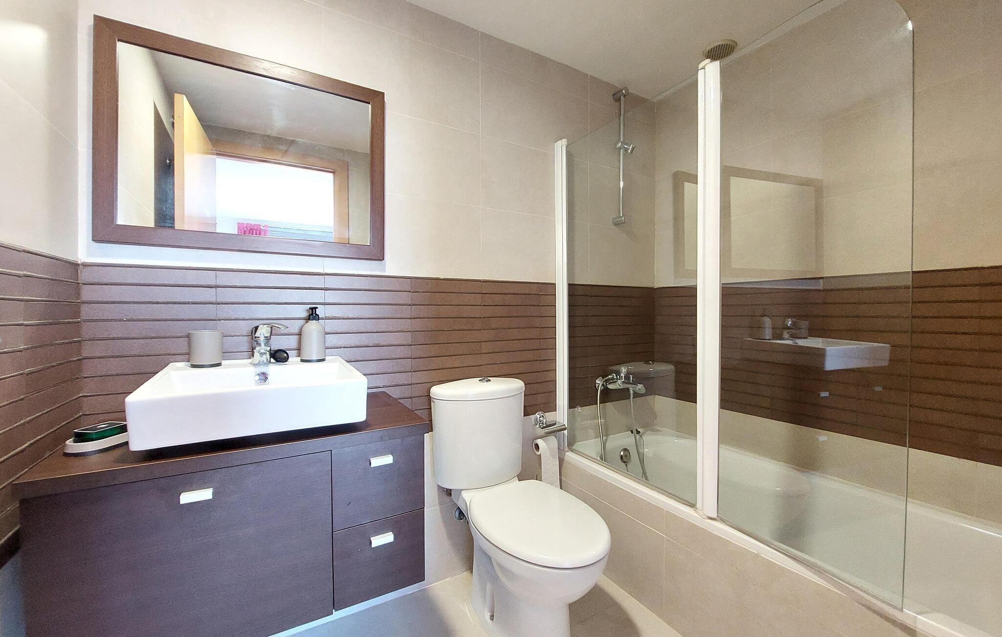 Kun en kort gåtur fra den lange sandstrand inviterer denne velholdte ferielejlighed til en afslappende pause. Tilbered middelhavsdelikatesser i det lyse, veludstyrede køkken og nyd dagens måltider ved det indbydende spisebord. Efter en begivenhedsrig dag kan I synke ned i den komfortable sofa og tilbringe værdifuld tid sammen over en spilleaften.