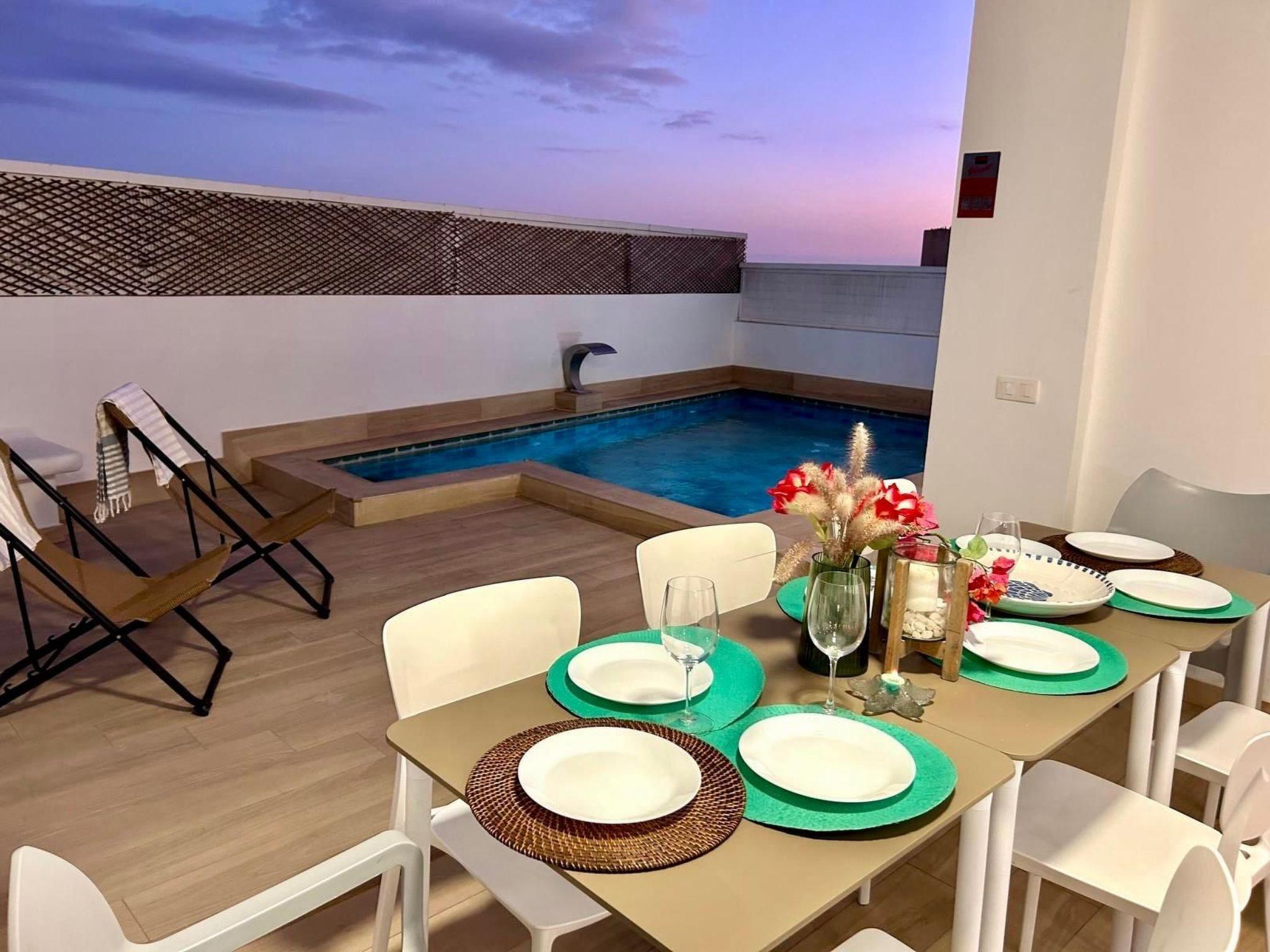 The outdoor area is fantastic! It includes a private pool, which can be heated for an extra charge, sun loungers, a barbecue area and an outdoor dining table.