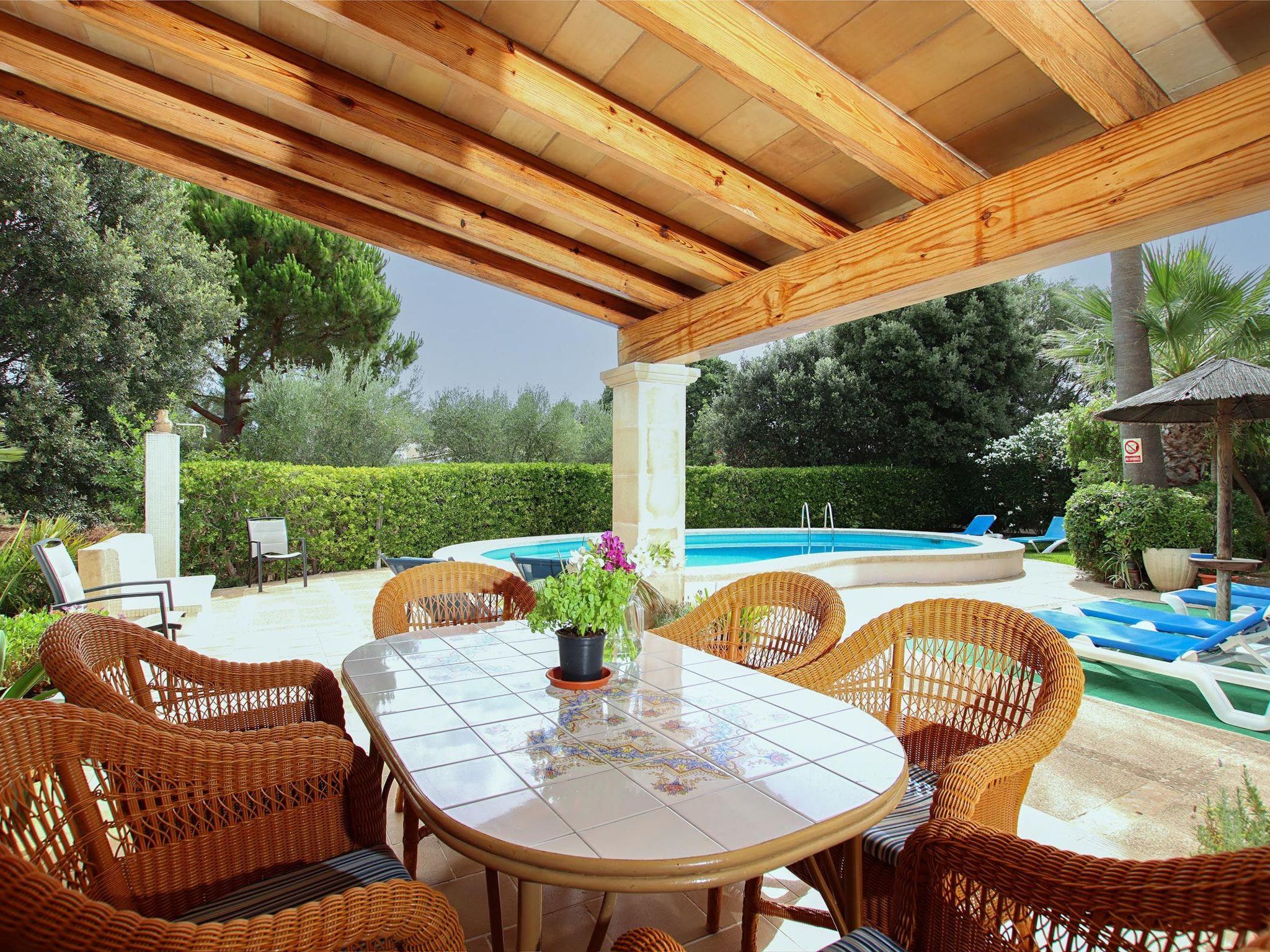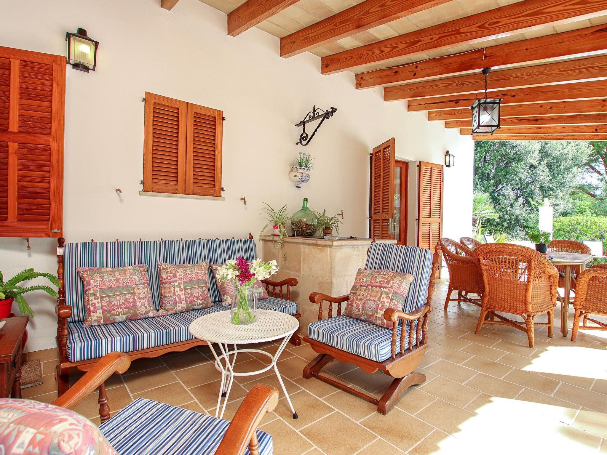 The exterior of villa Font Mar is a delight for family or friends with beautiful terrace areas, both covered and uncovered, ideal for enjoying the warm Mallorcan summer evenings. With direct access from the living room there is a picturesque covered terrace with built-in barbecue and units for easy food preparation and a large dining table and wicker chairs for all your &ldquocomidas al fresco&rdquo overlooking the pool and garden. Also below the terrace is a sofa and rocking chairs where you can sit and relax after dinner or just lounge in the shade during the day.