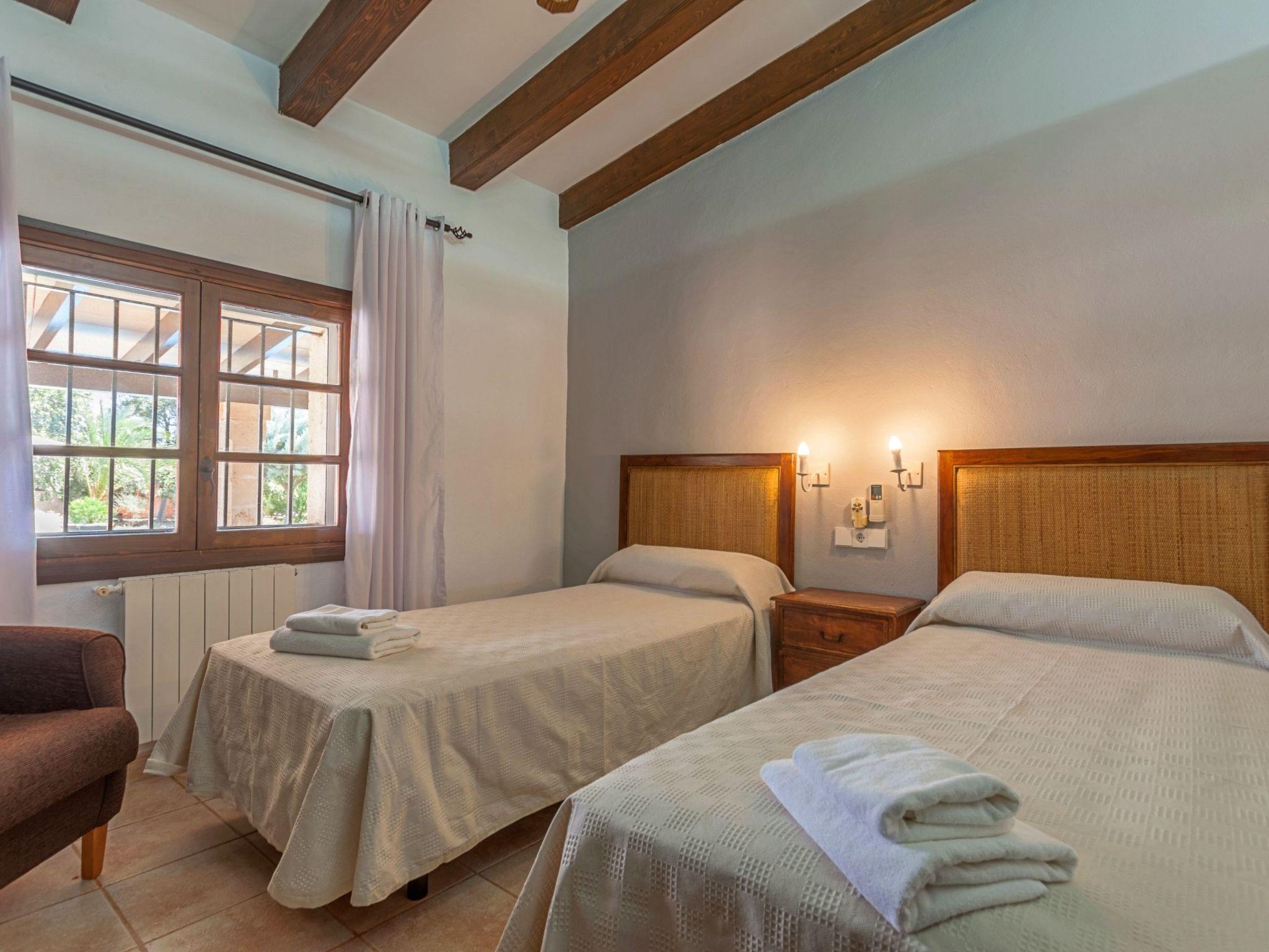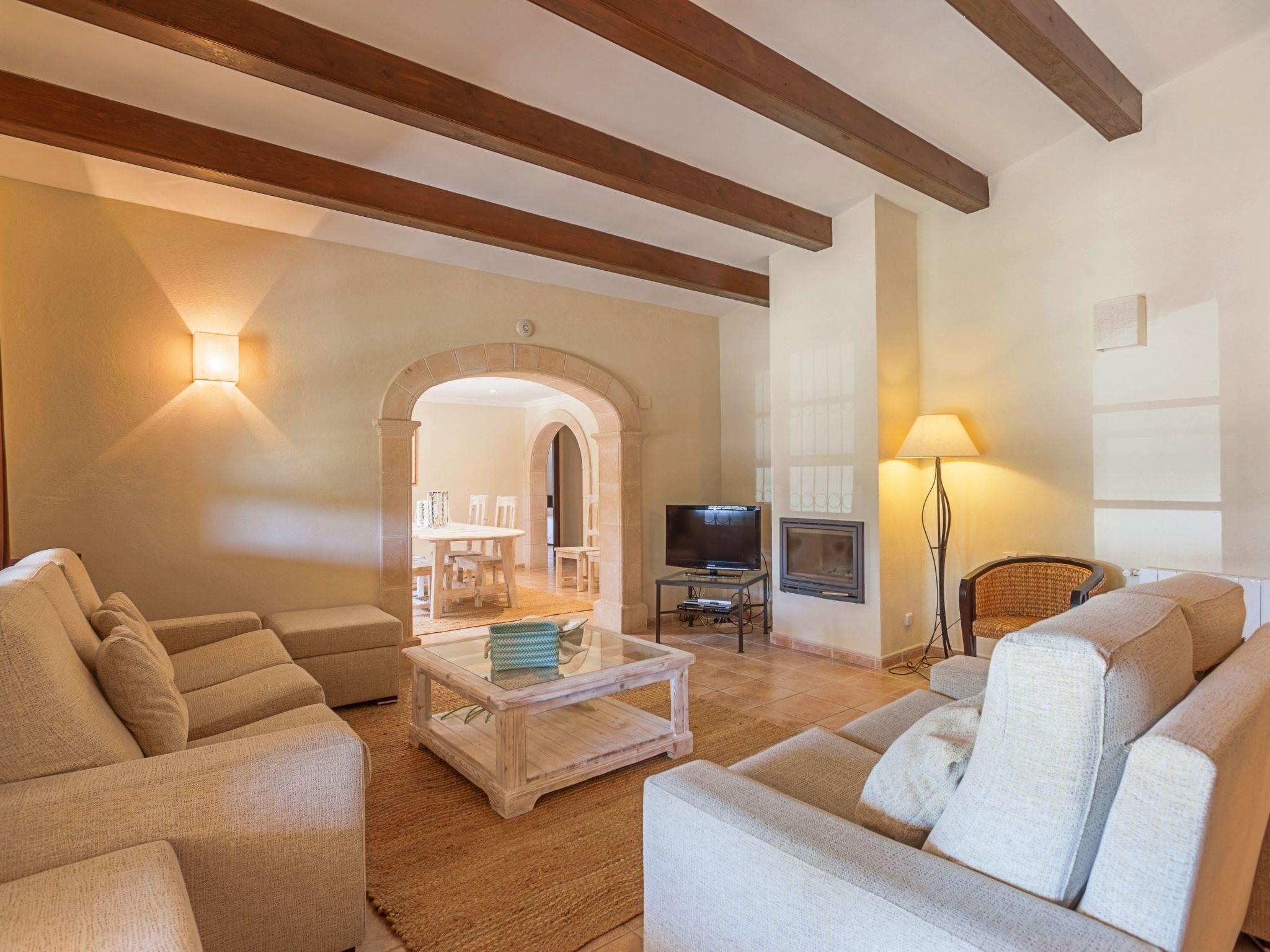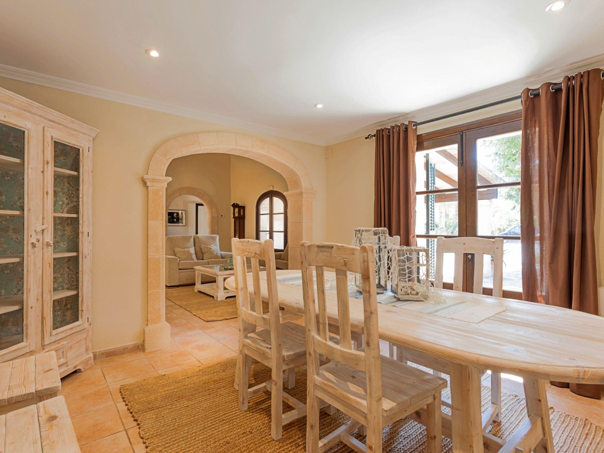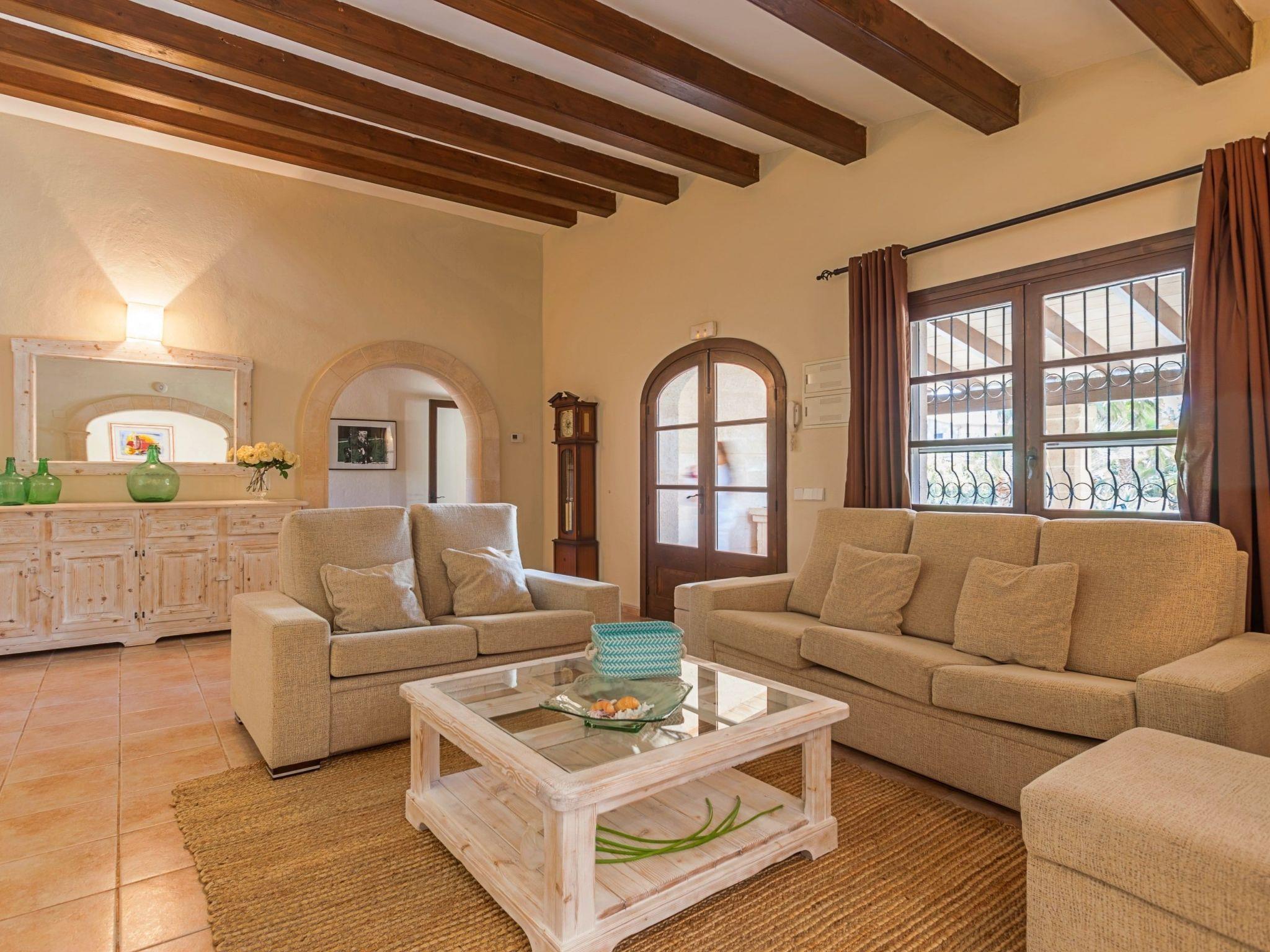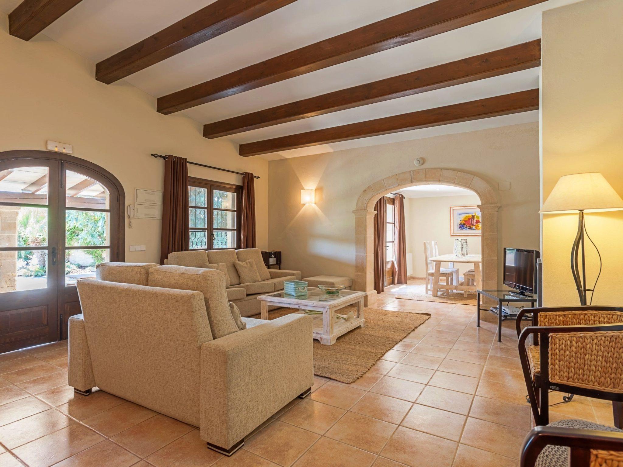 The interior of the villa is spread over one floor. The modern and spacious kitchen is equipped with all the necessary appliances, a breakfast table and chairs and has large doors leading out to the covered side terrace, as well as another door leading out to the covered front porch which is separated into two ambient areas. An outdoor dining area and a comfortable chill-out area complete with white wicker sofas. Between the kitchen and the living room is a separate dining area with a large natural wood table and chairs. Through the next stone archway is the living room, with its typical Mallorcan wooden beams, light neutral coloured sofas and wooden furniture, TV/SAT, DVD and WIFI. Again there is direct access to a covered outdoor porch with handmade table/bench and pouffes. A hallway leads to the master bedroom, with a wrought iron double bed, ceiling fan and en-suite shower room. This bedroom also has direct access to the pool area. The same hallway also leads to two double bedrooms, one of which has an en-suite shower room. The villa has another family bathroom.