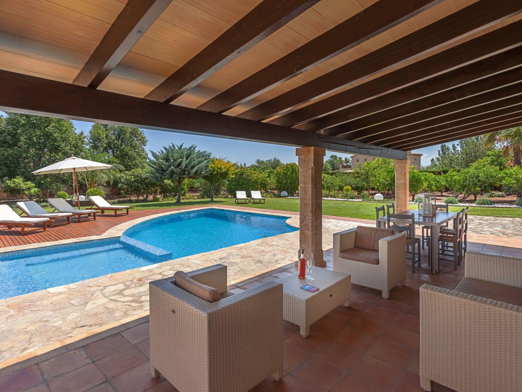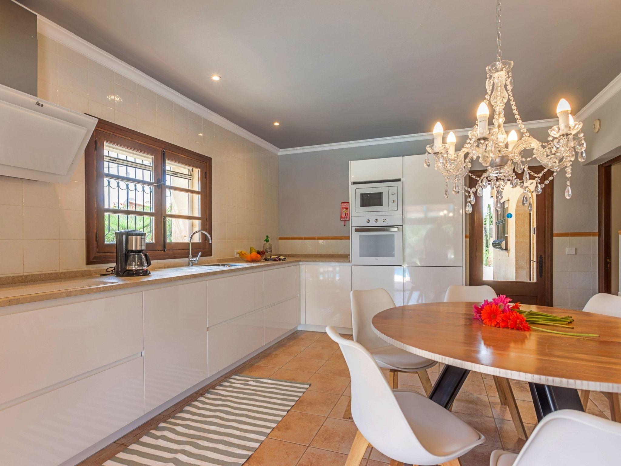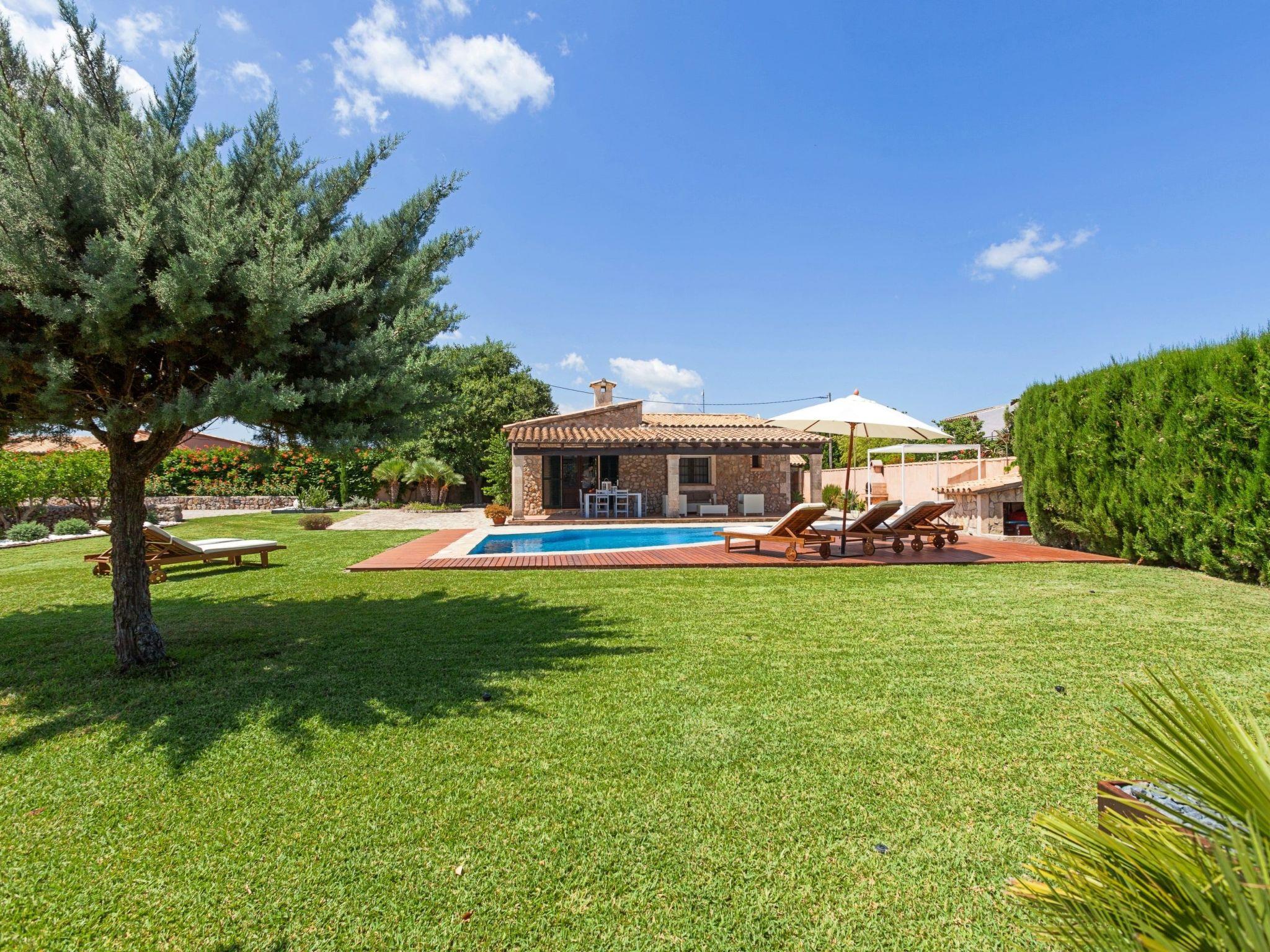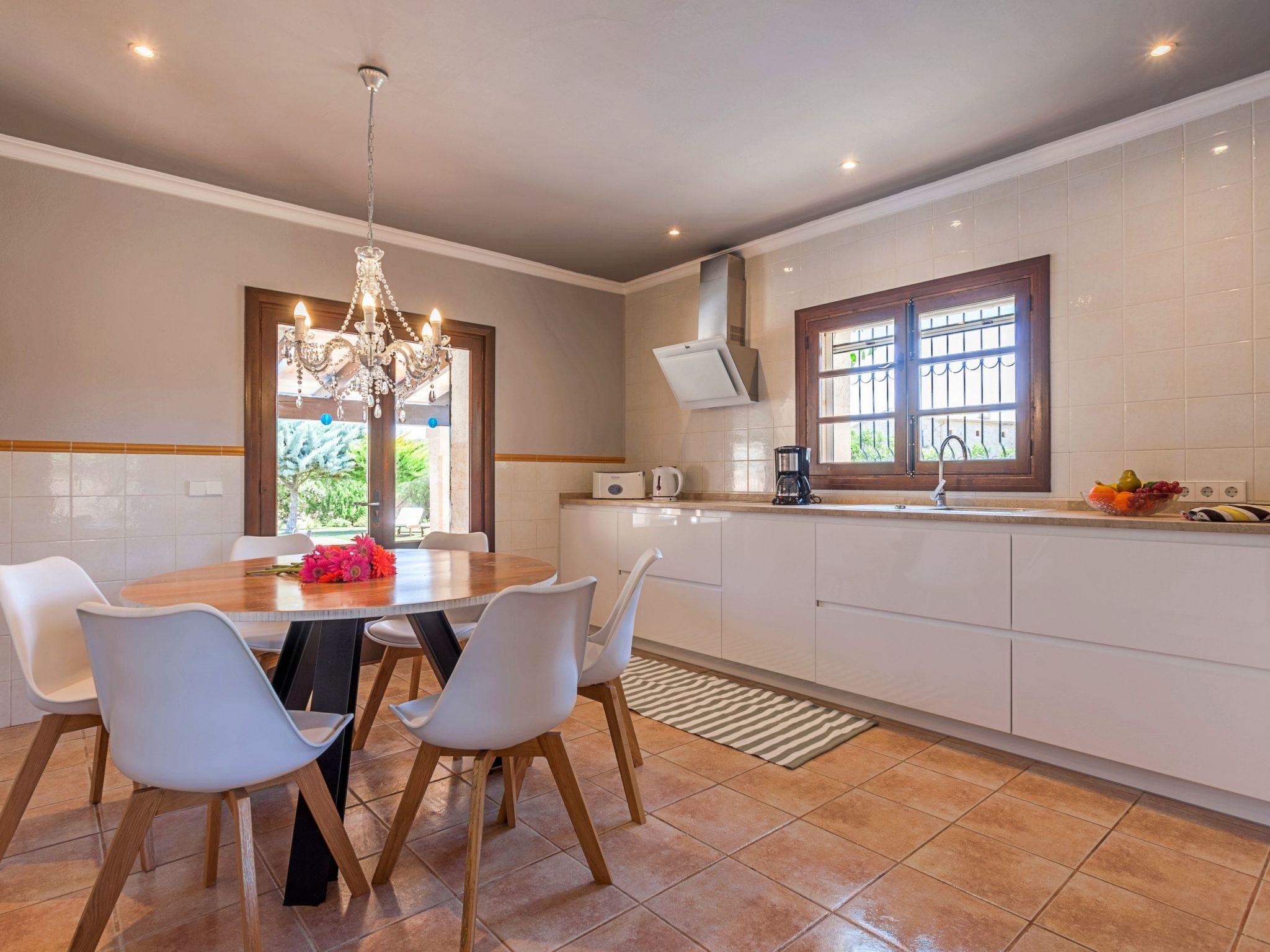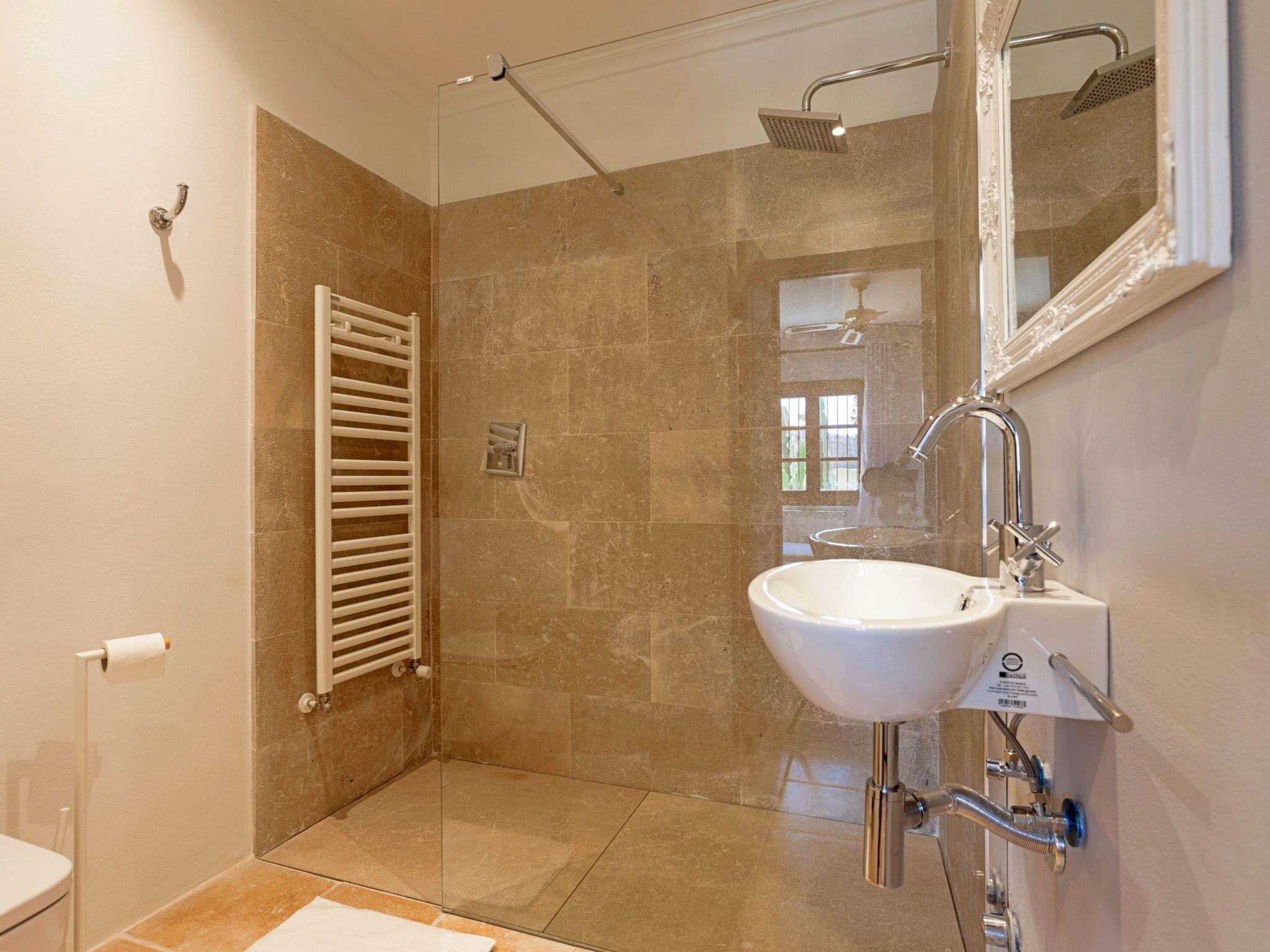 The interior of the villa is spread over one floor. The modern and spacious kitchen is equipped with all the necessary appliances, a breakfast table and chairs and has large doors leading out to the covered side terrace, as well as another door leading out to the covered front porch which is separated into two ambient areas. An outdoor dining area and a comfortable chill-out area complete with white wicker sofas. Between the kitchen and the living room is a separate dining area with a large natural wood table and chairs. Through the next stone archway is the living room, with its typical Mallorcan wooden beams, light neutral coloured sofas and wooden furniture, TV/SAT, DVD and WIFI. Again there is direct access to a covered outdoor porch with handmade table/bench and pouffes. A hallway leads to the master bedroom, with a wrought iron double bed, ceiling fan and en-suite shower room. This bedroom also has direct access to the pool area. The same hallway also leads to two double bedrooms, one of which has an en-suite shower room. The villa has another family bathroom.