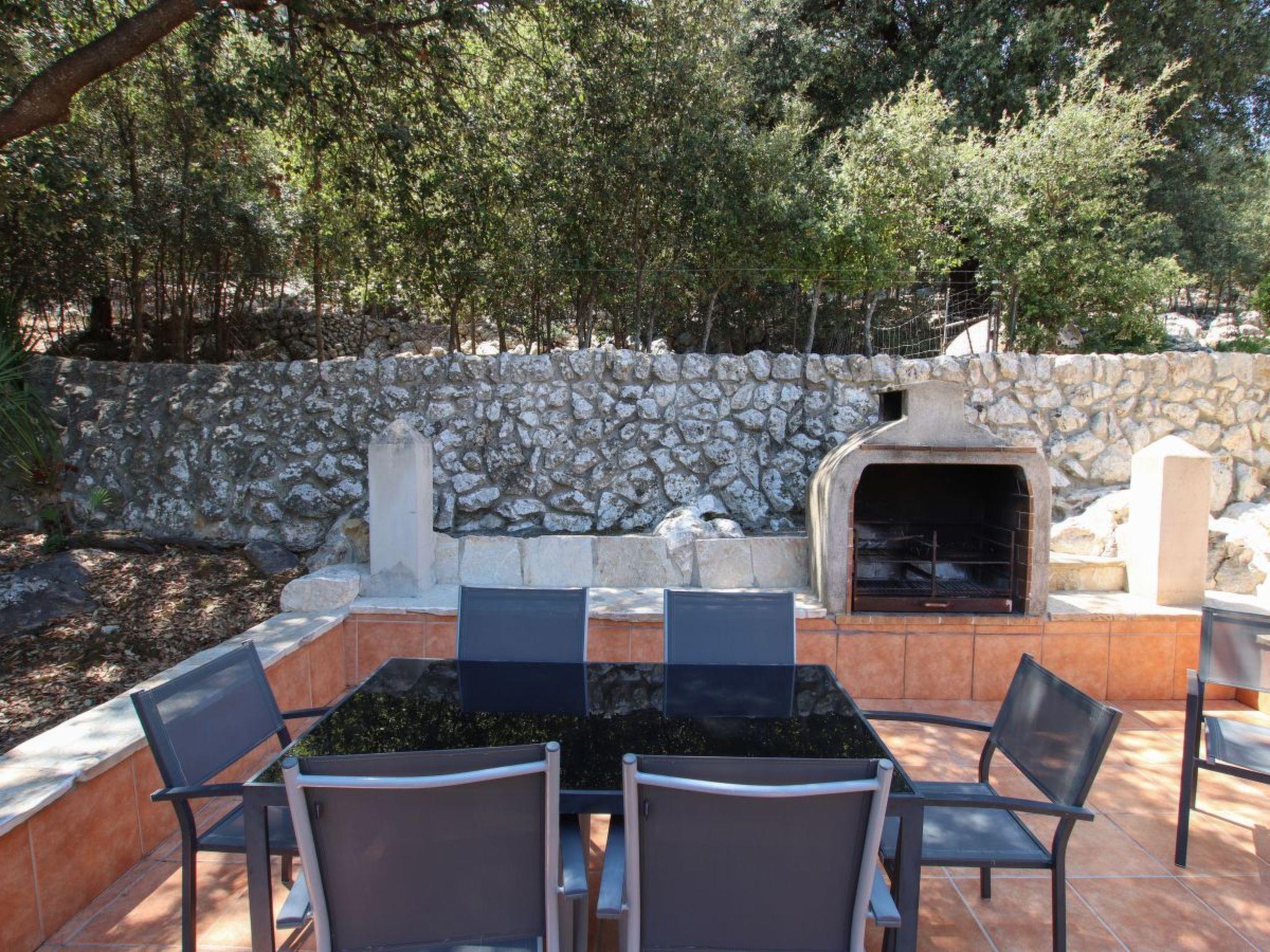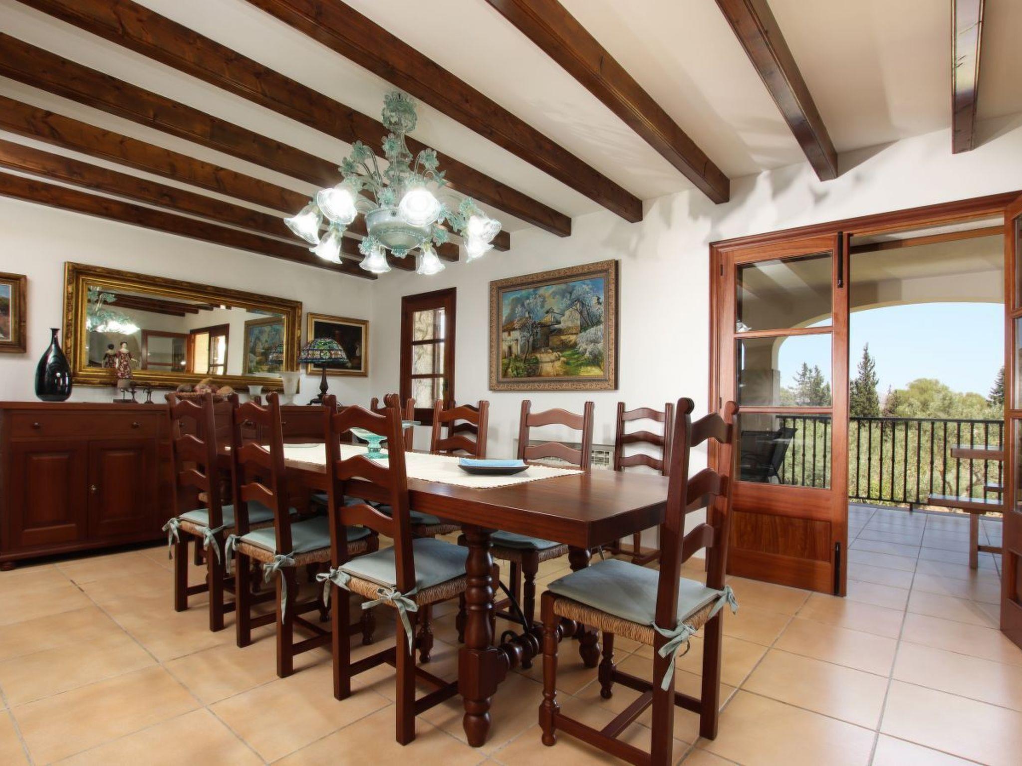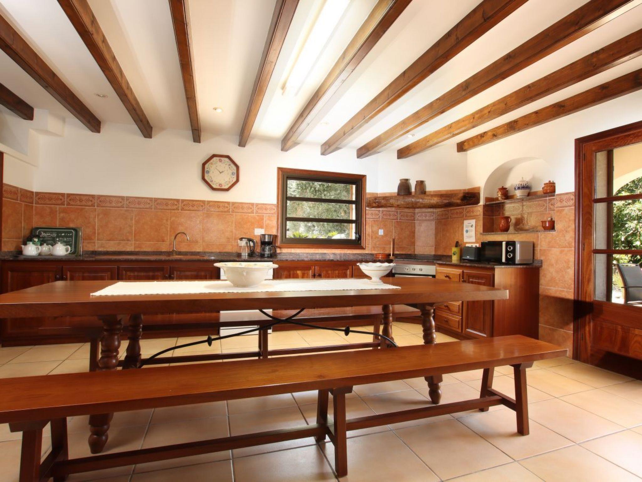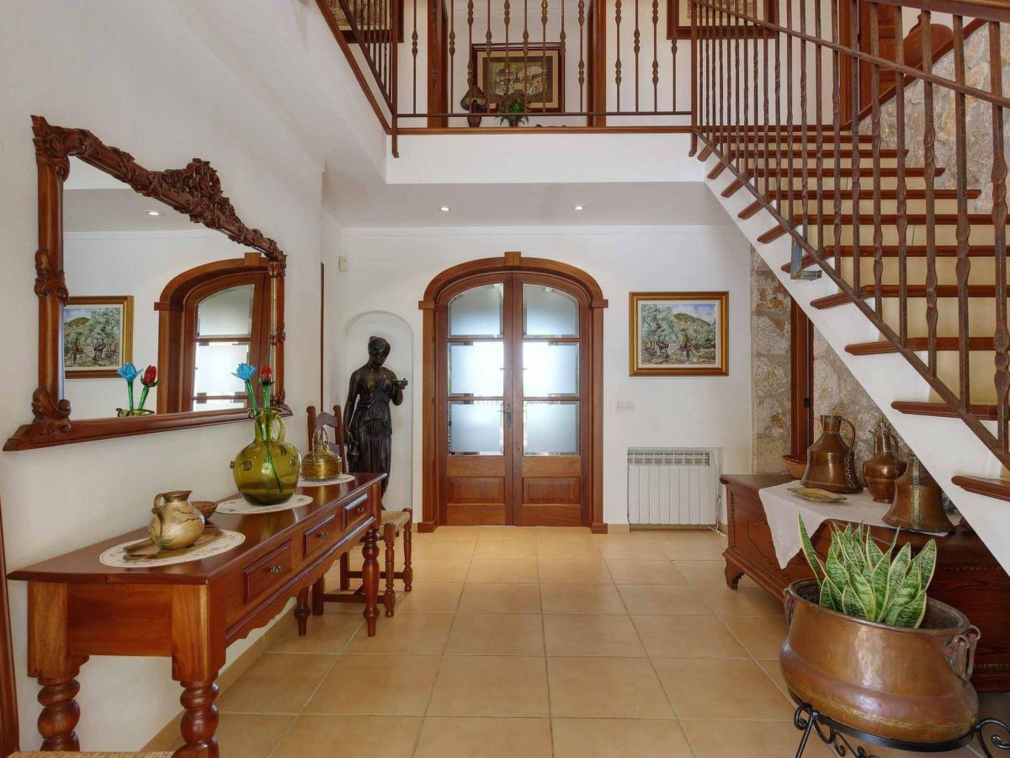 The main entrance is on the front covered terrace. Through an oak studded door we enter a beautiful, comfortable and modern family home distributed over two floors. The entrance is tastefully decorated with a beautiful statue, stone walls and arches. From here we enter the dining room with an elegant table, chairs and an ornamental fireplace. Also on the ground floor is the kitchen, superbly furnished and equipped in a modern style with sliding teak cupboards, electric cooker with ceramic hob, marble worktop, double sink, dishwasher, fridge-freezer and a 3 metre breakfast table with benches. In the lounge there are comfortable sofas, satellite TV and DVD player. From this room there is also access to the pool terrace.