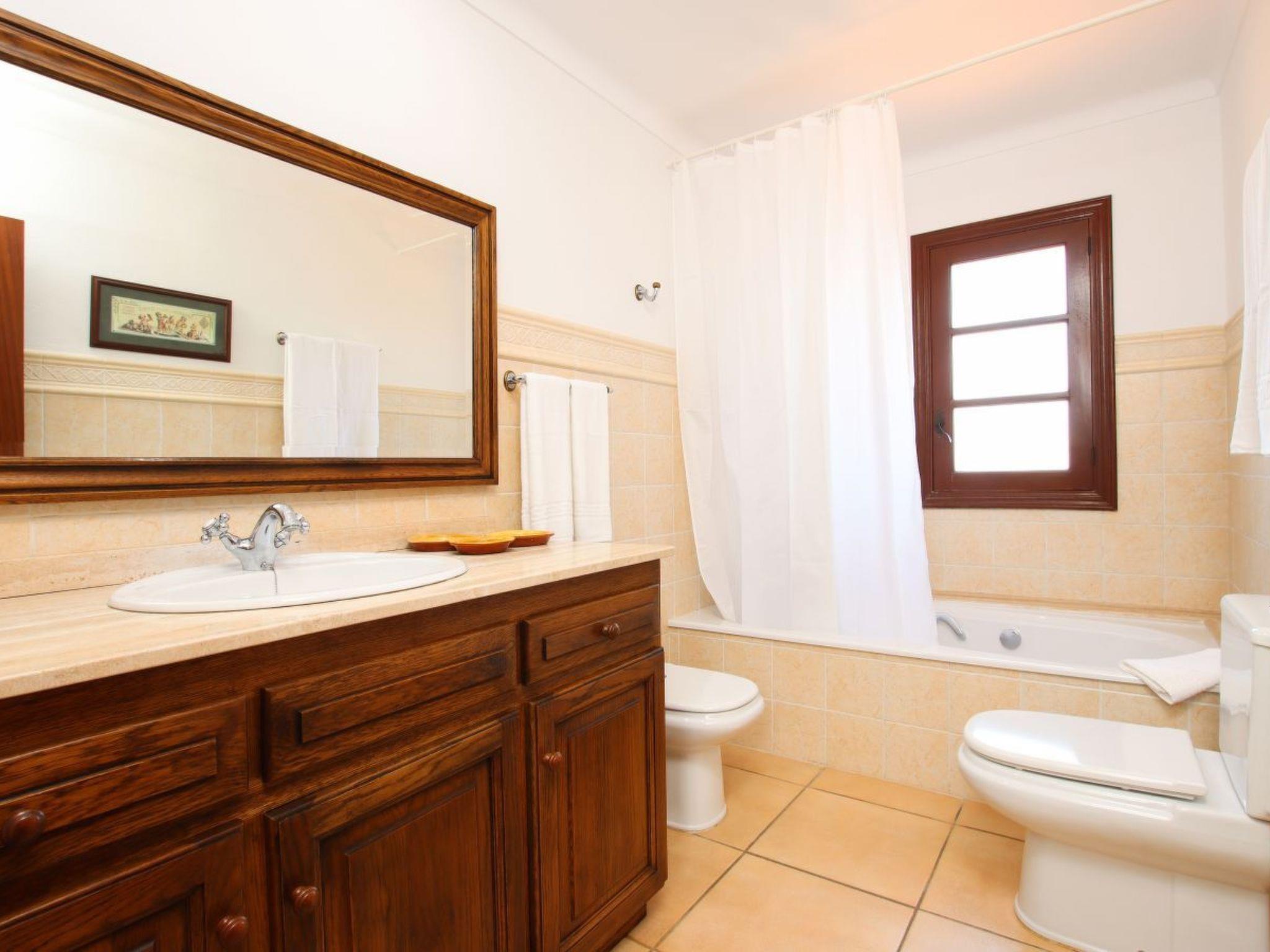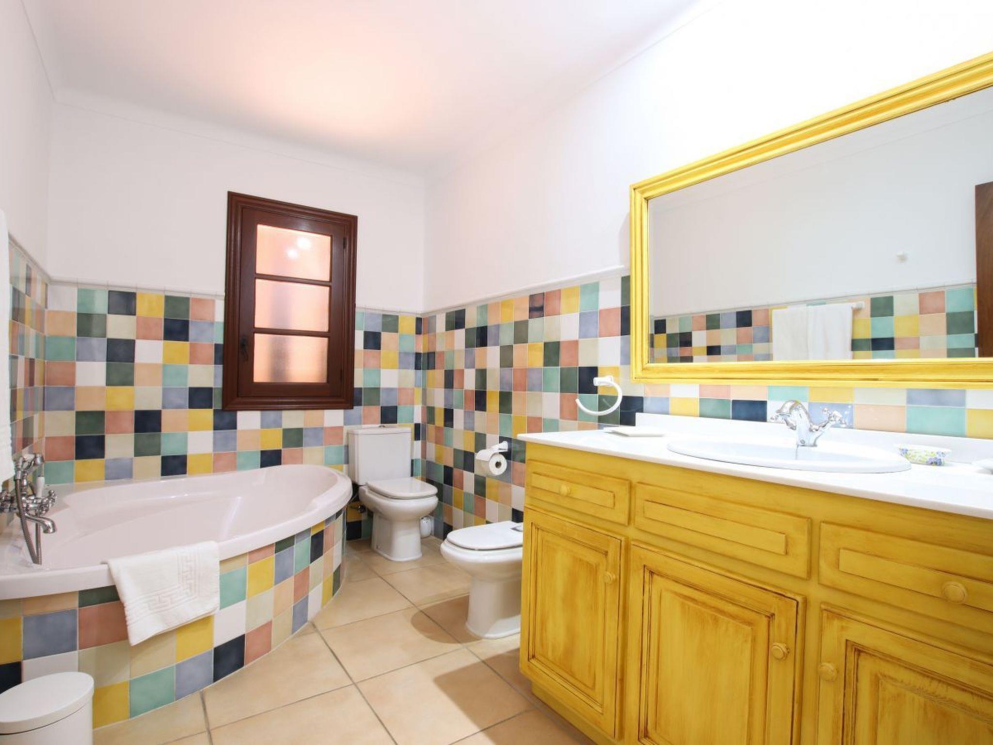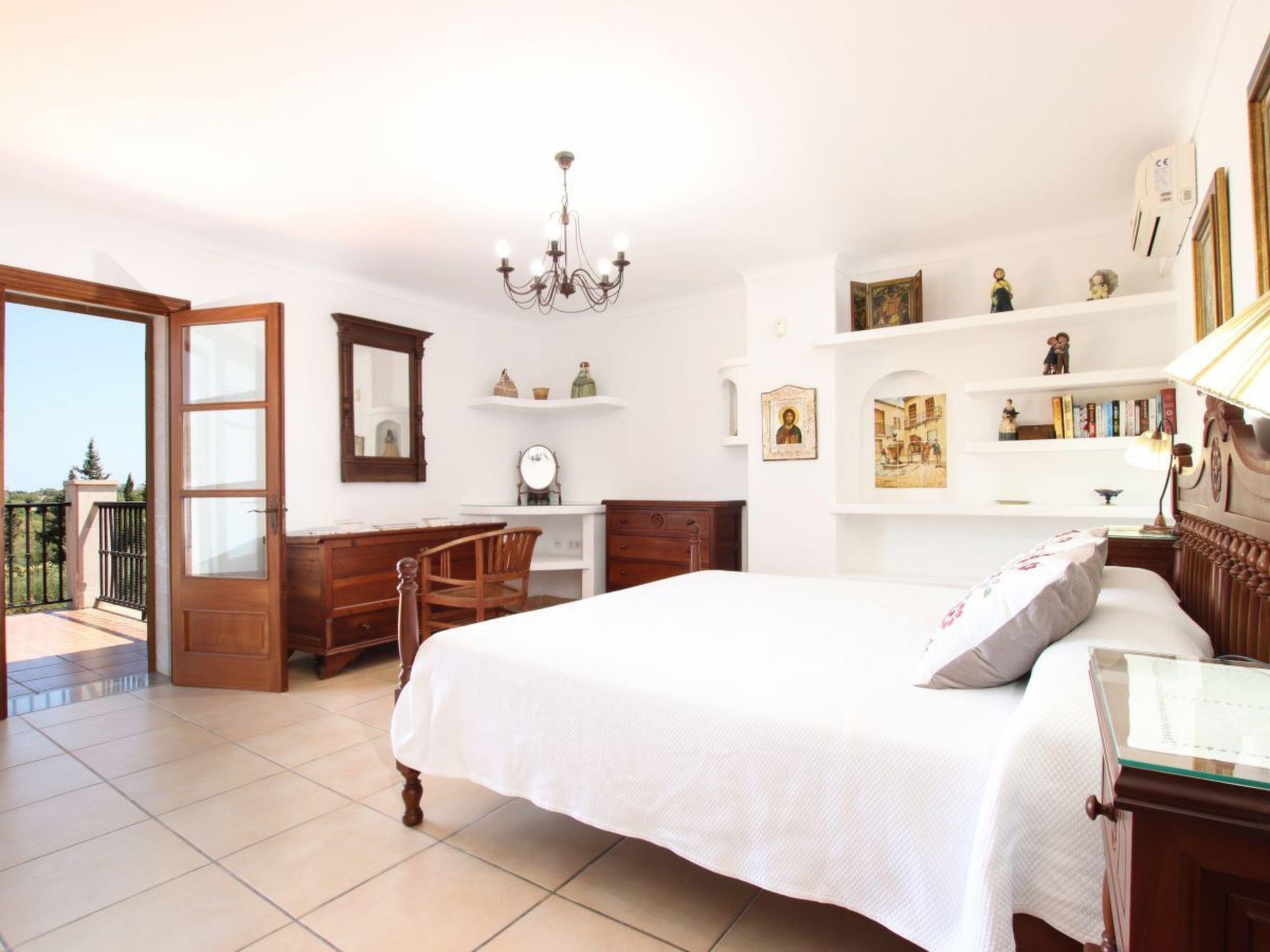 Upstairs is the master bedroom with king size mahogany bed, individual carved headboard and fitted wardrobes. This room has a beautiful en-suite bathroom and private furnished solarium with distant sea and mountain views. The second bedroom also has a king size bed, painted white, with carved headboard and fitted wardrobes and also a full en-suite bathroom and private furnished solarium, ideal for relaxing while enjoying the sunset views. The third bedroom, a superior double, has teak beds and fitted wardrobes, full bathroom and private furnished terrace overlooking the pool. The fourth bedroom also has two teak beds and fitted wardrobes, full bathroom and private sunbathing terrace with distant sea and mountain views. All bedrooms have air conditioning. Following energy saving and efficiency measures, this villa has programmed air conditioning, which can be used during midday and throughout the night.