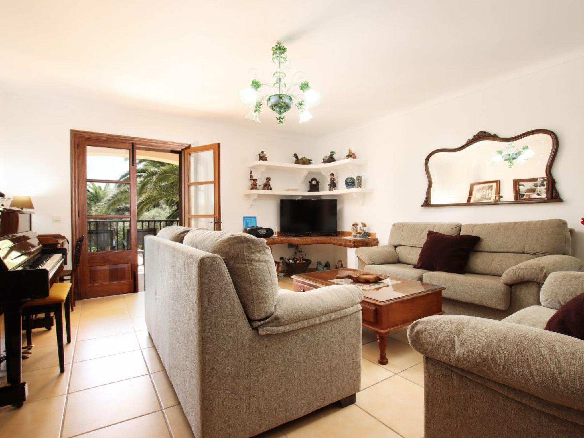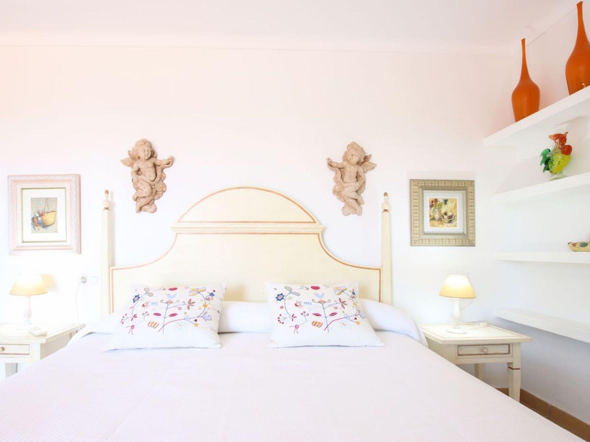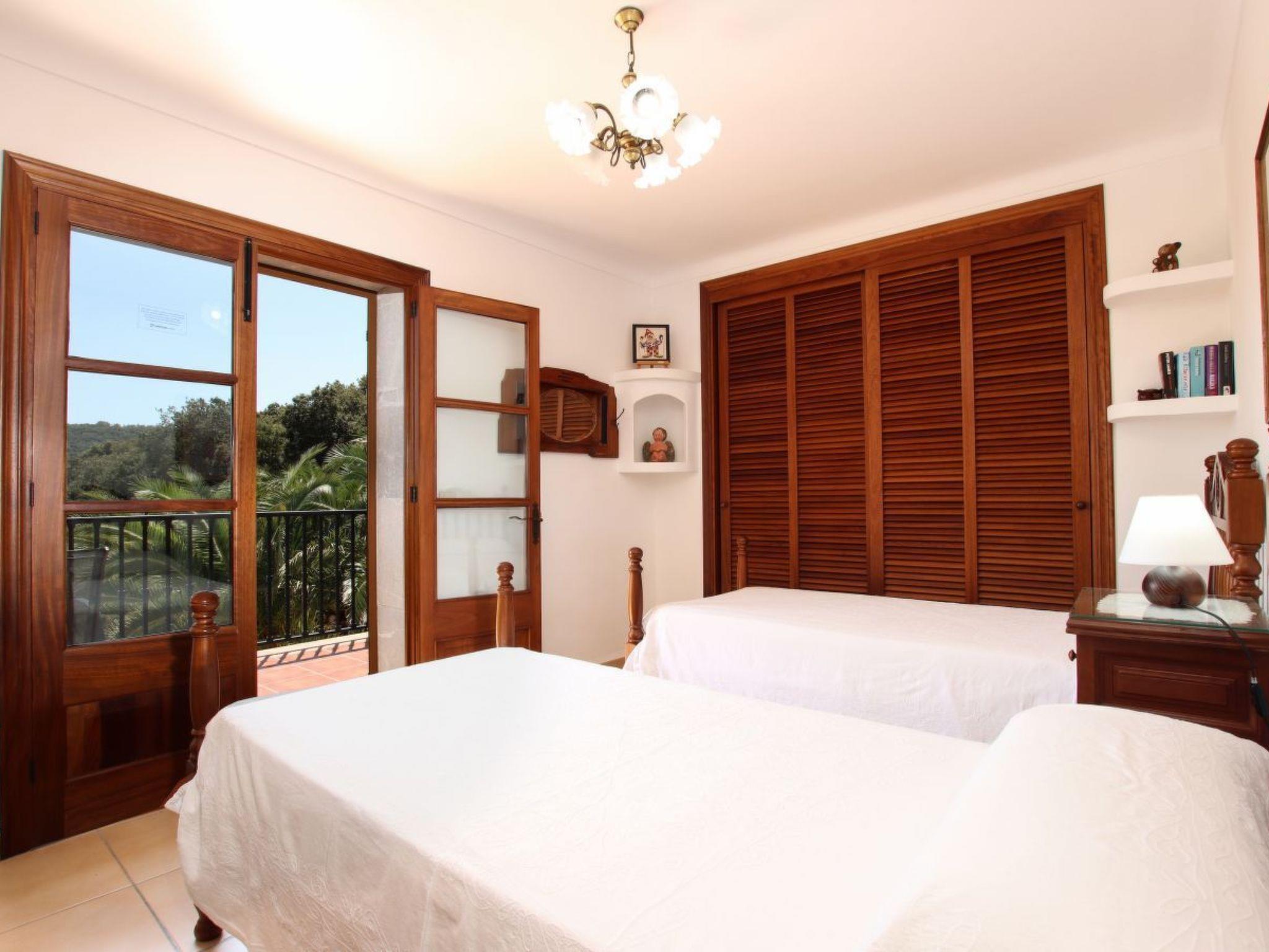 Upstairs is the master bedroom with king size mahogany bed, individual carved headboard and fitted wardrobes. This room has a beautiful en-suite bathroom and private furnished solarium with distant sea and mountain views. The second bedroom also has a king size bed, painted white, with carved headboard and fitted wardrobes and also a full en-suite bathroom and private furnished solarium, ideal for relaxing while enjoying the sunset views. The third bedroom, a superior double, has teak beds and fitted wardrobes, full bathroom and private furnished terrace overlooking the pool. The fourth bedroom also has two teak beds and fitted wardrobes, full bathroom and private sunbathing terrace with distant sea and mountain views. All bedrooms have air conditioning. Following energy saving and efficiency measures, this villa has programmed air conditioning, which can be used during midday and throughout the night.