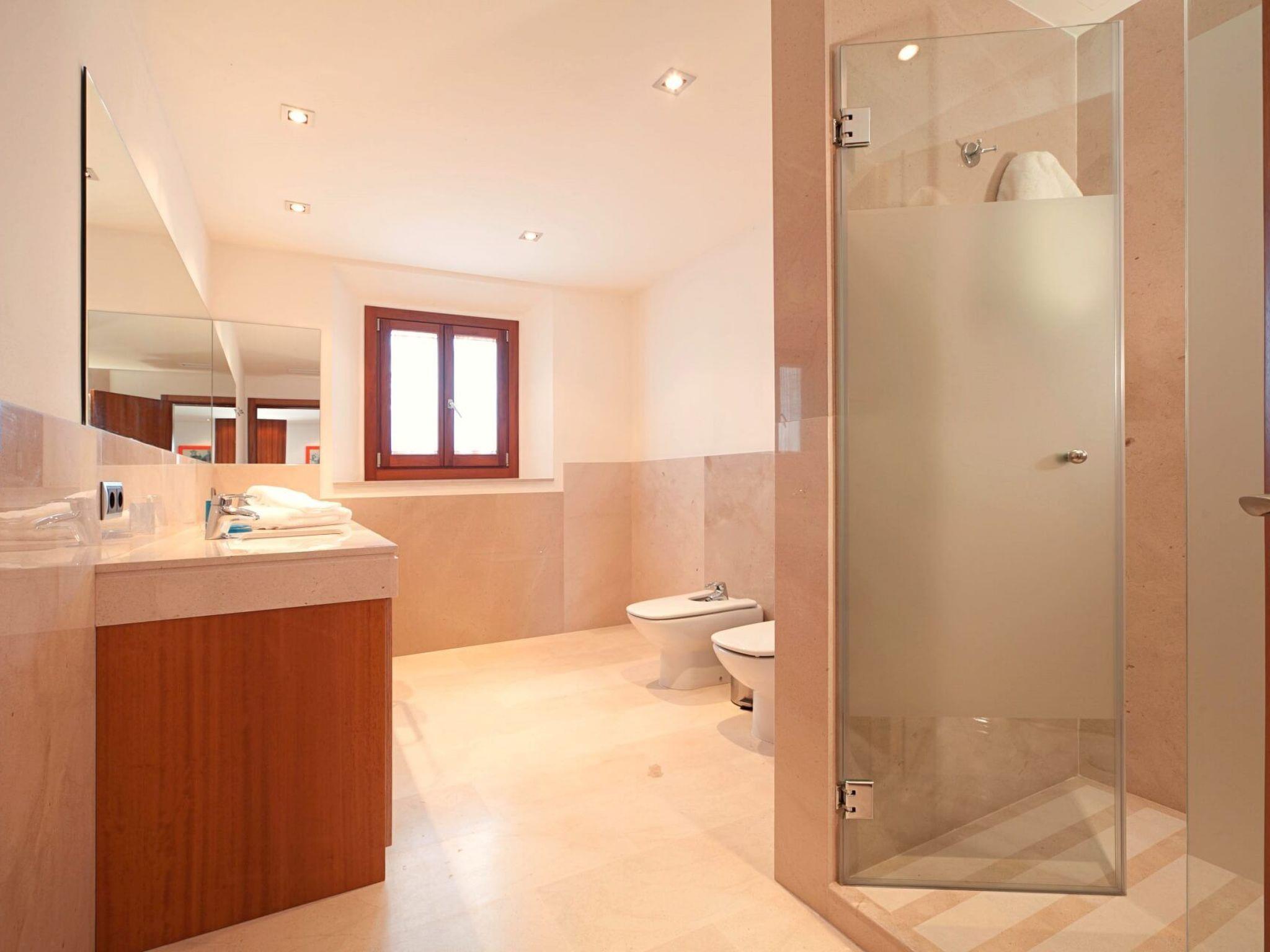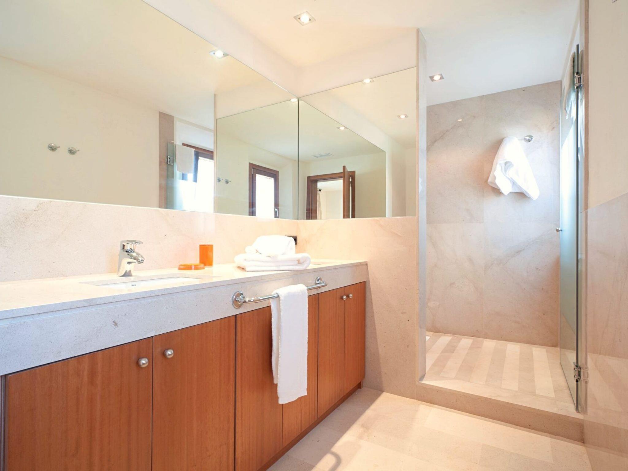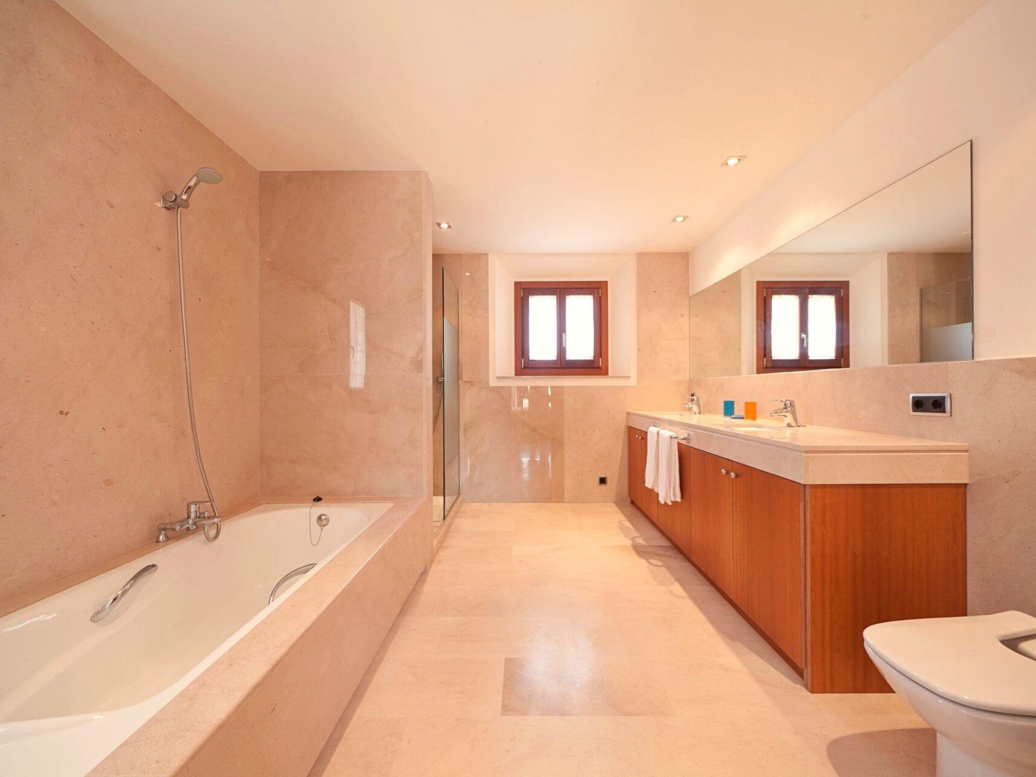 Upstairs there are 2 further bedrooms, one with a double bed and one with twin beds. Both have access to a panoramic terrace. The twin bedroom has its own en-suite bathroom with shower, while the double bedroom has a bathroom with bath and walk-in shower.