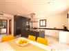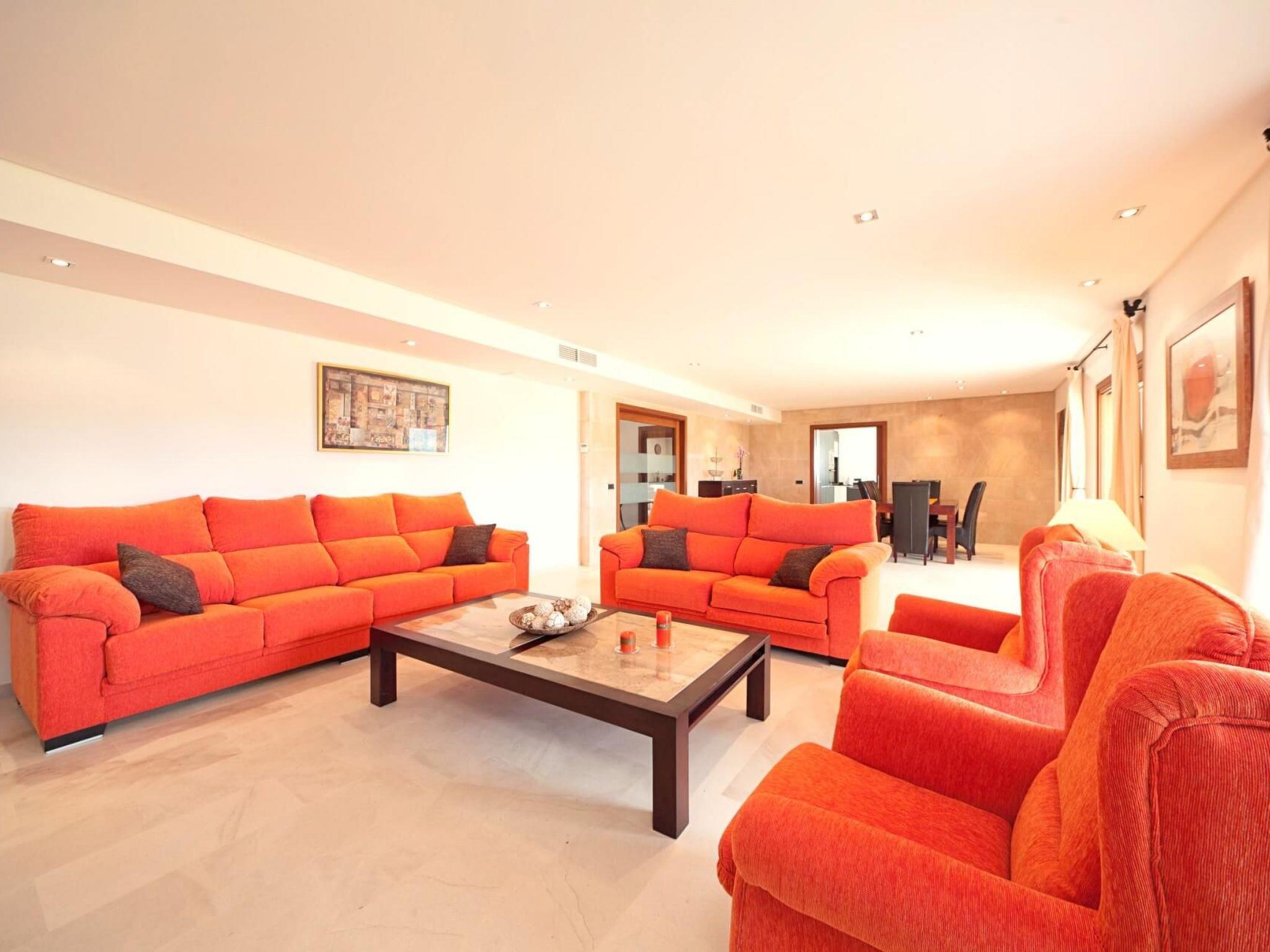 The large modern kitchen is fitted with all necessary appliances and includes a breakfast area which has been attractively furnished with an aluminium and glass table with bright orange chairs. There is also a walk-in utility room and a door leads directly onto the surrounding terrace. A large separate dining room/lounge is furnished with comfortable sofas and armchairs and an attractive wooden dining table, two sets of double glass doors lead out to the rear terrace. On this floor there is also a guest toilet and a double bedroom with its own flush bathroom.