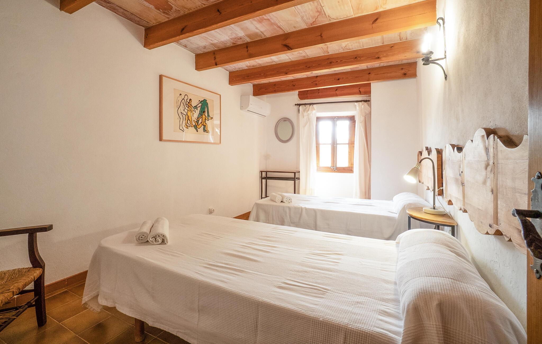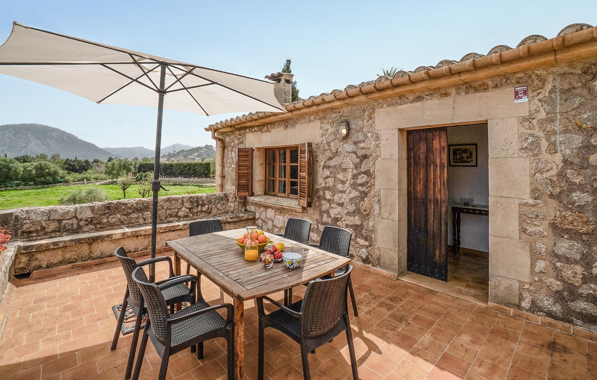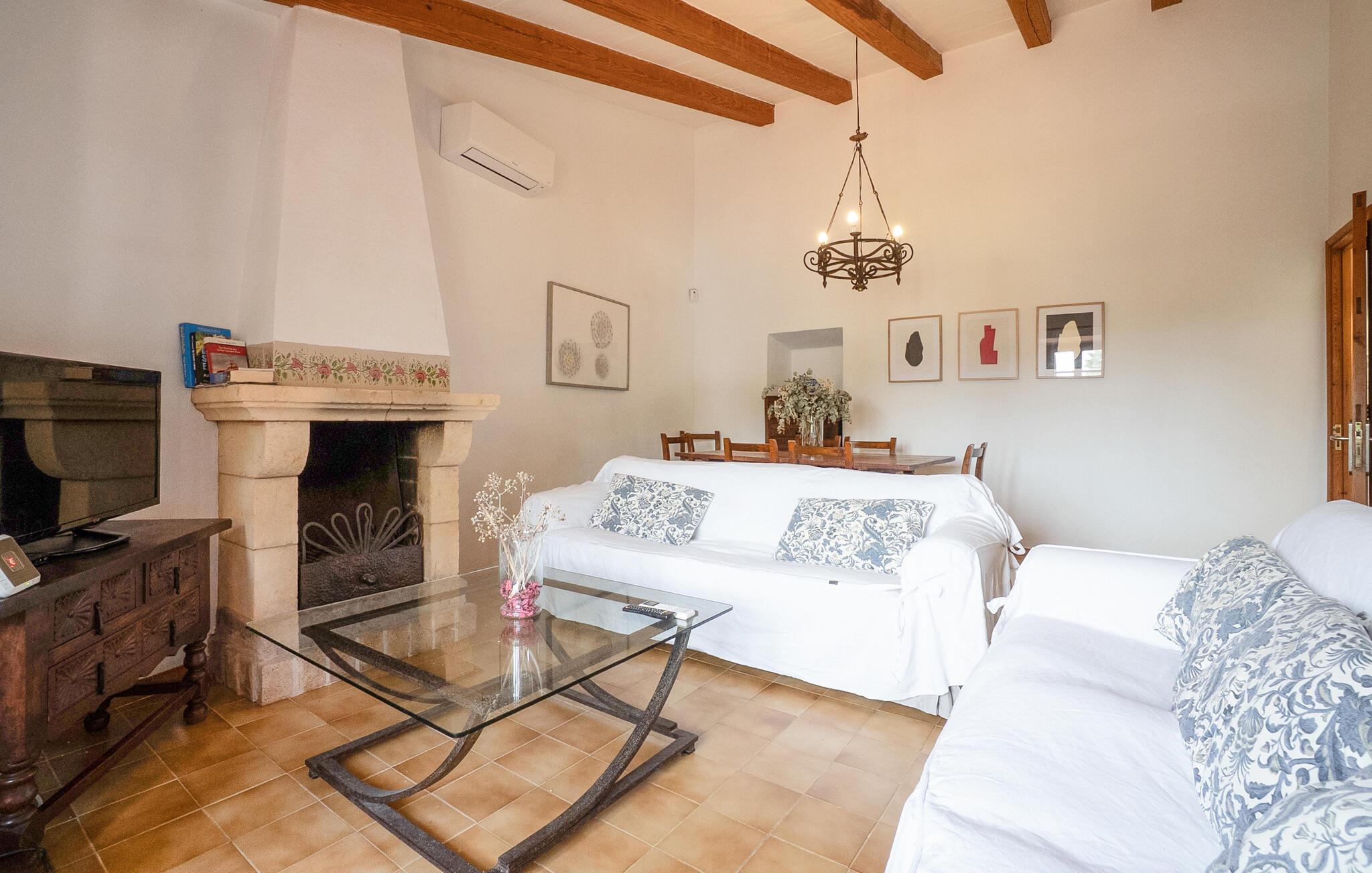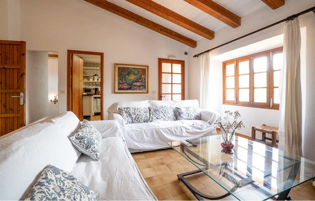 Denne smagfuldt indrettede, traditionelle naturstensfinca inviterer jer til en afslappende ferie i sine lyse og charmerende rum. Tilbered mallorcinske specialiteter i det veludstyrede køkken, og nyd dem ved det rustikke spisebord. Slut dagen af med et glas vin på den komfortable sofa, og stream jeres yndlingsserie.