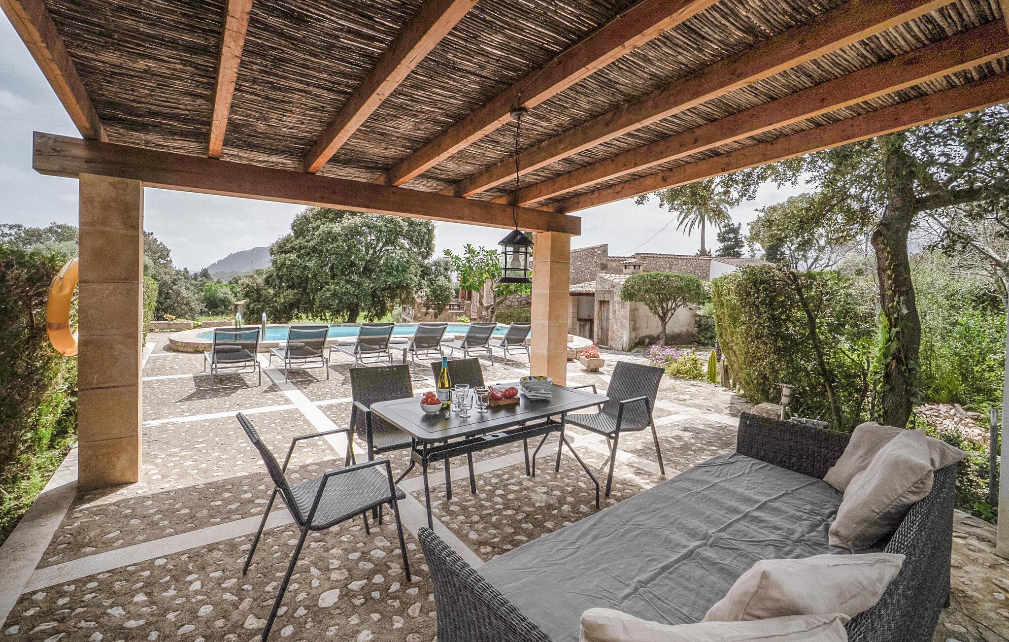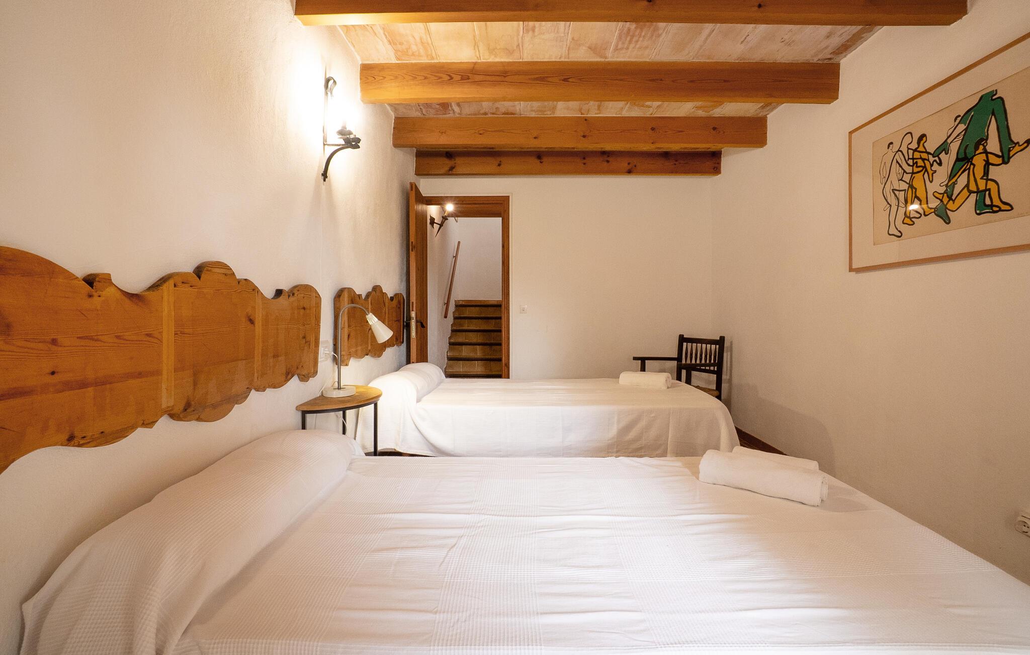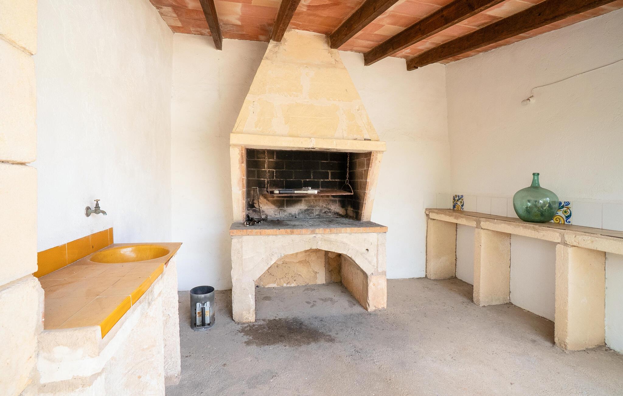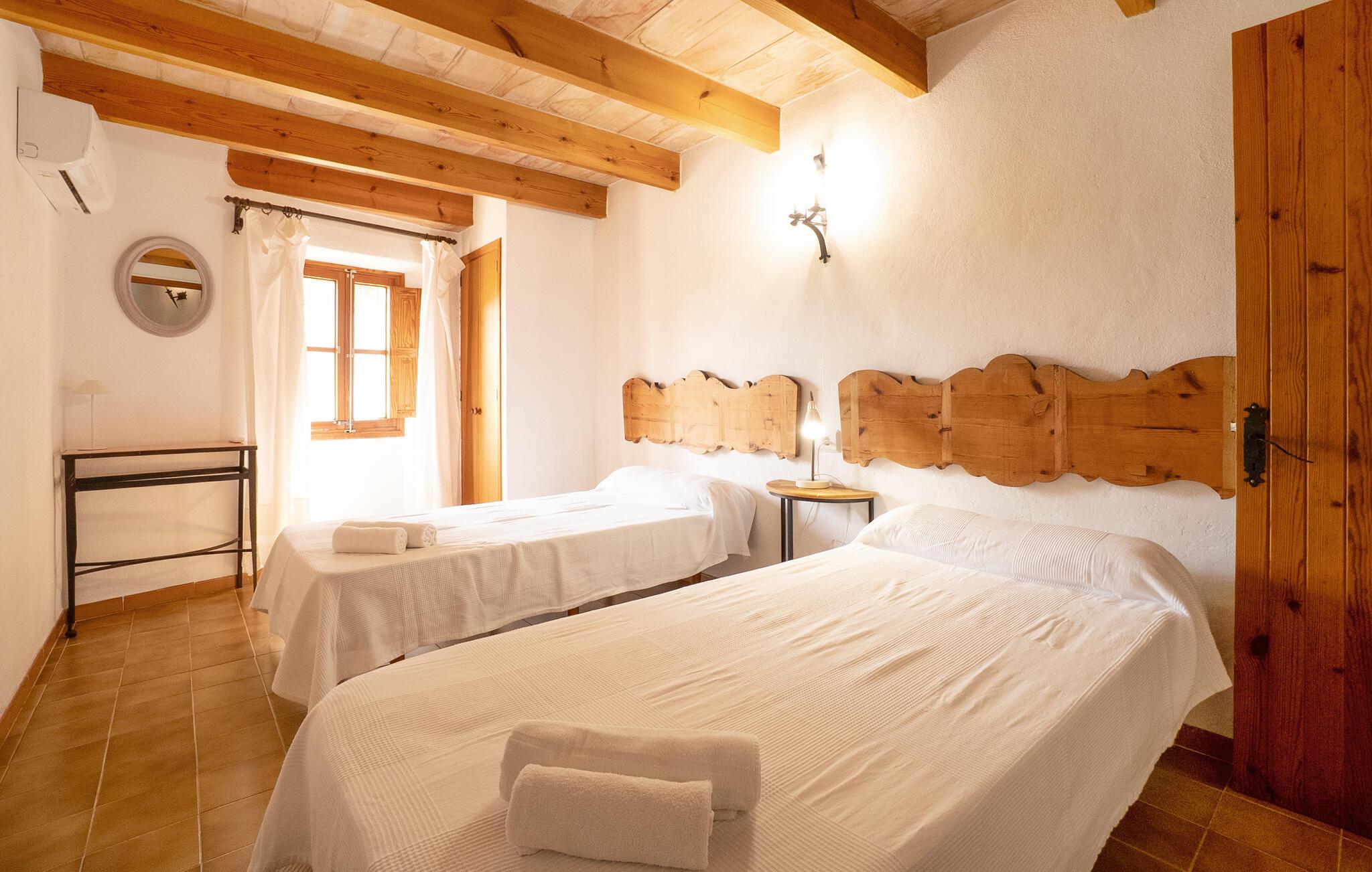 Denne smagfuldt indrettede, traditionelle naturstensfinca inviterer jer til en afslappende ferie i sine lyse og charmerende rum. Tilbered mallorcinske specialiteter i det veludstyrede køkken, og nyd dem ved det rustikke spisebord. Slut dagen af med et glas vin på den komfortable sofa, og stream jeres yndlingsserie.