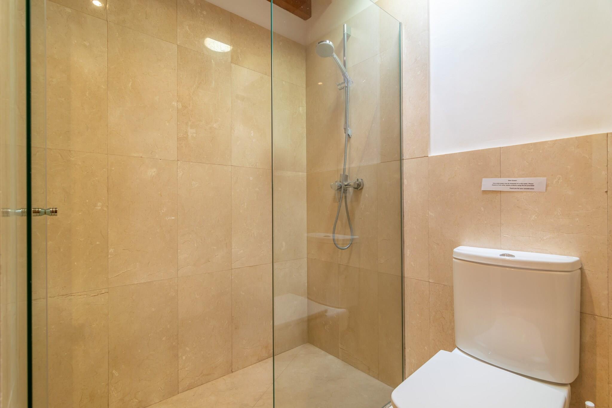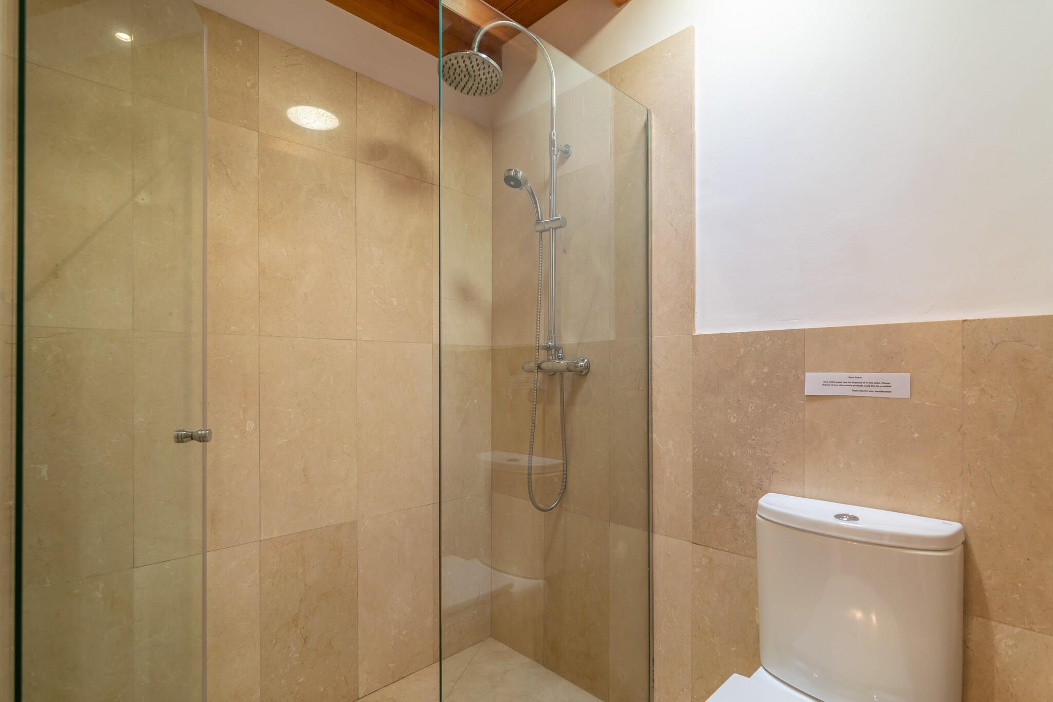 De fantastiske udendørs rum i denne villa er perfekte til at nyde middelhavslivsstilen. Den private klorpool måler 9 x 4 m (dybde: 1,1-2 m) og er omgivet af 8 liggestole til afslapning i solen. Verandaen er ideel til grillmad, mens terrassen indbyder til morgenmad eller et spil bordtennis. Den indhegnede grund sikrer total privatliv. Indvendigt byder villaen på komfort og funktionalitet. Det har en hyggelig stue med SAT-TV, en separat spisestue og et fuldt udstyret køkken med induktionskogeplader. De fire soveværelser har garderobeskabe - det ene med en dobbeltseng, de andre med to enkeltsenge. Der er fire badeværelser: tre en-suite med brusere og et med hydromassage badekar. Du vil også finde en barneseng, høj stol, vaskemaskine, strygejern og strygebræt. Kanaliseret AC kører fra 19:00. til 05:00 Ejendommen er beliggende mellem Pollença og Cala San Vicente, kun 3 km fra den nærmeste strand. Pollença er en charmerende historisk by, og Cala San Vicente kan prale af smukke bugter. Pollença Golf ligger kun 8,6 km væk. Arrangementer er ikke tilladt. Kæledyr er ikke tilladt. Udvendig parkering til 4 biler. Turistskat og depositum skal betales på stedet.