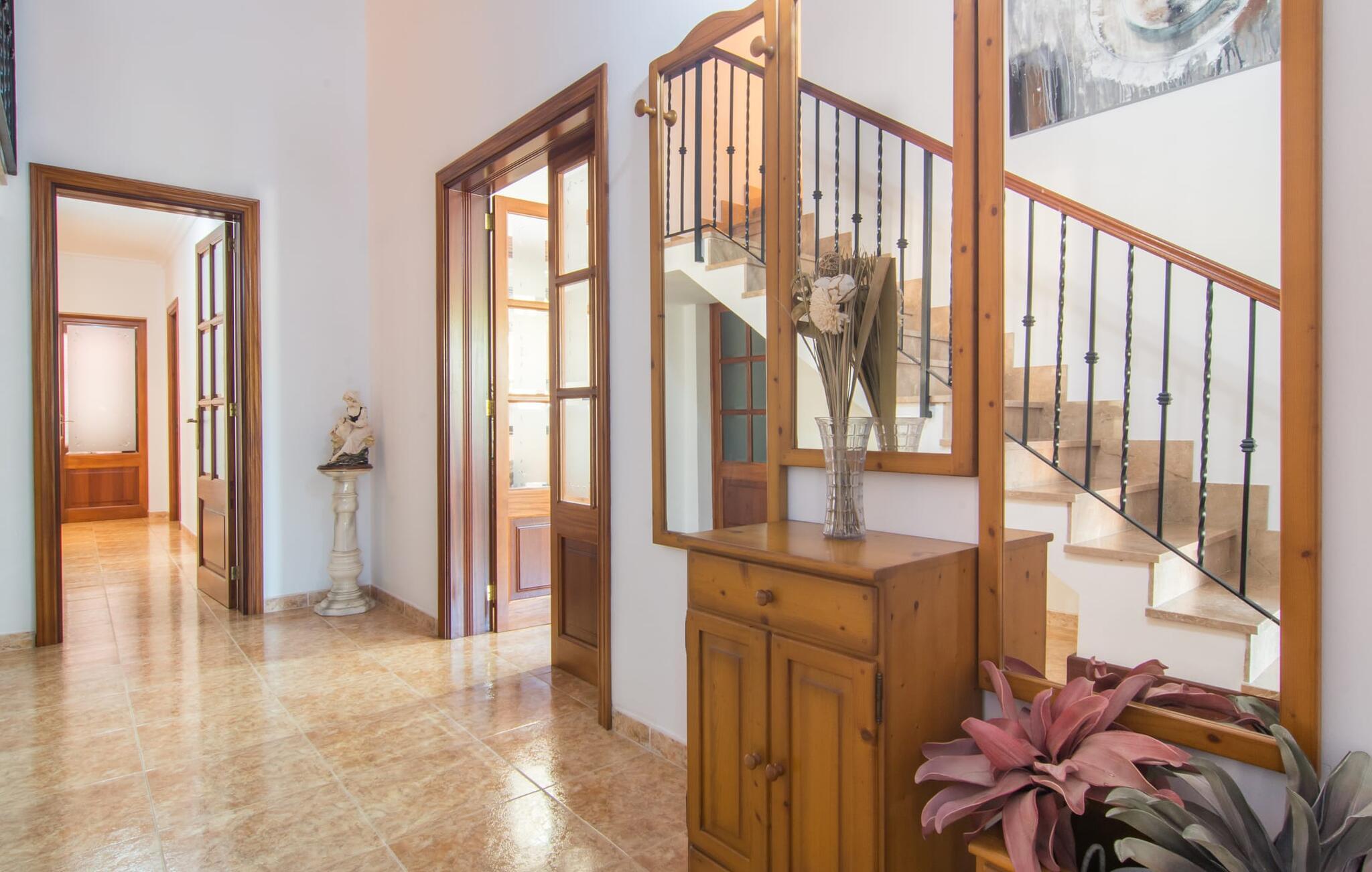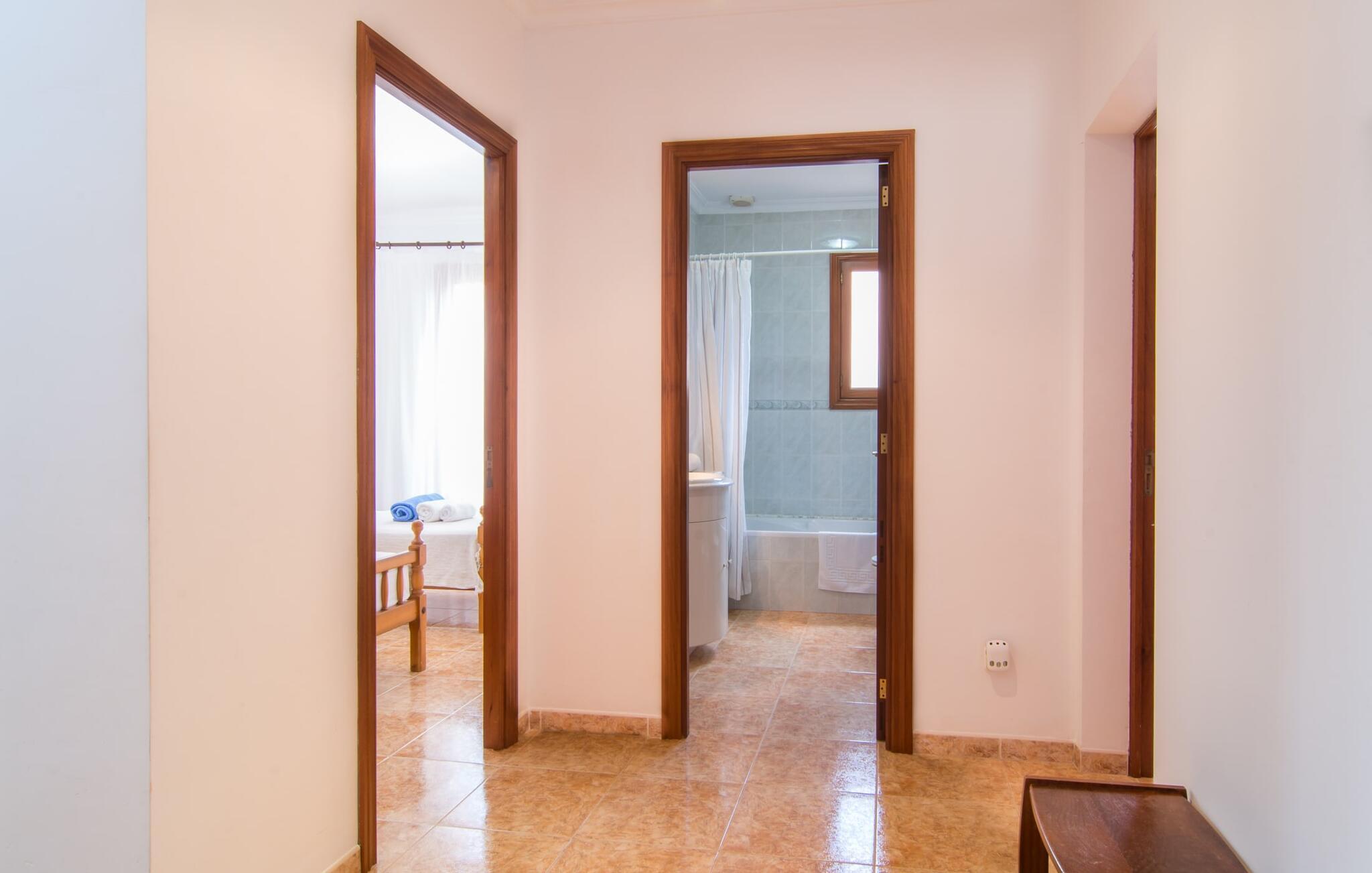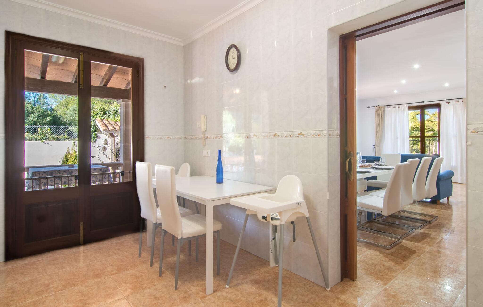 En grøn oase for enden af en lille blind vej midt i en populær kystby tæt på stranden – vi vil gerne introducere “Pomeres Nou” for jer. Den hvide byvilla er omgivet af typisk middelhavsvegetation med et urbant præg. Foran det indbydende hvide hus er der en bred veranda, der giver god plads til et loungehjørne. Herfra kan I nyde udsigten til den lille, men dejlige pool, som er indlejret i et rummeligt terrasseområde. Den er udstyret med komfortable liggestole til omfattende solbadning. Bygningens omgivende naturstensoverflade fuldender sammen med den overdækkede grillplads billedet af et perfekt afslappet feriehus med storbyflair. Der er naturligvis også spisepladsen, som I ikke kun kan bruge til at grille og afslutte happy hour-aftener, men også til en solid morgenmad først på dagen. Det familievenlige design er også tydeligt i legeredskaberne til børn og bordtennisbordet - sjovt for store og små. Ligesom udendørsområdet og selve Sa Coma med sin strand og promenade på tværs af byen, afspejler det indre af "Pomeres Nou" også et familievenligt design i det klimatiserede miljø med centralvarme. Omdrejningspunktet i det ukomplicerede hus er det indbydende opholds- og spiseområde, der udover trævinduer fra gulv til loft præsenterer en blanding af mallorcanske klassikere og en portion terracotta fliser samt et moderne touch med lysarmaturer integreret i loftet og smarte møbler. På køligere dage eller om aftenen inviterer sofaområdet til at dase eller nyde en sprudlende spilleaften. En skydedør forbinder til køkkenet, som også giver direkte adgang til verandaen. I har bevidst besluttet jer for at være selvforsynende på jeres ferie, så I nemt kan tilberede de friske, aromatiske og velsmagende grøntsager og frugter, som I køber på det ugentlige marked eller lokale producenters markeder - og det fuldt udstyrede køkken vil gerne hjælpe jer med dette. En høj stol er naturligvis til rådighed, ligesom to børnesenge i to af de tre dobbeltværelser. Det stille værelse med to enkeltsenge er perfekt til de større børn i gruppen, hvorfor to familier også kan nyde en ferie sammen her. I får helt sikkert lyst til at tage et luksuriøst bad i et af de to badeværelser med brusearmaturer - bare tag lidt tid for jer selv. I er trods alt på ferie og kan slappe af. Især efter en begivenhedsrig dag med udflugter! Regionen omkring Mallorcas østkyst er kendt blandt gæster for sit mangfoldige udvalg af fritidsaktiviteter. Den centralt beliggende villa "Pomeres Nou" i Sa Coma nyder også godt af dette. Daglige aktiviteter inkluderer helt sikkert en gåtur ind til byen for at shoppe, et besøg på en restaurant eller en afslappende gåtur langs stranden til nabobyen S'Illot. I kan også besøge safariparken og planlægge en tur til drypstensgrotterne i Porto Cristo. Ud over adskillige vandsportsaktiviteter vil jeres afslappede sportsprogram helt sikkert også omfatte vandreture til attraktive destinationer som Punta de N'Amer. Udbuddet af aktiviteter er varieret - men I ved bestemt bedst, hvordan I bruger jeres fritid sammen med venner og/eller familie. Den familievenlige villa "Pomeres Nou" byder på en bred vifte af muligheder for at slappe af. Den smukke byvilla ligger i den populære kystby Sa Coma mellem safariparken og havet i et velholdt kvarter. I kan gøre jeres indkøb i gåafstand - det samme gør sig gældende for at besøge restauranter eller barer, hvoraf mange ligger direkte på den attraktive strandpromenade. Havet og stranden er også inden for gåafstand. Bemærk venligst, at denne ejendom ikke accepterer ungdomsgrupper eller polterabender. En ungdomsgruppe på denne ejendom består af personer på 21 år eller derunder. Book ikke denne ejendom, hvis I er en ungdomsgruppe eller en polterabendgruppe, da jeres reservation vil blive afvist, når den er booket, hvilket også kan være tilfældet ved ankomst til ejendommen eller under jeres ophold, og I vil ikke modtage en refusion.