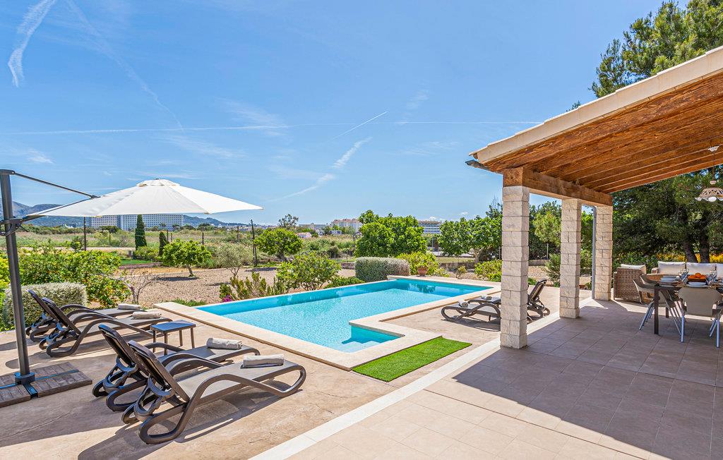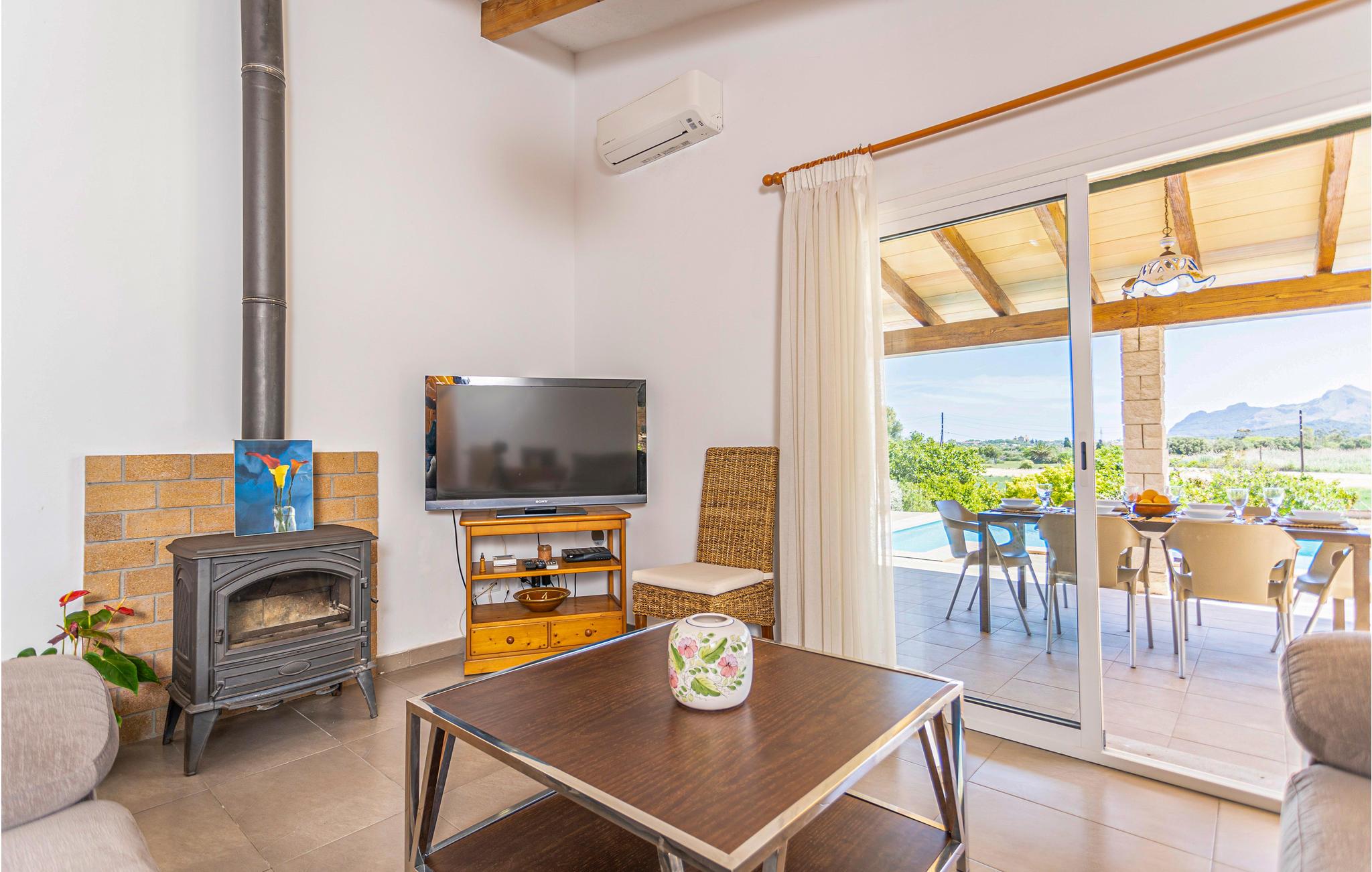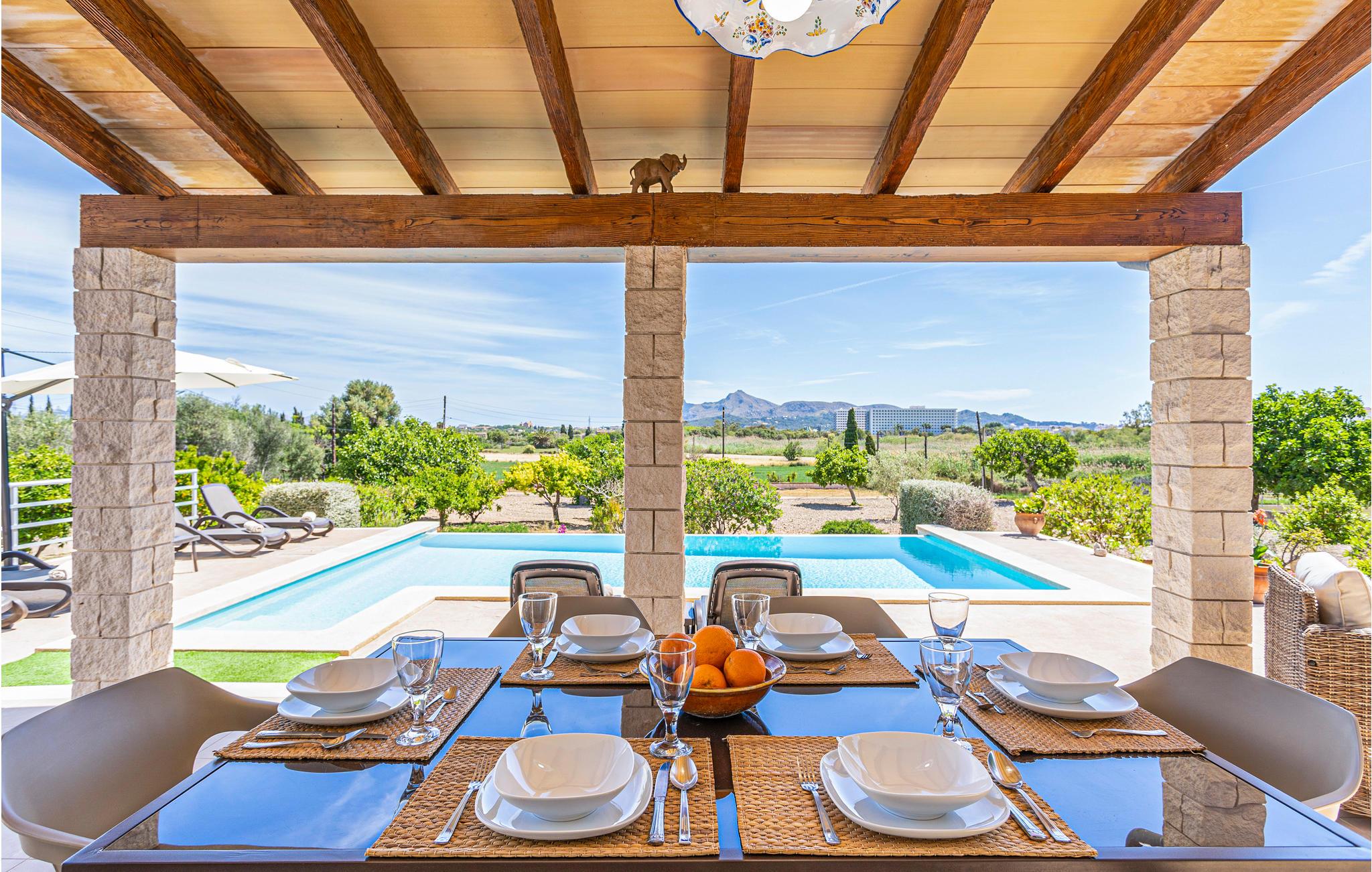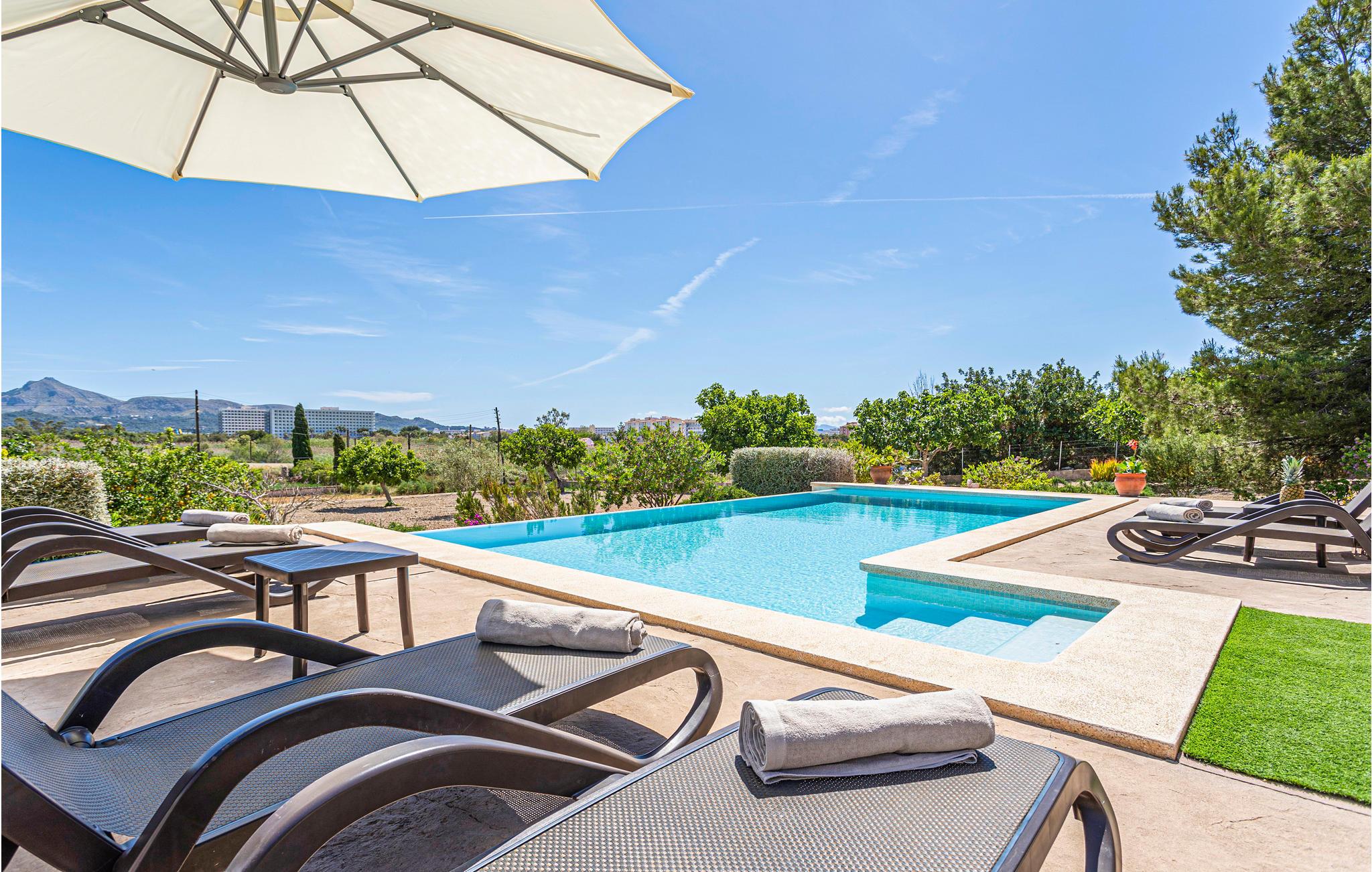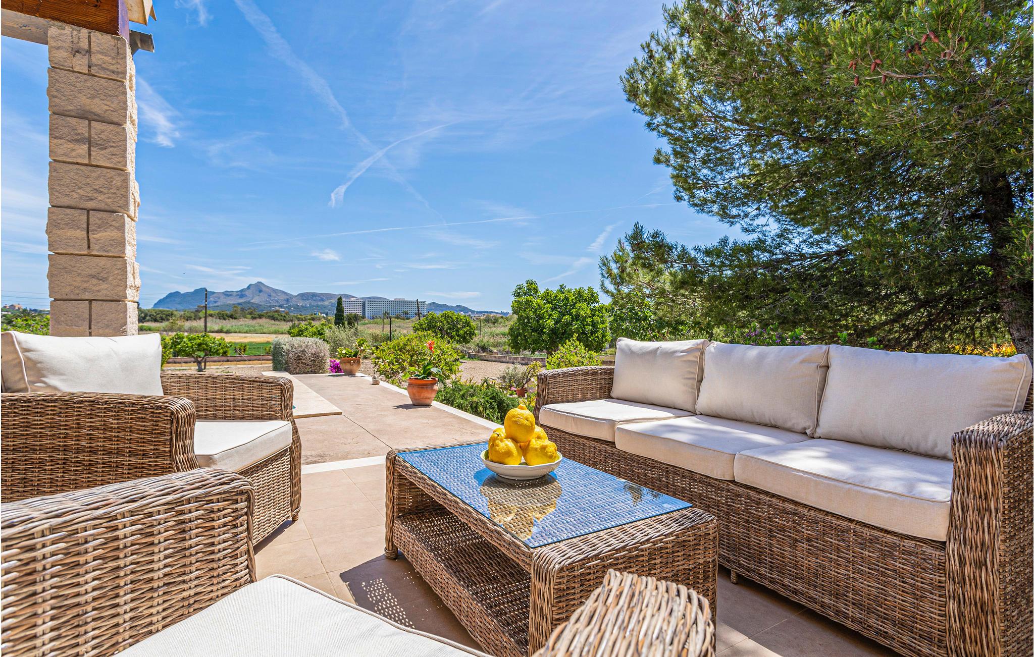 En praktisk finca i stueplan med fri udsigt over de vide marker og Tramuntanas imponerende bjergkæde. Nyd jeres måltider til den imponerende udsigt på den hyggelige terrasse omkring den moderne overløbspool. Denne er udstyret med skånsom og særdeles hudvenlig rens ved salt og osmose. Der er kun 2 km til en af de langeste og dejligste sandstrande på øen, der er meget levende i højsæsonen, og hvor der venter jer mange restauranter, barer og indkøbsmuligheder. Ejeren holder nogle høns på bagsiden af grunden.