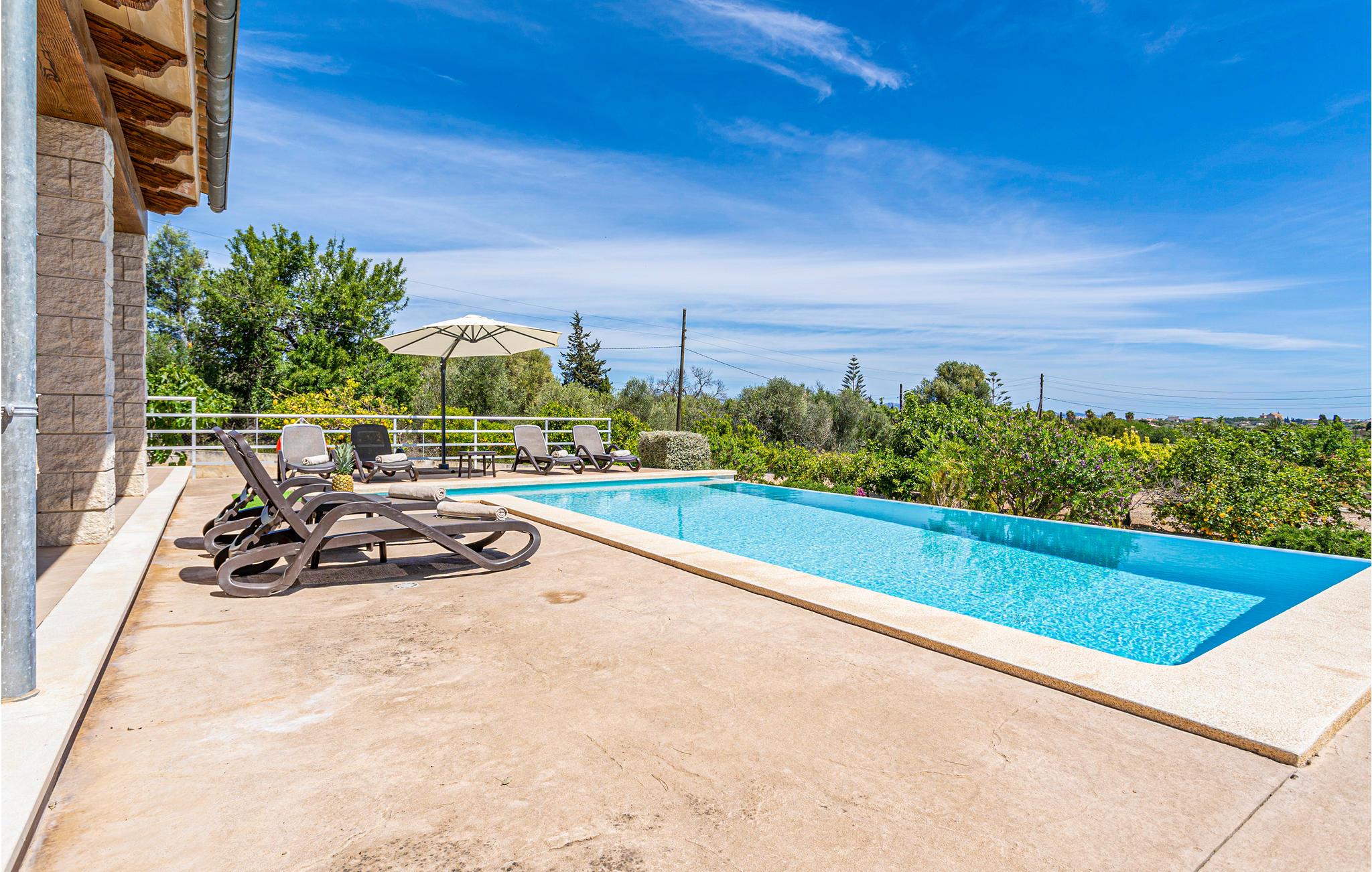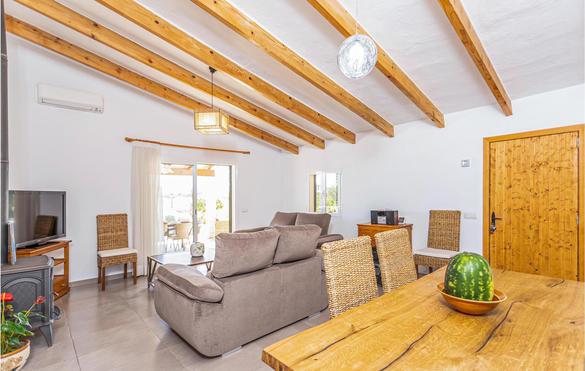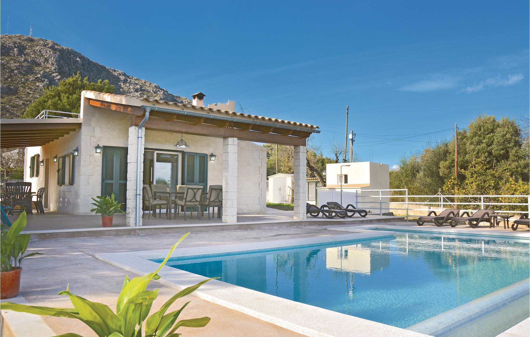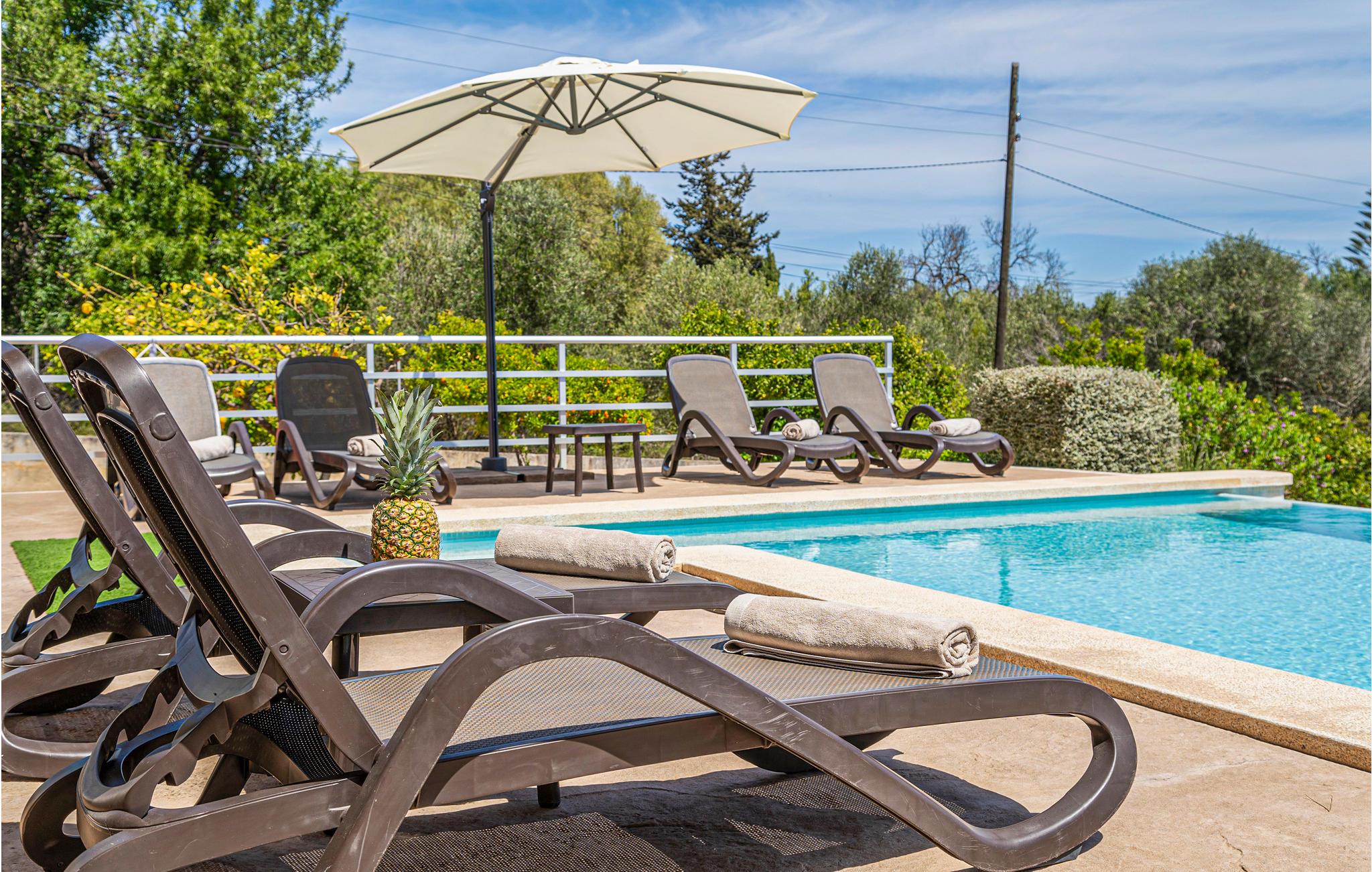 En praktisk finca i stueplan med fri udsigt over de vide marker og Tramuntanas imponerende bjergkæde. Nyd jeres måltider til den imponerende udsigt på den hyggelige terrasse omkring den moderne overløbspool. Denne er udstyret med skånsom og særdeles hudvenlig rens ved salt og osmose. Der er kun 2 km til en af de langeste og dejligste sandstrande på øen, der er meget levende i højsæsonen, og hvor der venter jer mange restauranter, barer og indkøbsmuligheder. Ejeren holder nogle høns på bagsiden af grunden.