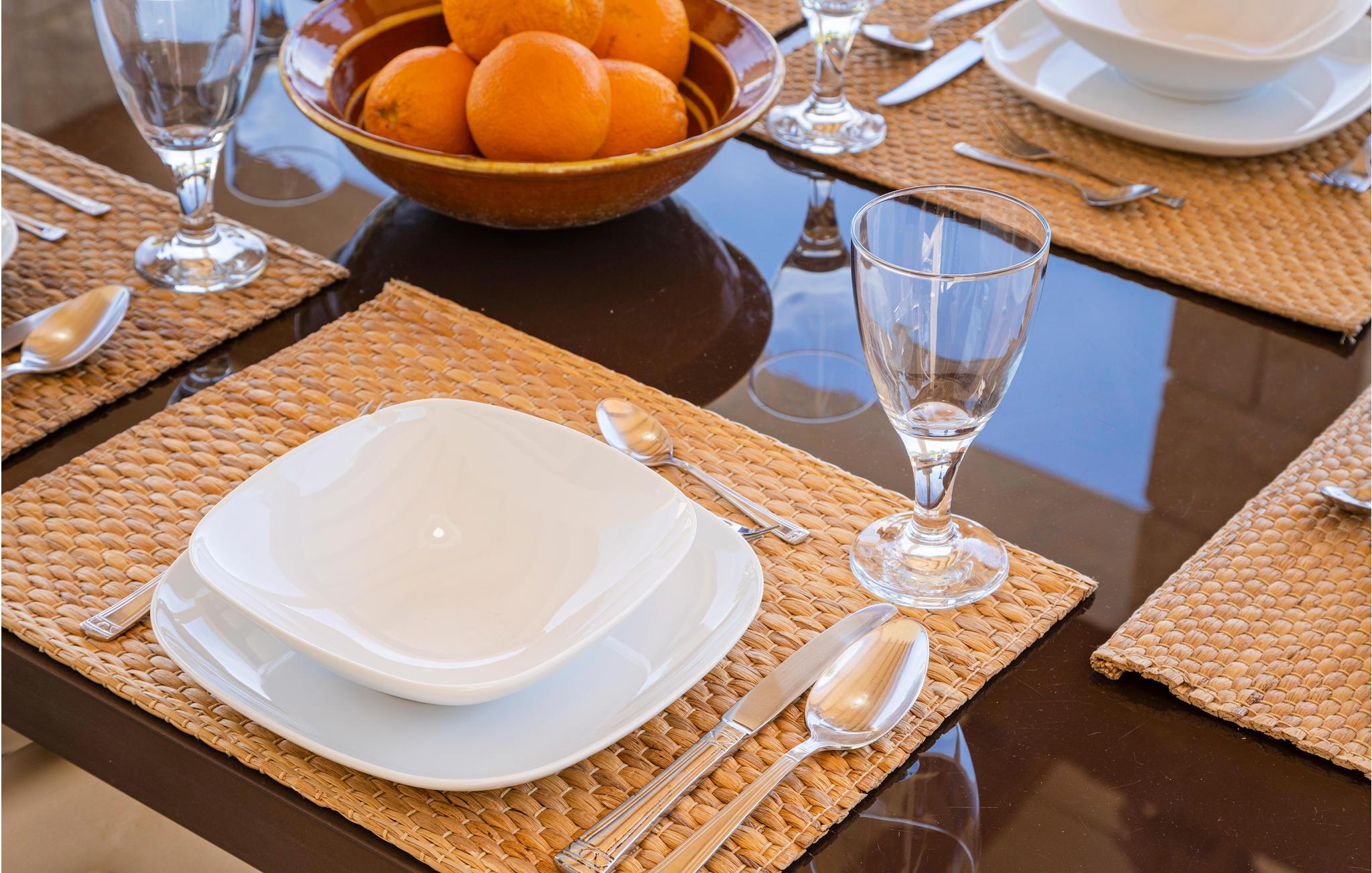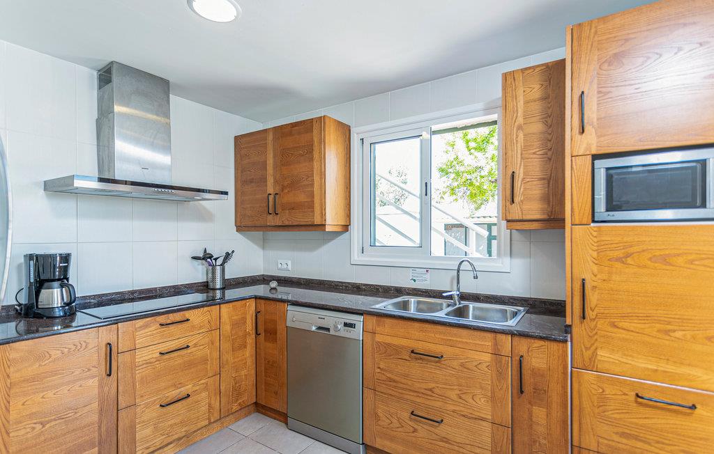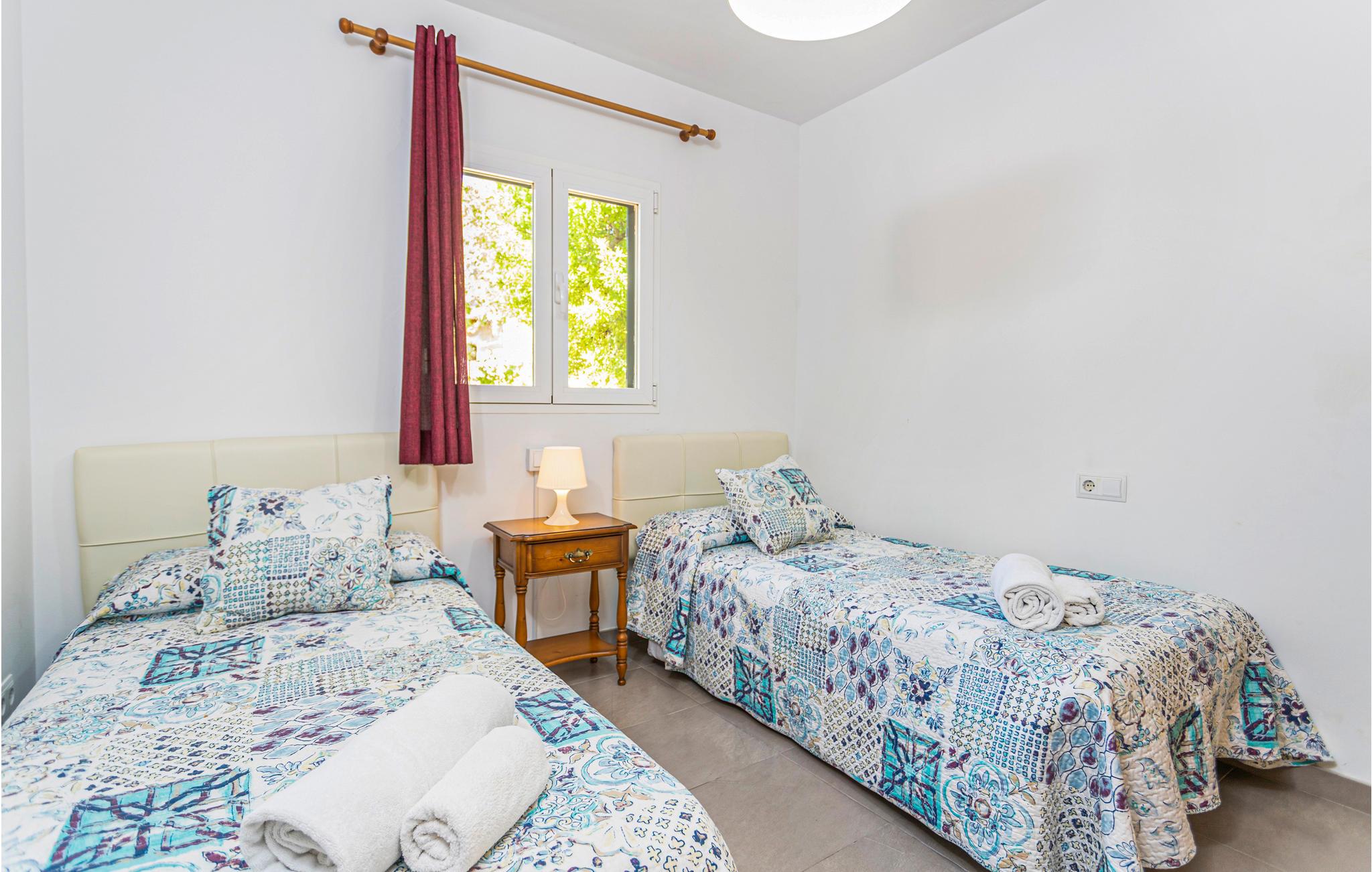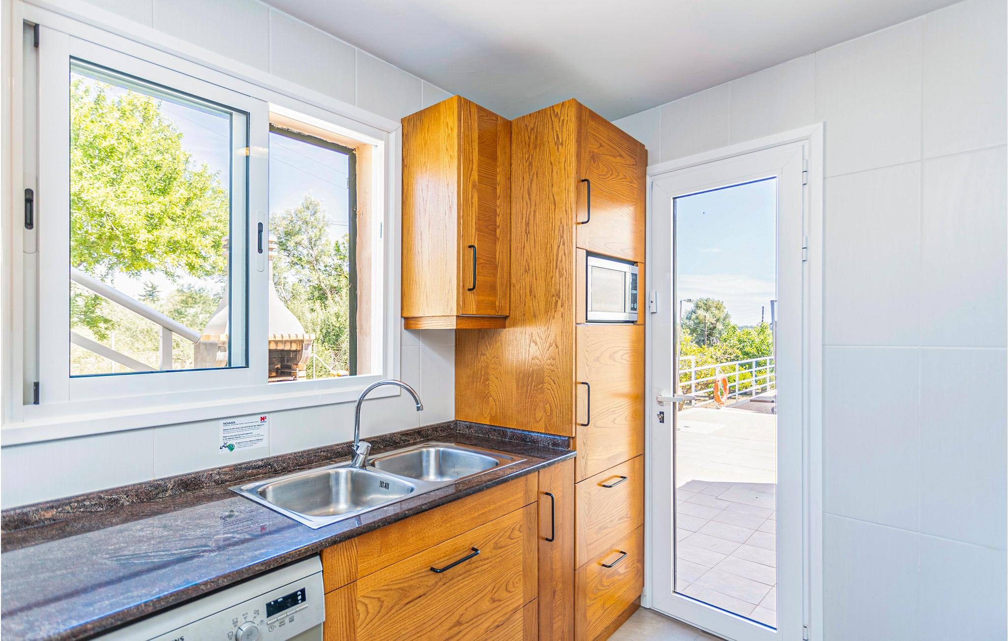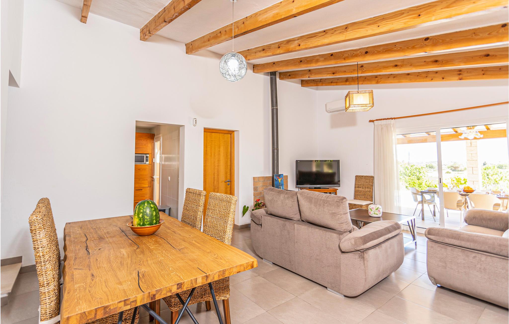En praktisk finca i stueplan med fri udsigt over de vide marker og Tramuntanas imponerende bjergkæde. Nyd jeres måltider til den imponerende udsigt på den hyggelige terrasse omkring den moderne overløbspool. Denne er udstyret med skånsom og særdeles hudvenlig rens ved salt og osmose. Der er kun 2 km til en af de langeste og dejligste sandstrande på øen, der er meget levende i højsæsonen, og hvor der venter jer mange restauranter, barer og indkøbsmuligheder. Ejeren holder nogle høns på bagsiden af grunden.
