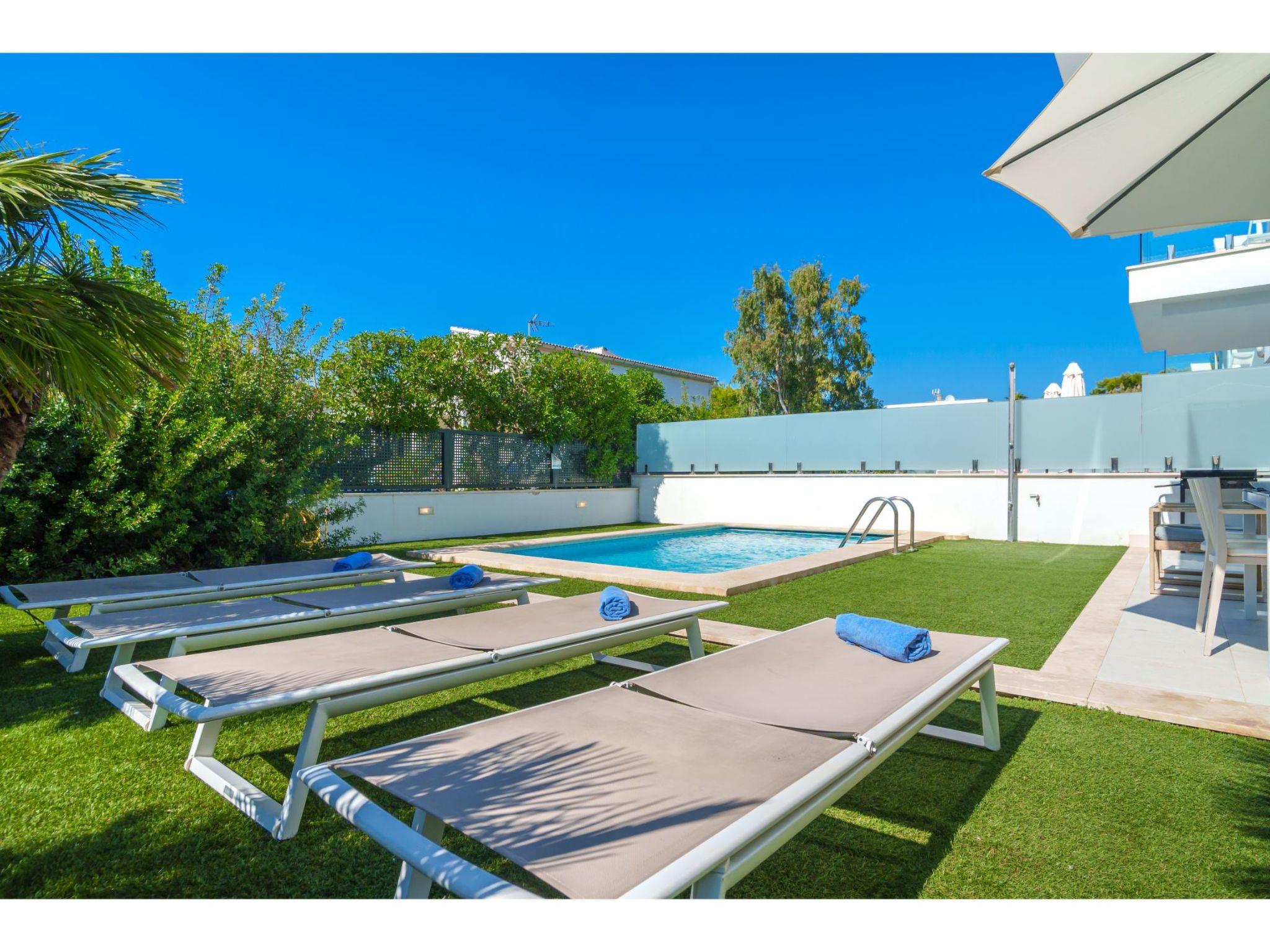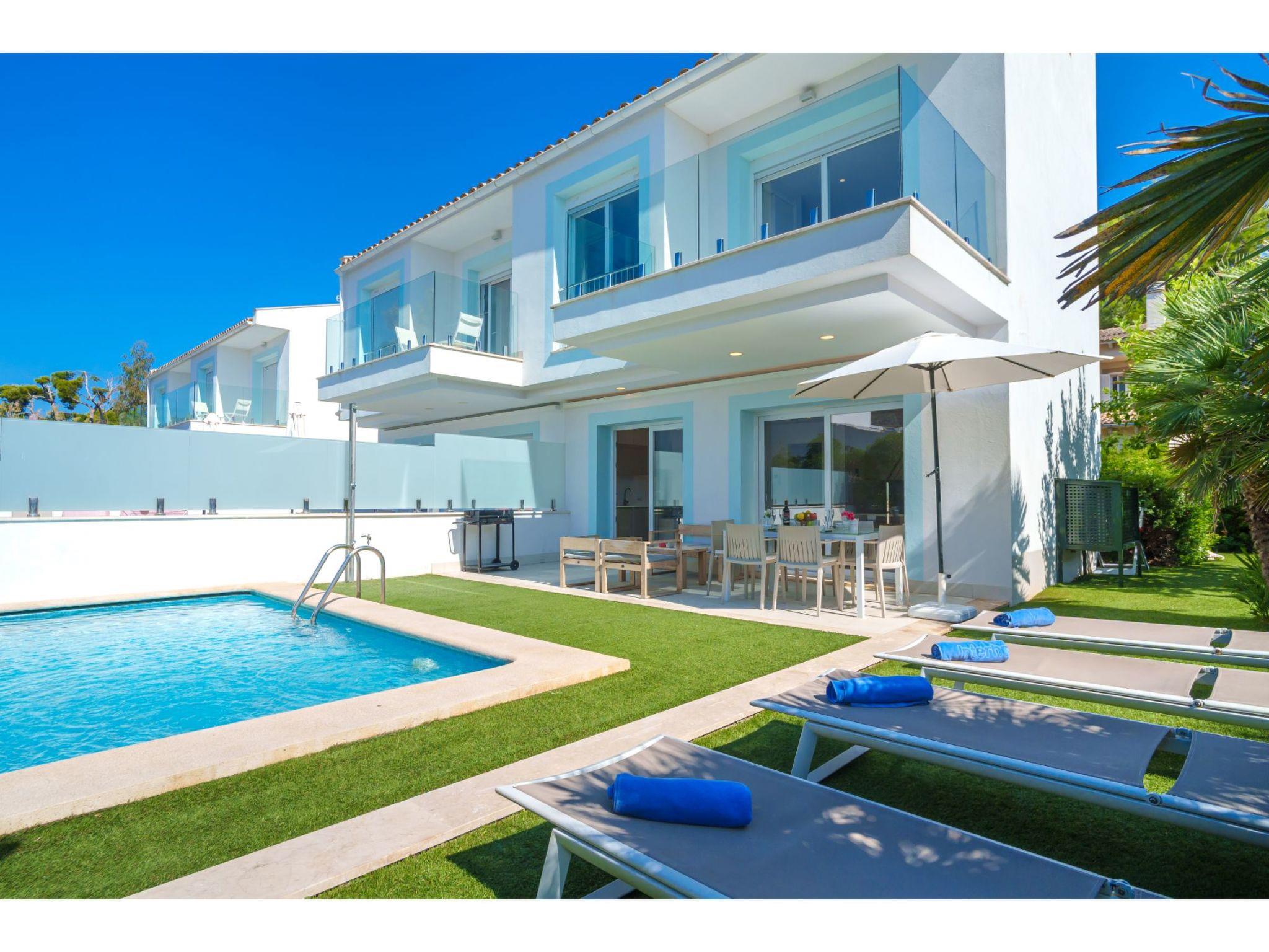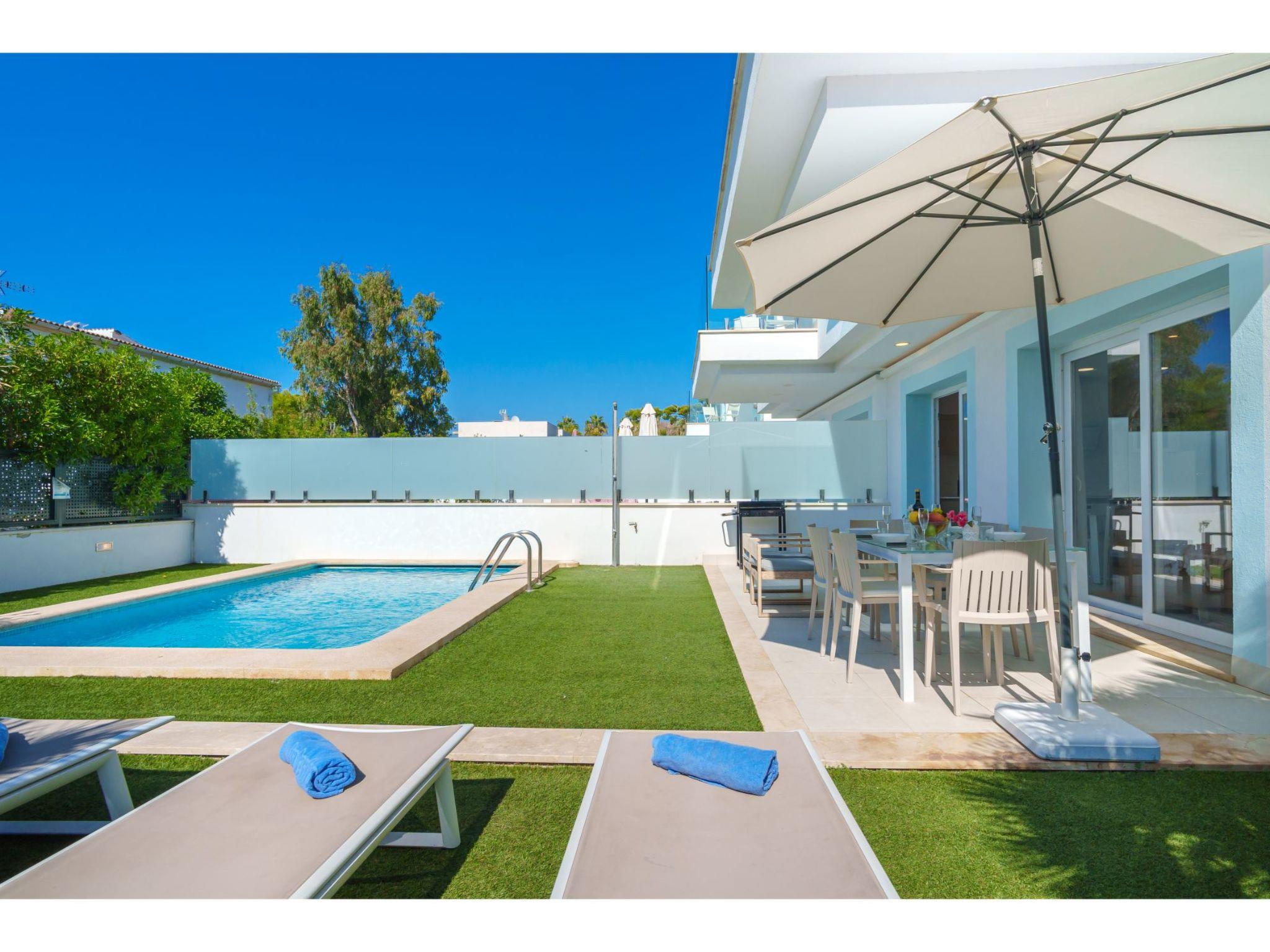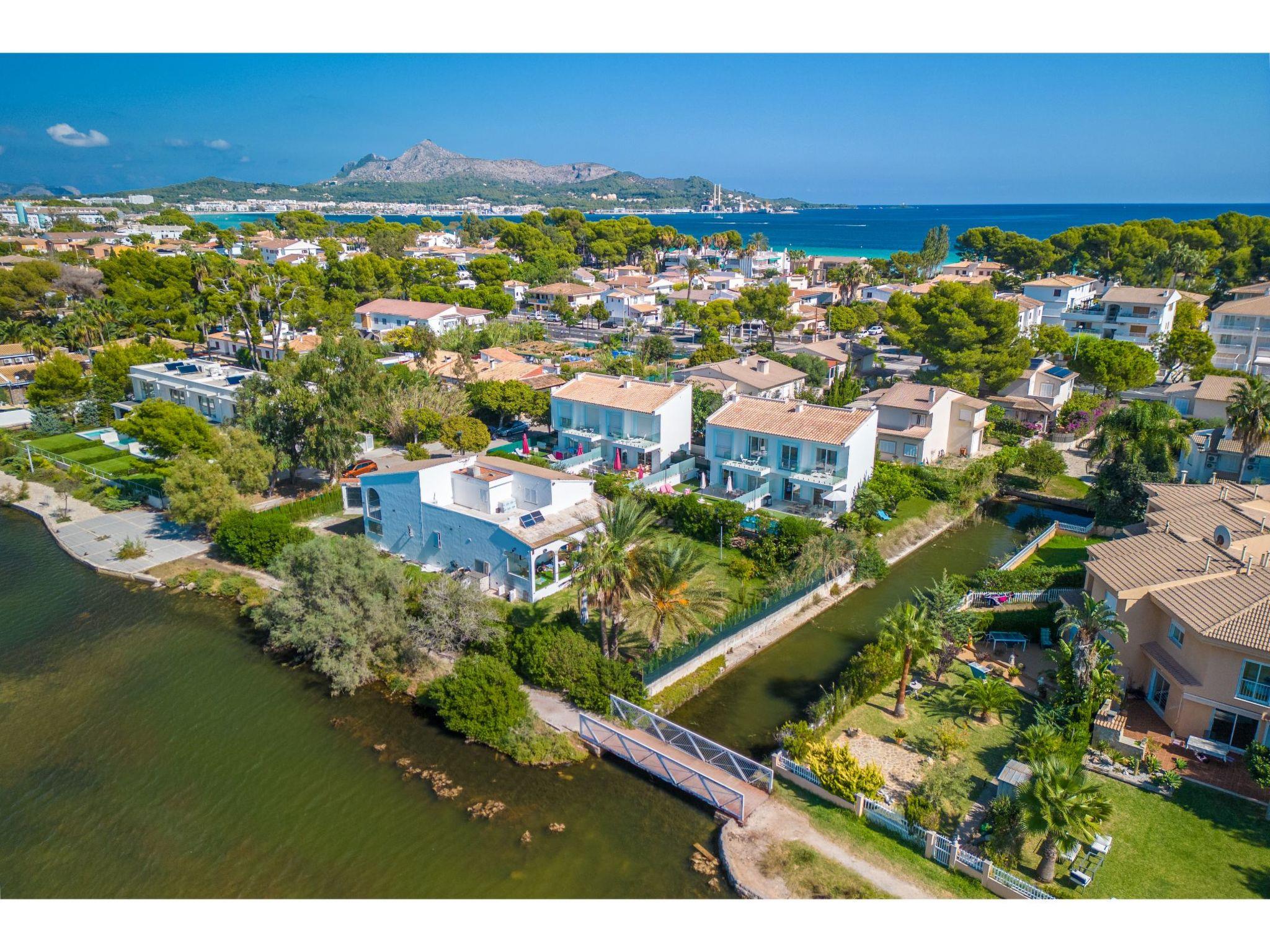 Port d'alcúdia: House for temporary rent, regulated by Law 29/1994, of November 24, on Urban Leases. In this house no tourist services are offered. Very modern, beautiful semi-detached house "Villa del Lago 4", 2 storeys, semi-detached, built in 2017. 4 houses in the resort. In the resort, in a quiet, sunny position, 900 m from the edge of the forest, 100 m from the sea, 3 m from the lake, 120 m from the beach, 1 m directly by the canal, direct access to the lagoon. Private: beautiful garden with lawn and wildlife garden, swimming pool angular (6 x 4 m, seasonal availability: 01.Jan. - 31.Dec.). Outdoor shower, patio, garden furniture. In the house: WiFi, central heating system, air conditioning, washing machine, tumble dryer. Shop 300 m, grocery, supermarket, restaurant, bar, 15 minute walk to the centre, bus stop 200 m, sandy beach 120 m, rocky beach 3 km, bathing lake 3 m. Sports harbour 4.5 km, marina 4.5 km, golf course (18 hole) 7 km, tennis 1 km, riding stable 2 km. Please note: suitable for families, suitable for seniors. Object suitable for 6 adults groups of teenagers on request only. Airfield 50 km from the property. The complex has another 4 houses for rent.