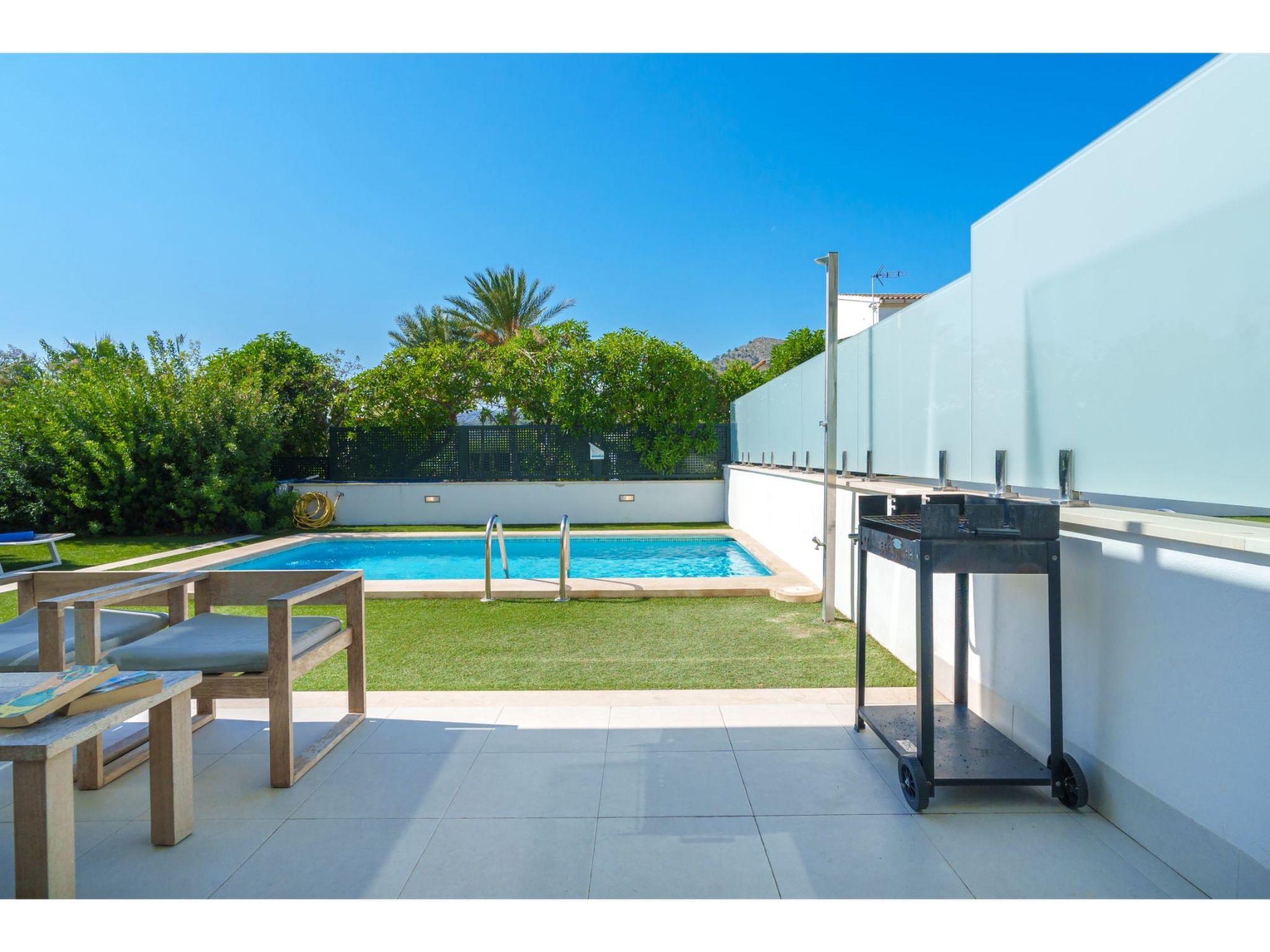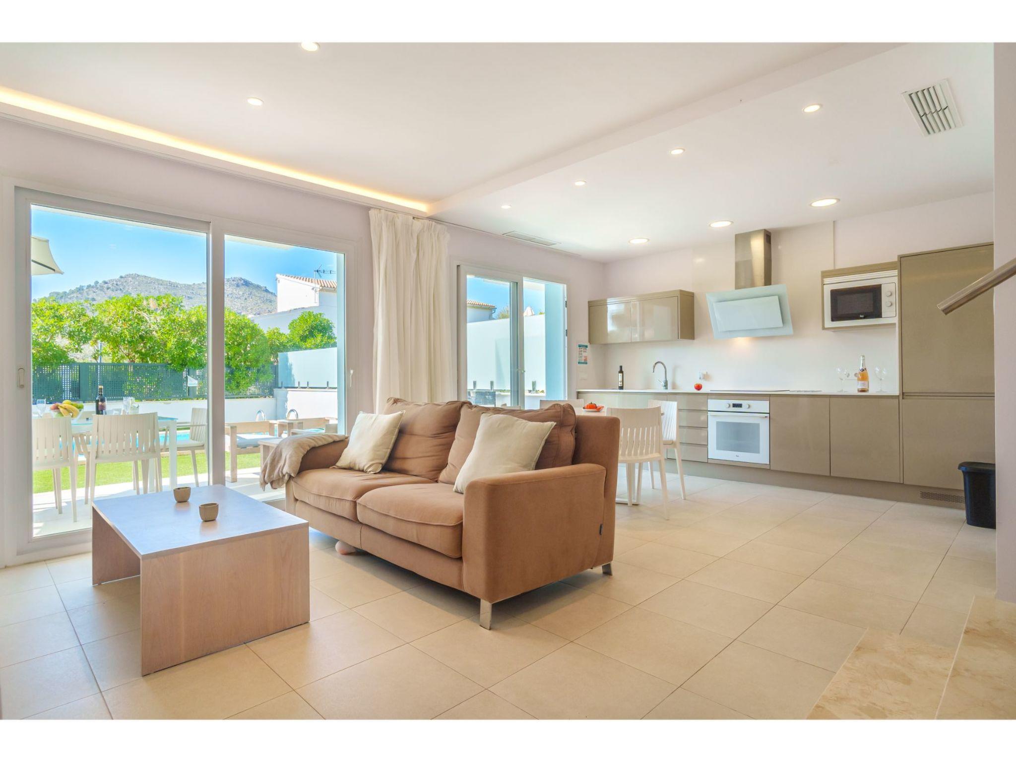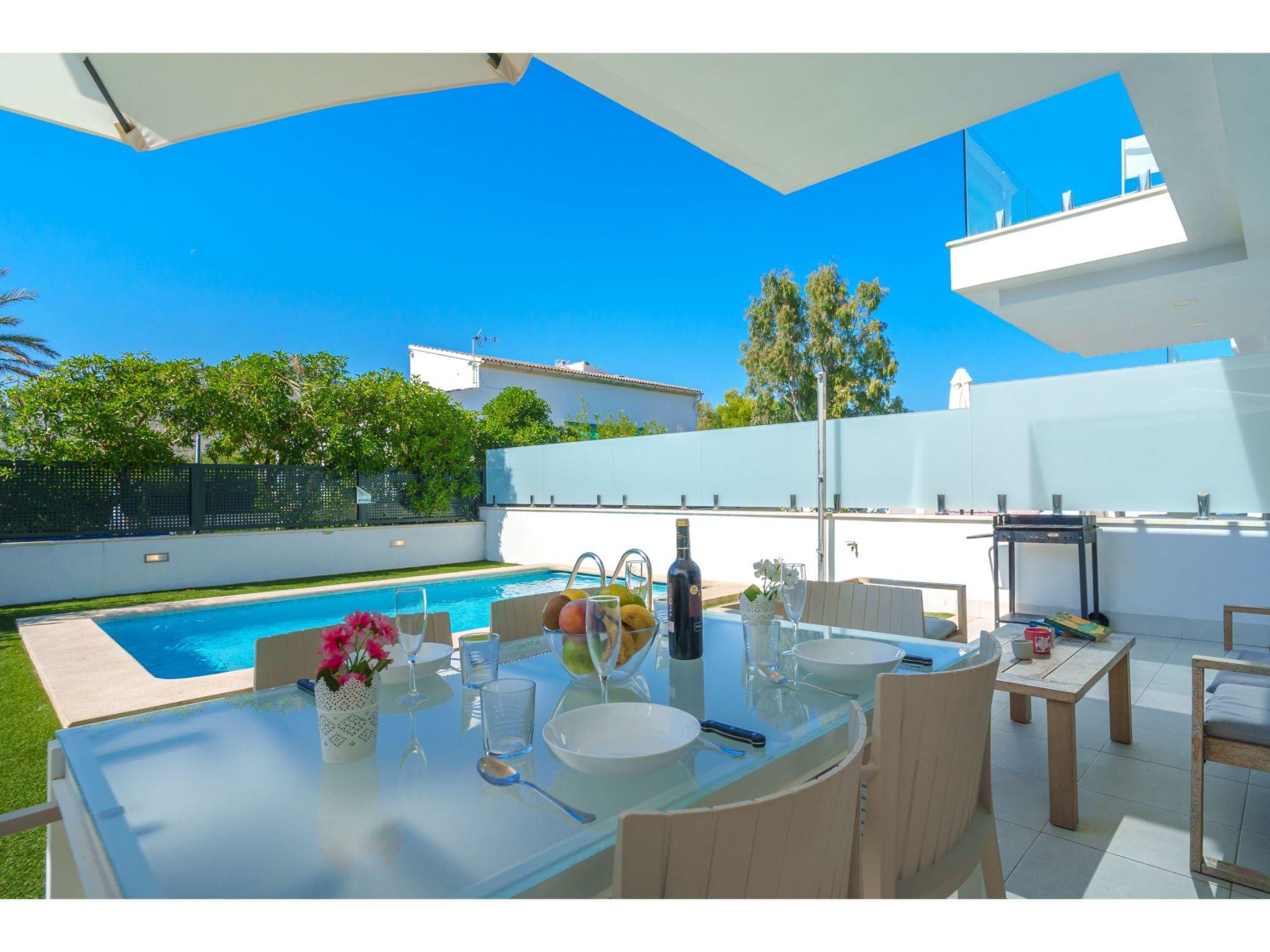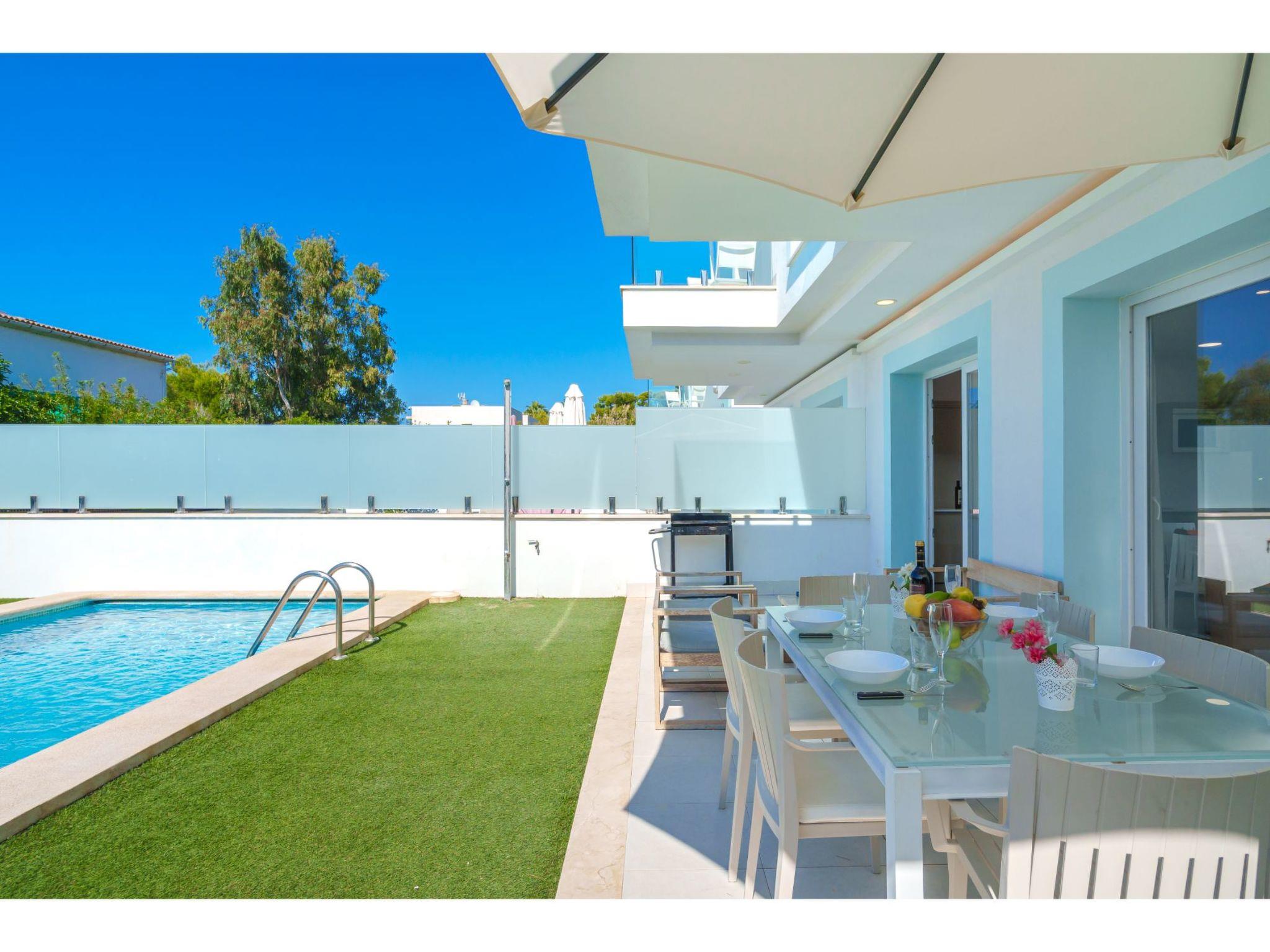 Port d'alcúdia: House for temporary rent, regulated by Law 29/1994, of November 24, on Urban Leases. In this house no tourist services are offered. Very modern, beautiful semi-detached house "Villa del Lago 4", 2 storeys, semi-detached, built in 2017. 4 houses in the resort. In the resort, in a quiet, sunny position, 900 m from the edge of the forest, 100 m from the sea, 3 m from the lake, 120 m from the beach, 1 m directly by the canal, direct access to the lagoon. Private: beautiful garden with lawn and wildlife garden, swimming pool angular (6 x 4 m, seasonal availability: 01.Jan. - 31.Dec.). Outdoor shower, patio, garden furniture. In the house: WiFi, central heating system, air conditioning, washing machine, tumble dryer. Shop 300 m, grocery, supermarket, restaurant, bar, 15 minute walk to the centre, bus stop 200 m, sandy beach 120 m, rocky beach 3 km, bathing lake 3 m. Sports harbour 4.5 km, marina 4.5 km, golf course (18 hole) 7 km, tennis 1 km, riding stable 2 km. Please note: suitable for families, suitable for seniors. Object suitable for 6 adults groups of teenagers on request only. Airfield 50 km from the property. The complex has another 4 houses for rent.