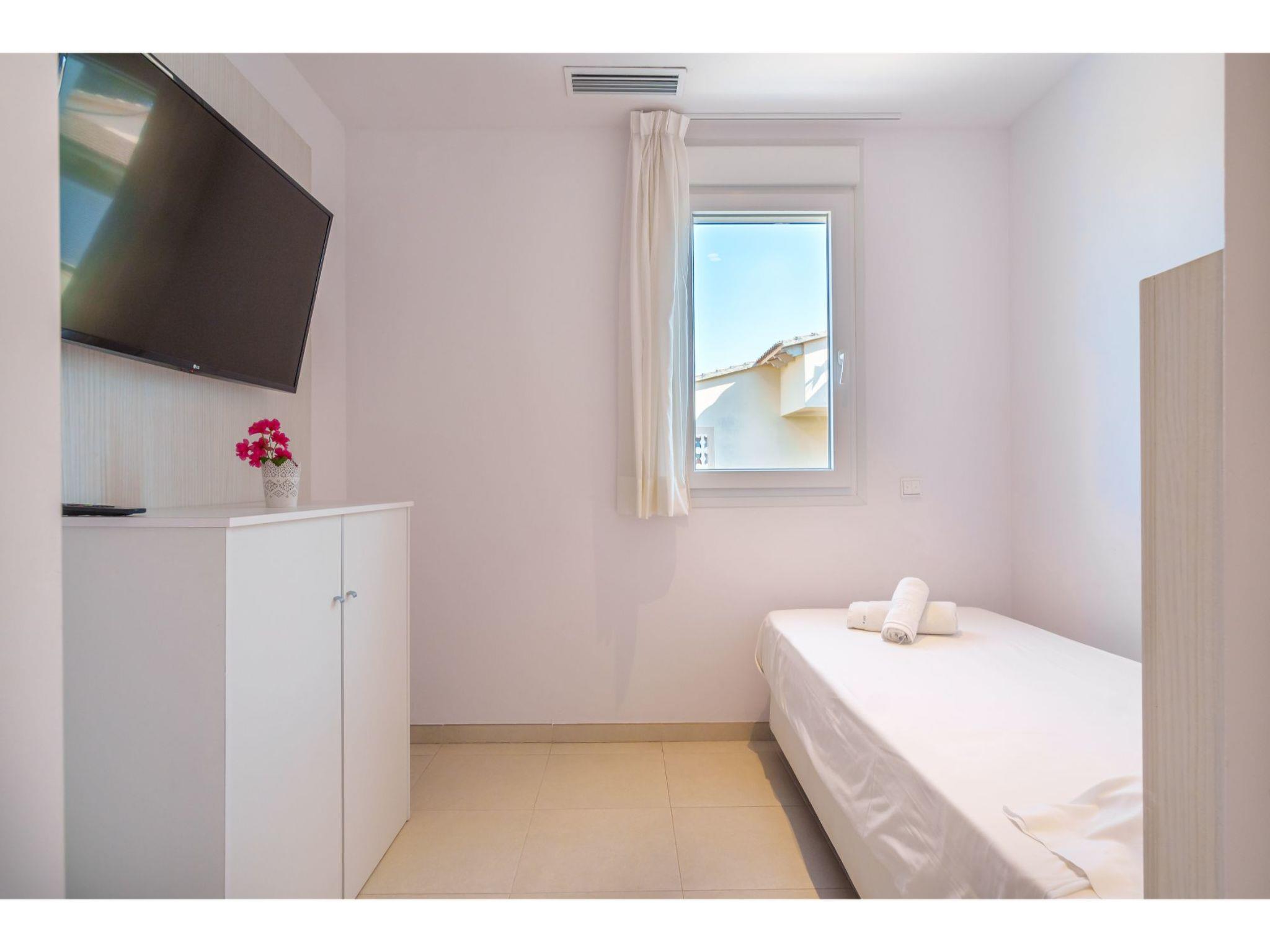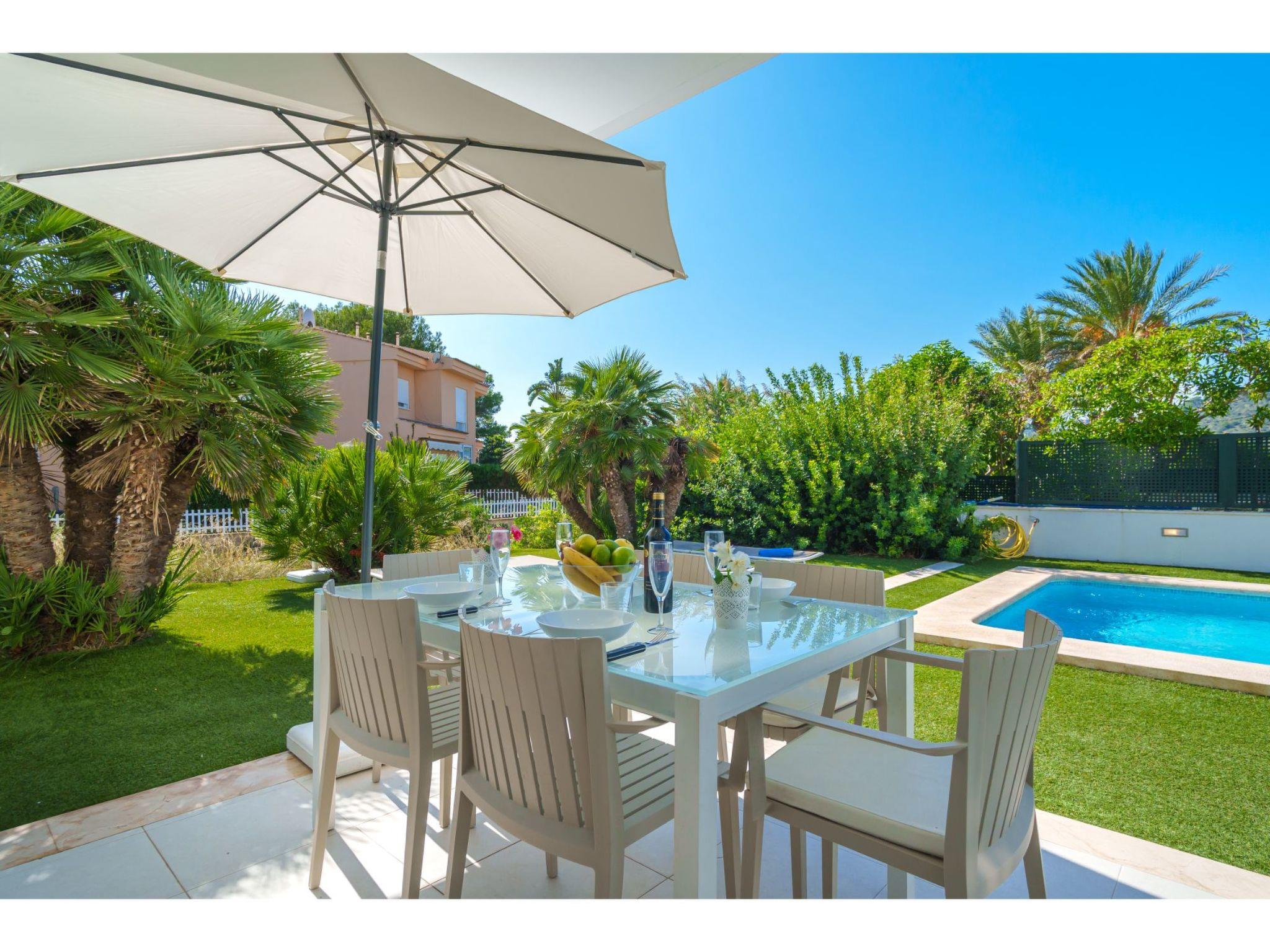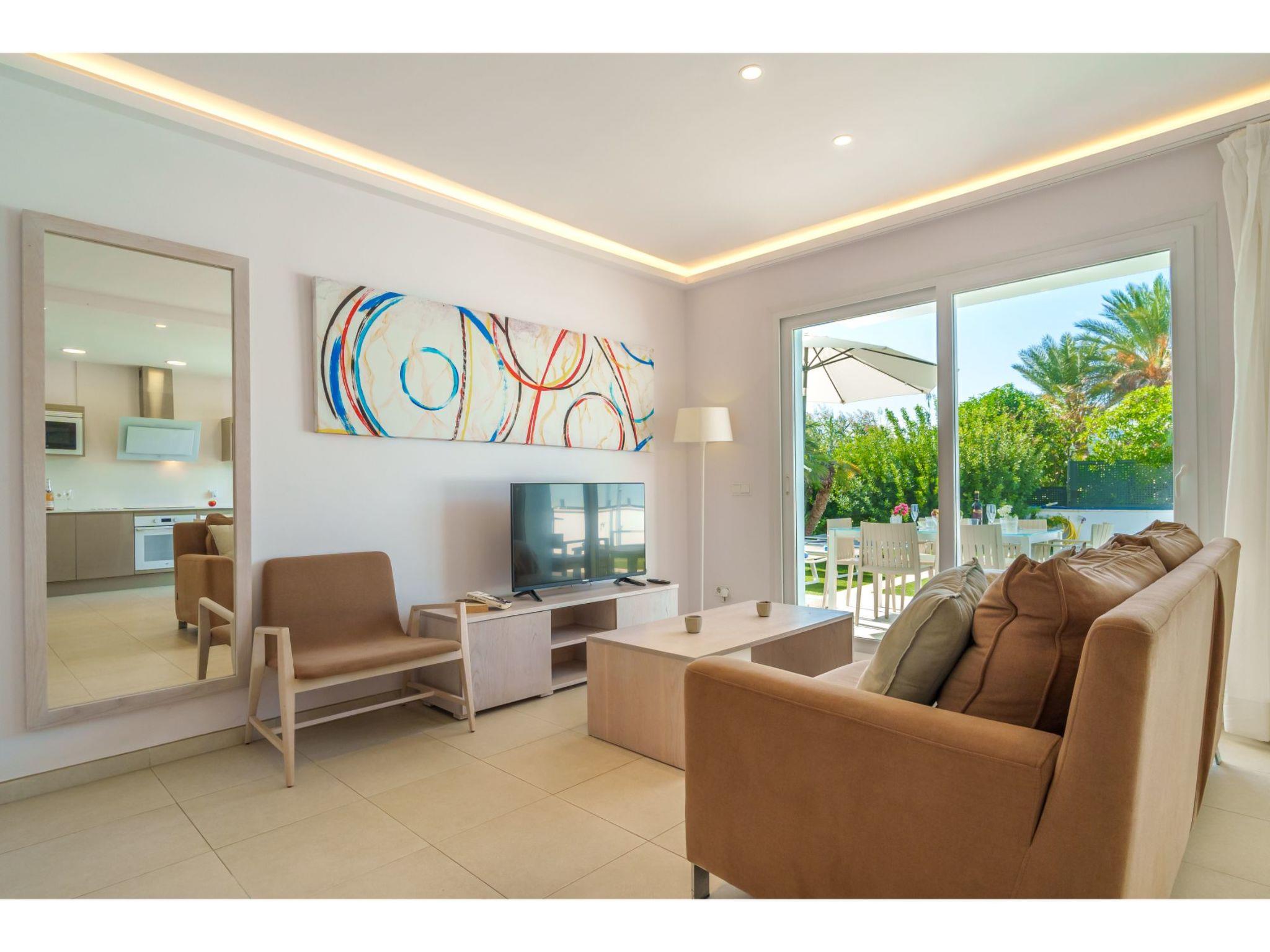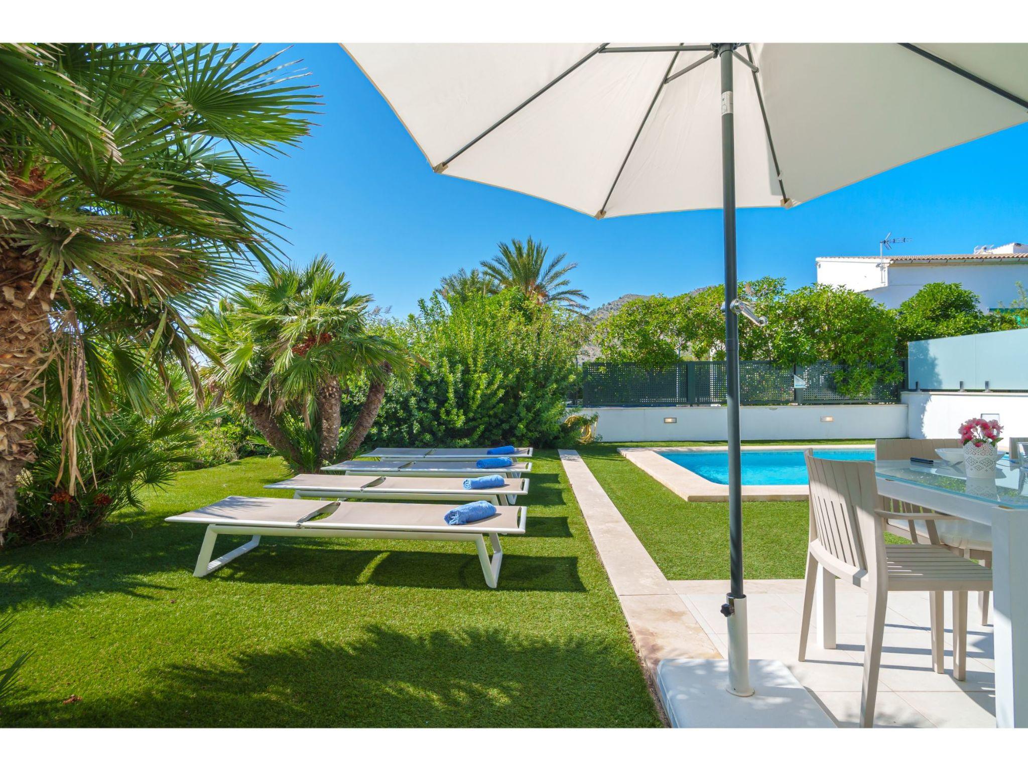 Port d'alcúdia: House for temporary rent, regulated by Law 29/1994, of November 24, on Urban Leases. In this house no tourist services are offered. Very modern, beautiful semi-detached house "Villa del Lago 4", 2 storeys, semi-detached, built in 2017. 4 houses in the resort. In the resort, in a quiet, sunny position, 900 m from the edge of the forest, 100 m from the sea, 3 m from the lake, 120 m from the beach, 1 m directly by the canal, direct access to the lagoon. Private: beautiful garden with lawn and wildlife garden, swimming pool angular (6 x 4 m, seasonal availability: 01.Jan. - 31.Dec.). Outdoor shower, patio, garden furniture. In the house: WiFi, central heating system, air conditioning, washing machine, tumble dryer. Shop 300 m, grocery, supermarket, restaurant, bar, 15 minute walk to the centre, bus stop 200 m, sandy beach 120 m, rocky beach 3 km, bathing lake 3 m. Sports harbour 4.5 km, marina 4.5 km, golf course (18 hole) 7 km, tennis 1 km, riding stable 2 km. Please note: suitable for families, suitable for seniors. Object suitable for 6 adults groups of teenagers on request only. Airfield 50 km from the property. The complex has another 4 houses for rent.
