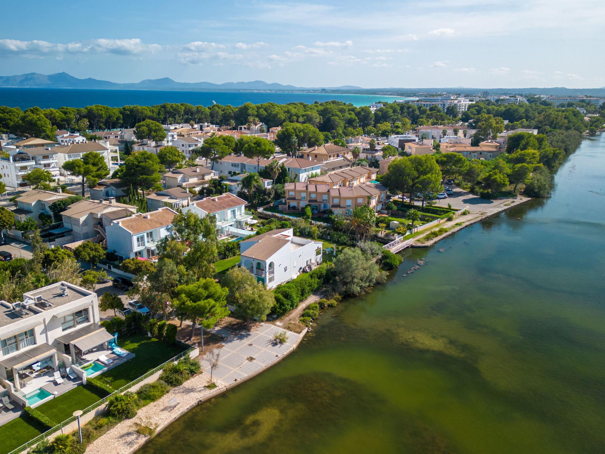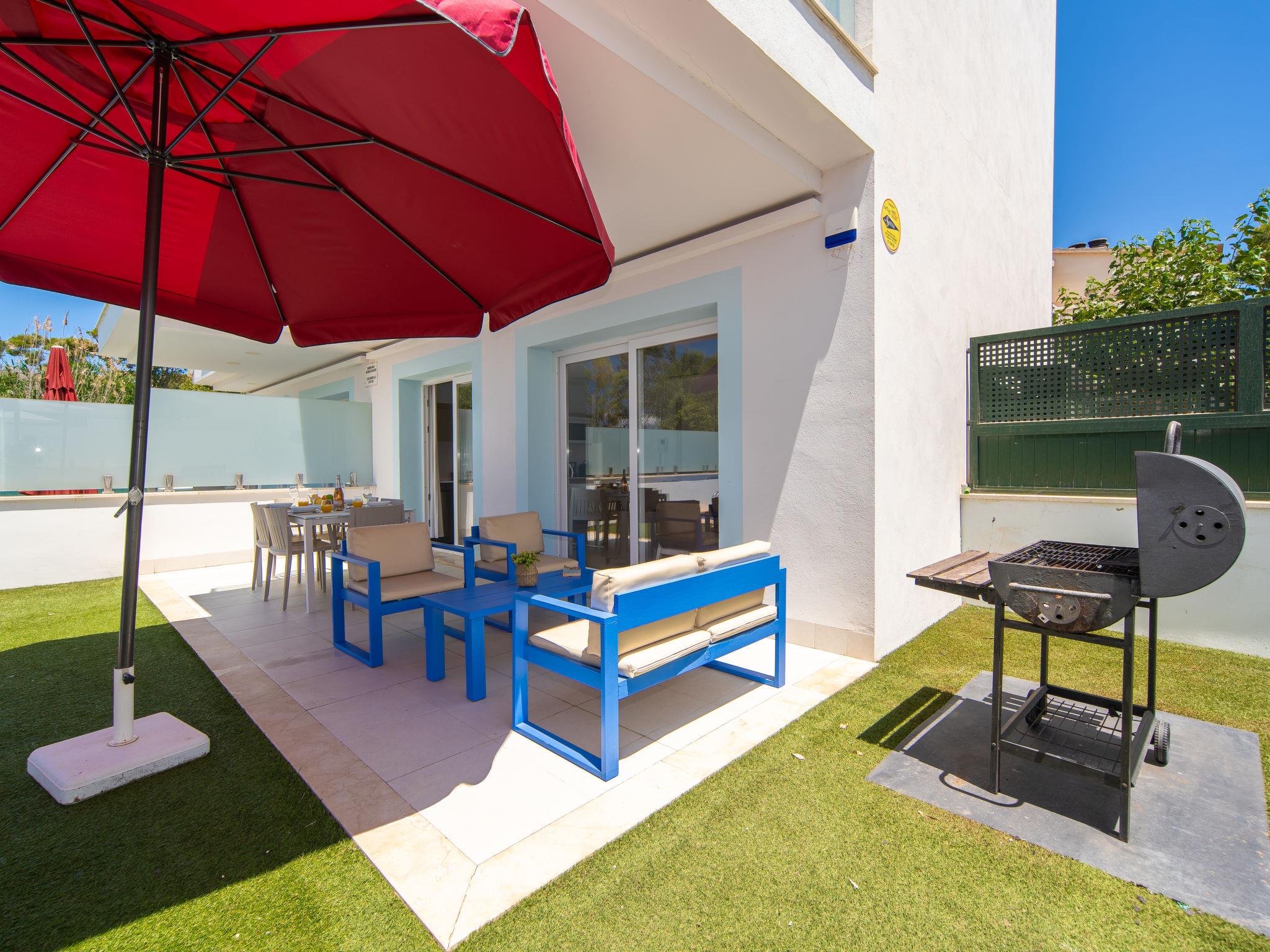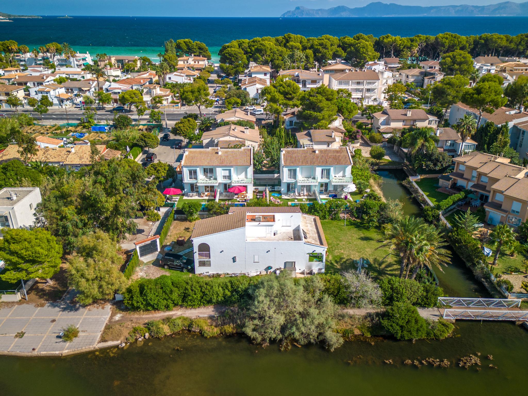 Port d'alcúdia: Very modern, beautiful, cosy house "Teresa Beach 2", 2 storeys, semi-detached, built in 2017. 4 houses in the resort. In the resort, in a quiet, sunny position, 900 m from the edge of the forest, 100 m from the sea, 3 m from the lake, 120 m from the beach, 1 m directly by the canal, direct access to the lagoon. Private: beautiful garden with lawn and wildlife garden, swimming pool angular (6 x 4 m, seasonal availability: 01.Jan. - 31.Dec.). Outdoor shower, patio, garden furniture, barbecue. In the house: WiFi, central heating system, air conditioning, burglar alarm system, washing machine, tumble dryer. Shop 300 m, grocery, supermarket, restaurant, bar, 15 minute walk to the centre, bus stop 200 m, sandy beach 120 m, rocky beach 3 km, bathing lake 3 m. Sports harbour 4.5 km, marina 4.5 km, golf course (18 hole) 7 km, tennis 1 km, riding stable 2 km. Please note: suitable for families, suitable for seniors. Object suitable for 6 adults groups of teenagers on request only. Airfield 50 km from the property. The complex has another 3 houses for rent.