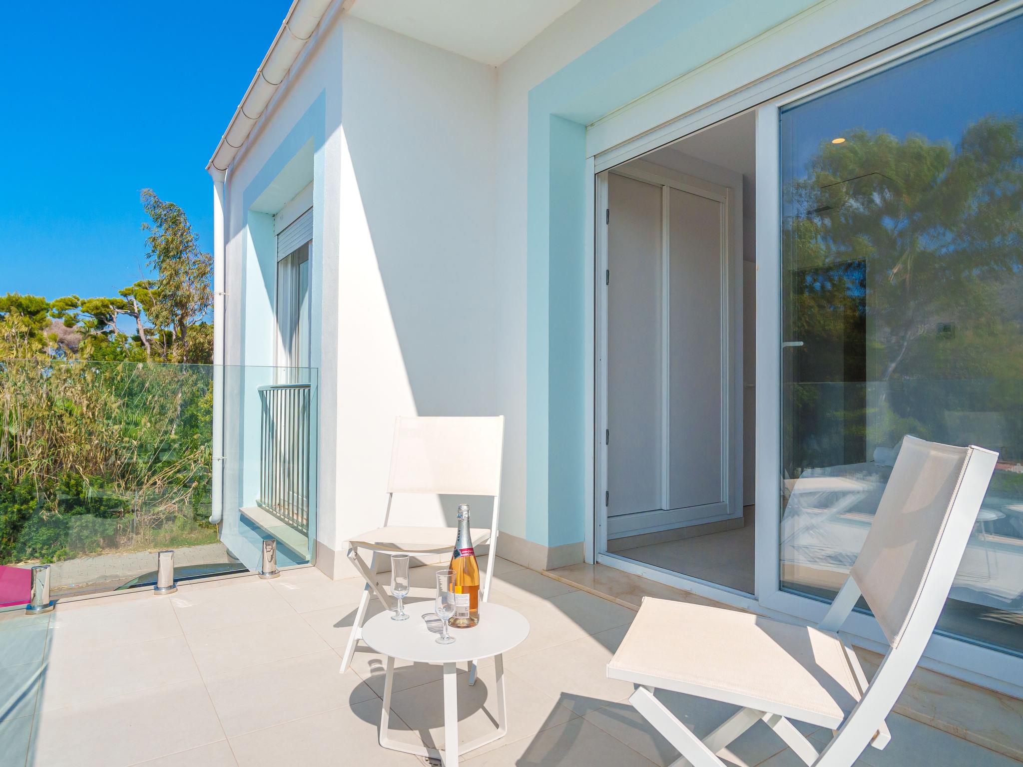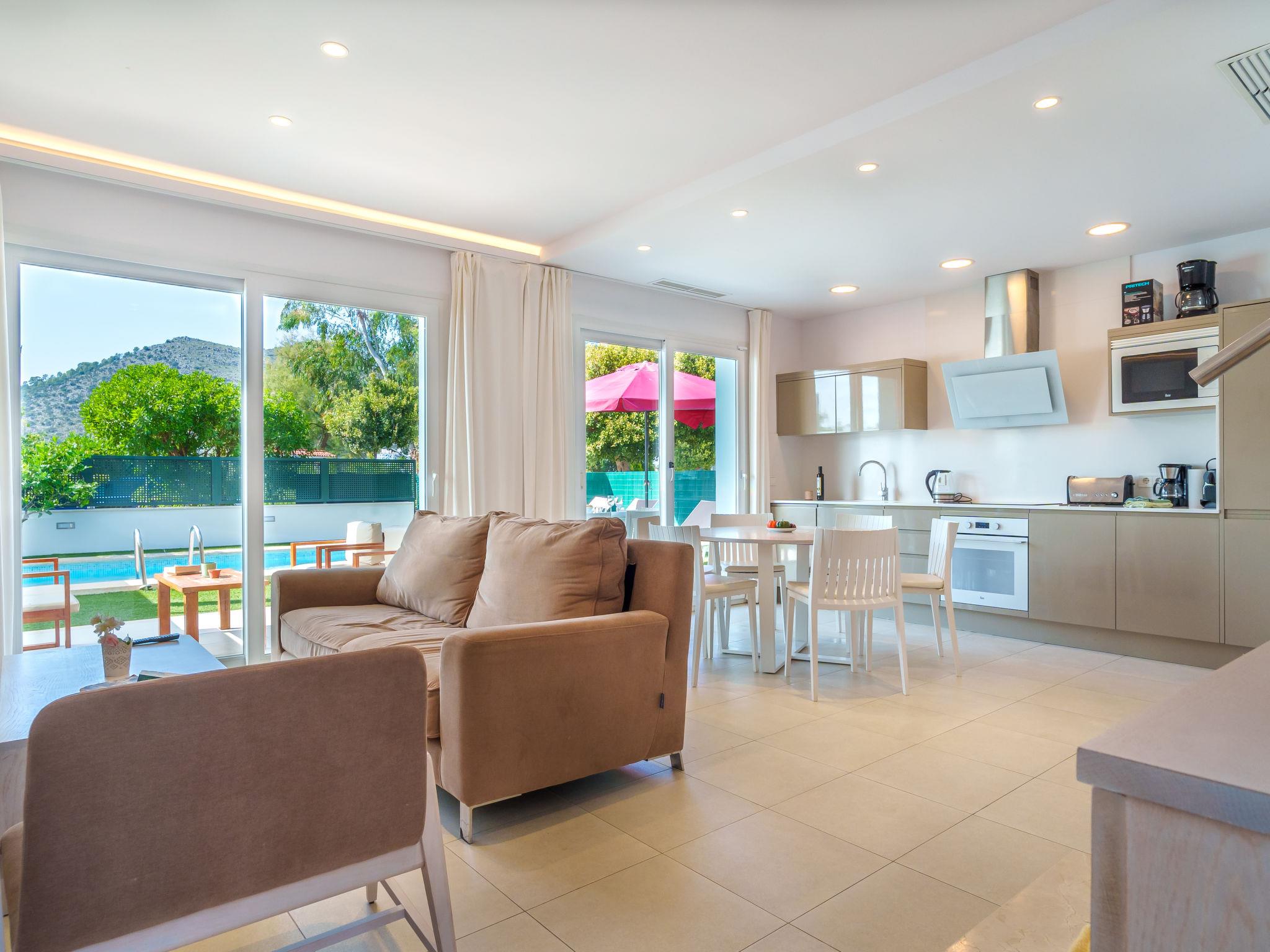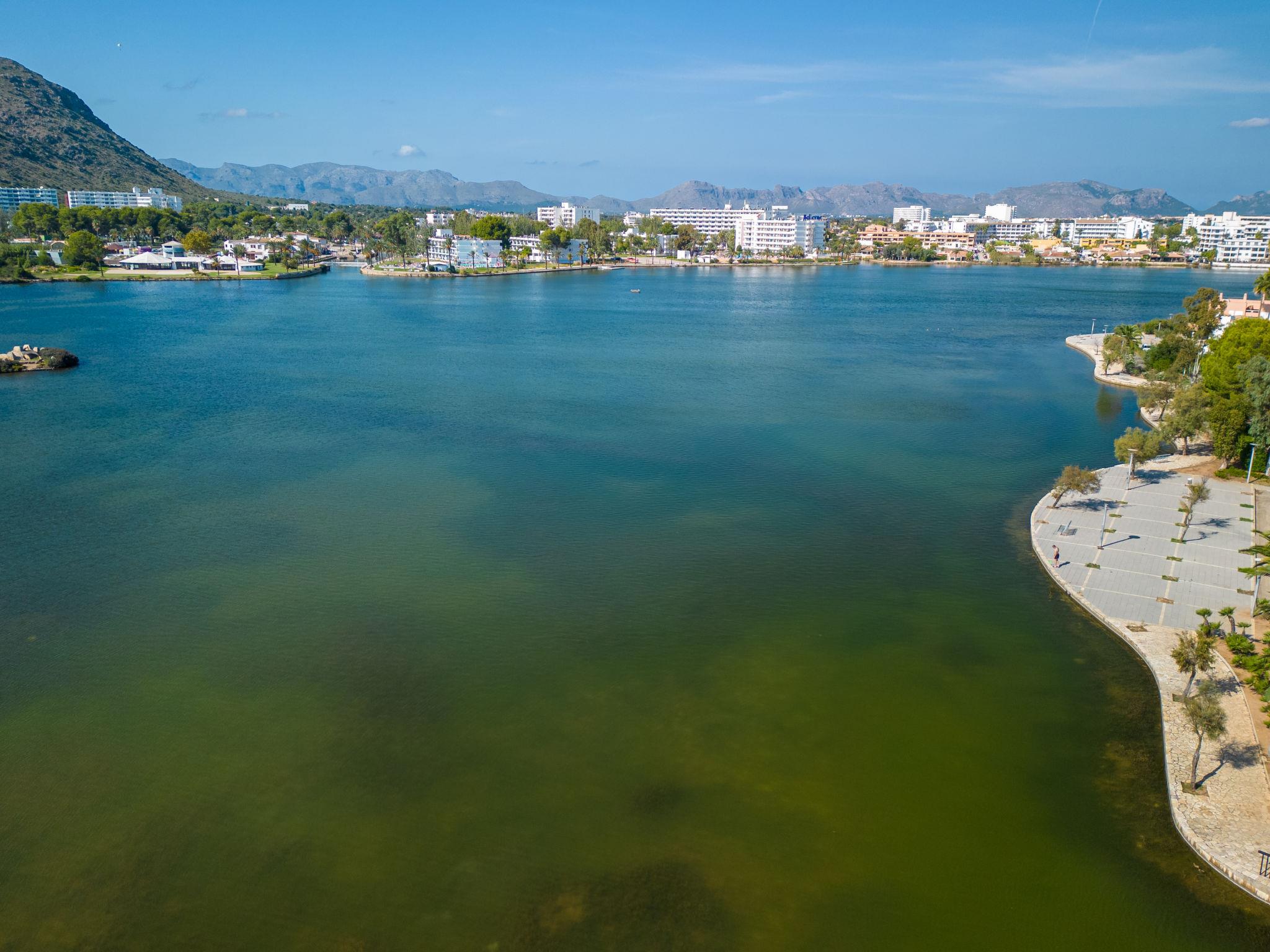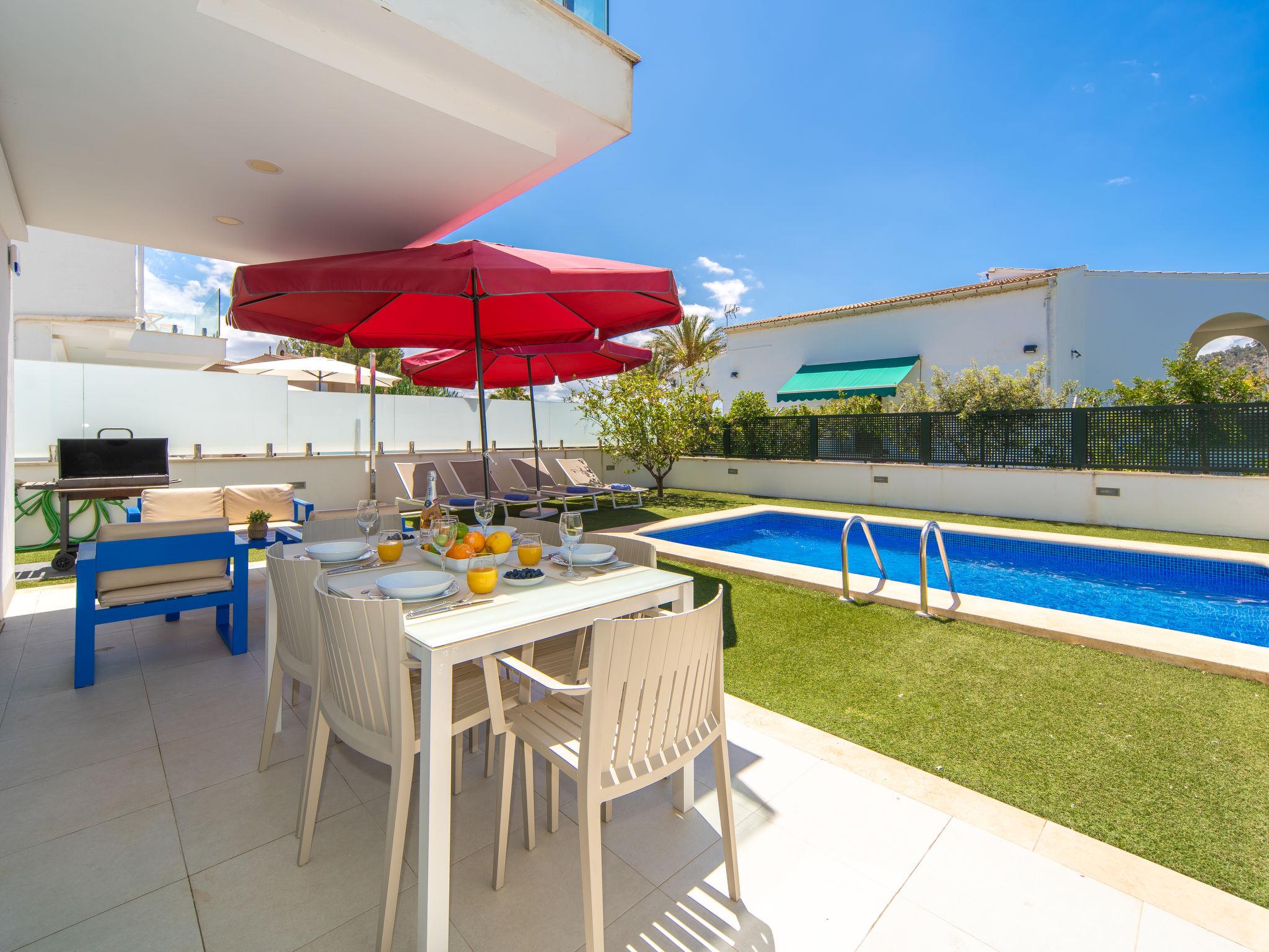 Port d'alcúdia: Very modern, beautiful, cosy house "Teresa Beach 2", 2 storeys, semi-detached, built in 2017. 4 houses in the resort. In the resort, in a quiet, sunny position, 900 m from the edge of the forest, 100 m from the sea, 3 m from the lake, 120 m from the beach, 1 m directly by the canal, direct access to the lagoon. Private: beautiful garden with lawn and wildlife garden, swimming pool angular (6 x 4 m, seasonal availability: 01.Jan. - 31.Dec.). Outdoor shower, patio, garden furniture, barbecue. In the house: WiFi, central heating system, air conditioning, burglar alarm system, washing machine, tumble dryer. Shop 300 m, grocery, supermarket, restaurant, bar, 15 minute walk to the centre, bus stop 200 m, sandy beach 120 m, rocky beach 3 km, bathing lake 3 m. Sports harbour 4.5 km, marina 4.5 km, golf course (18 hole) 7 km, tennis 1 km, riding stable 2 km. Please note: suitable for families, suitable for seniors. Object suitable for 6 adults groups of teenagers on request only. Airfield 50 km from the property. The complex has another 3 houses for rent.