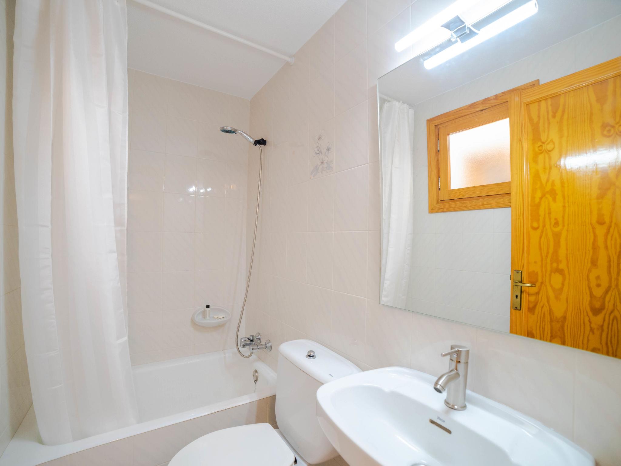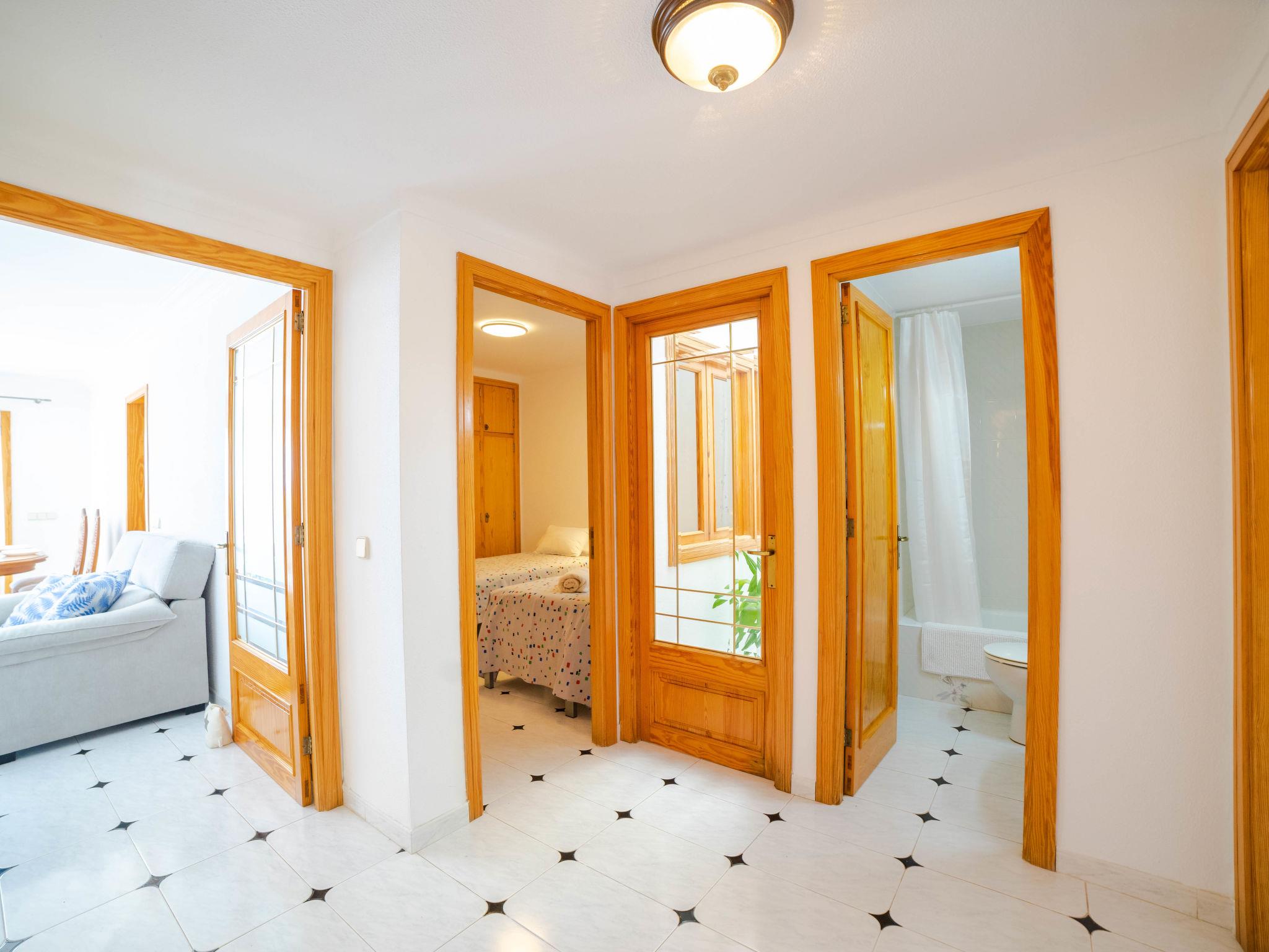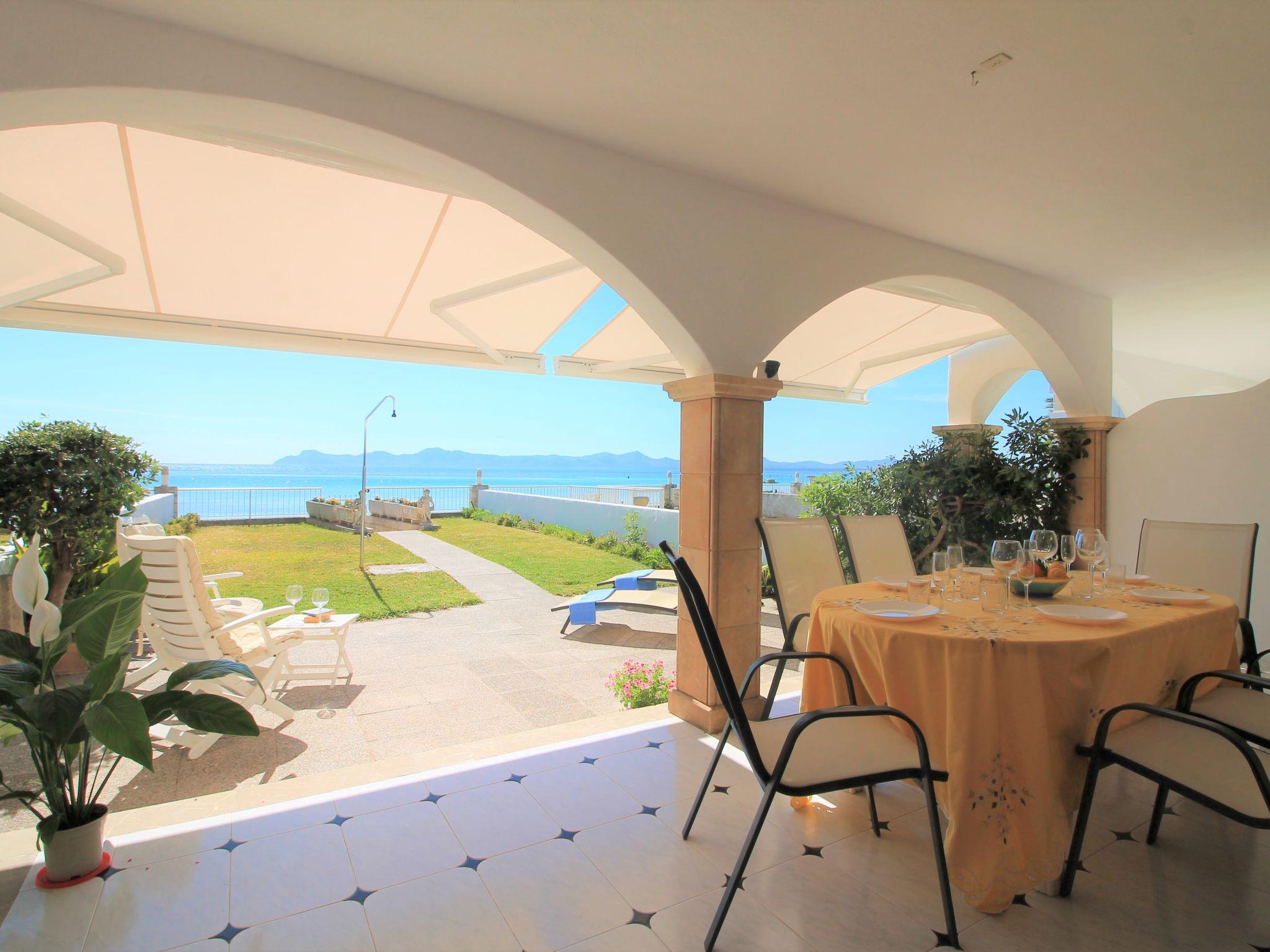 Port d'Alcúdia: Large, cosy apartment block "Sa Mirada". In the resort, 2.5 km from the centre, in a quiet, sunny position, 2.5 km from the edge of the forest, 3 m from the sea, from the beach, direct access to the beach. Private: garden with lawn and wildlife garden. Outdoor shower, patio, arbour, pergola, garden furniture. In the house: internet access, WiFi, washing machine. Stepped path (6 steps) to the house. Supermarket 400 m, restaurant 150 m, bar 200 m, bicycle rental 500 m, pub garden 150 m, bus stop, sandy beach 3 m, rocky beach 5 km. Sports harbour 3 km, marina 3 km, golf course (18 hole) 6 km. Please note: suitable for families, suitable for seniors. Object suitable for 6 adults.