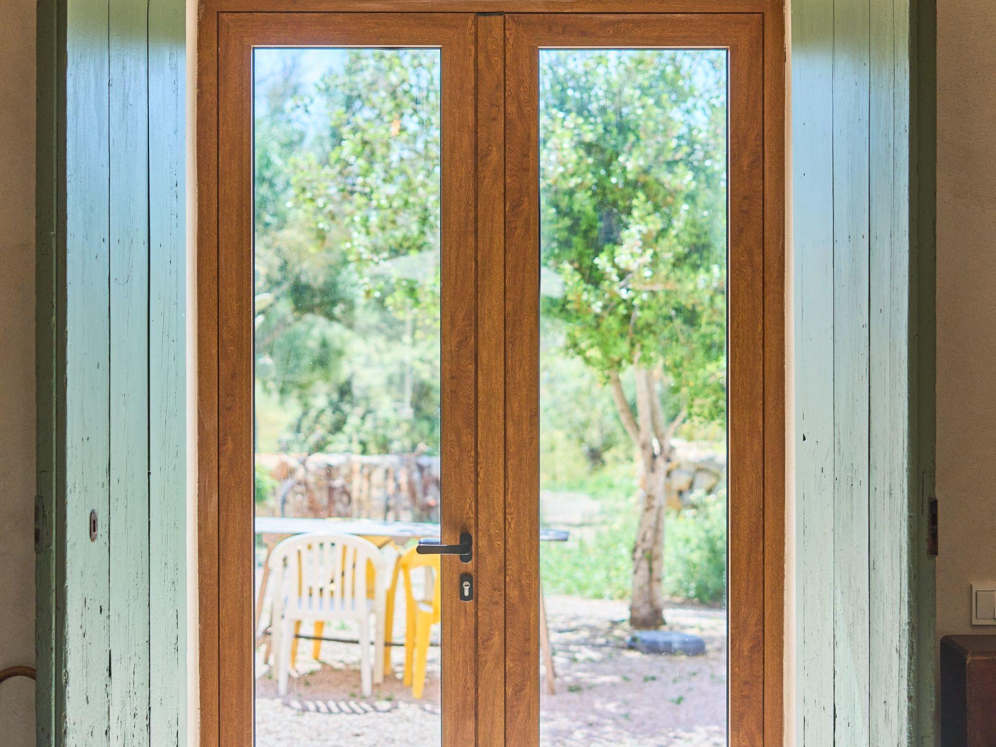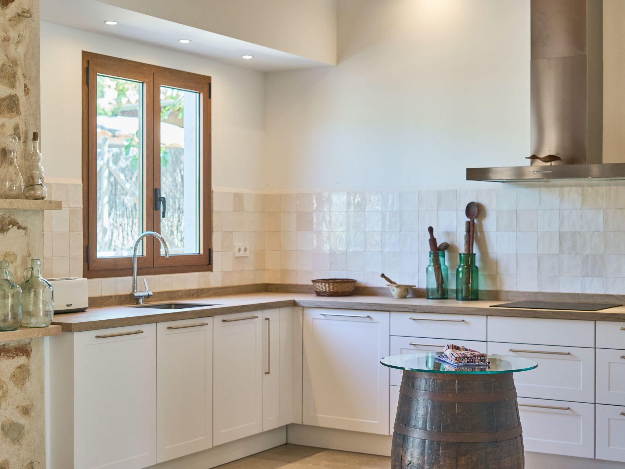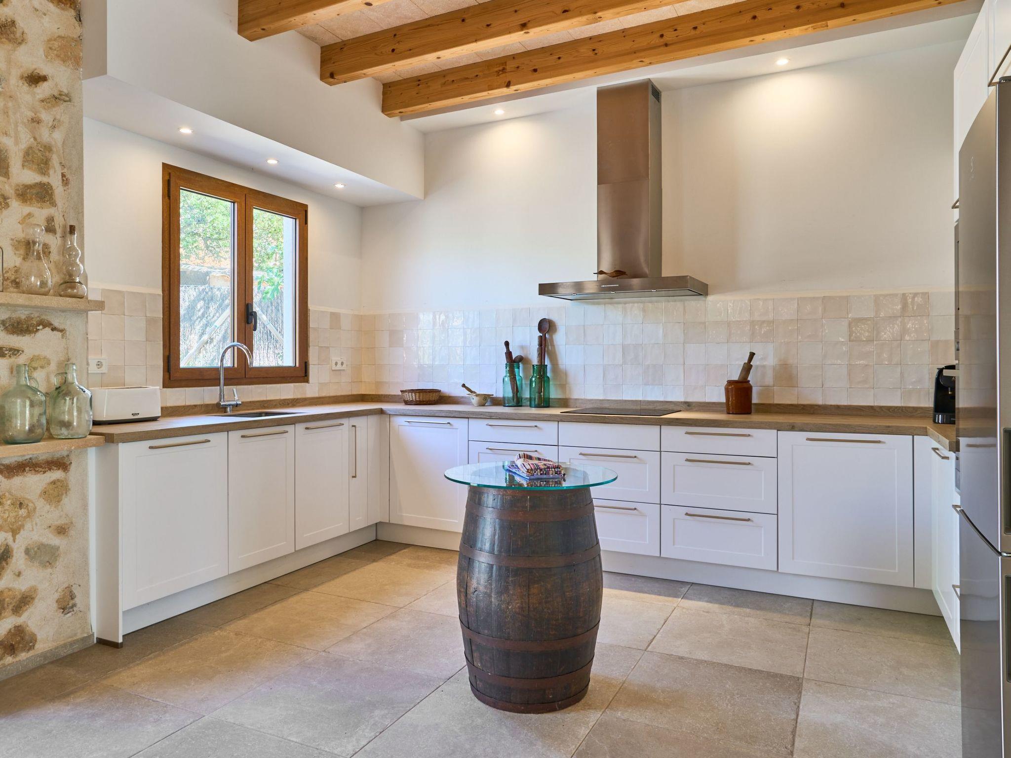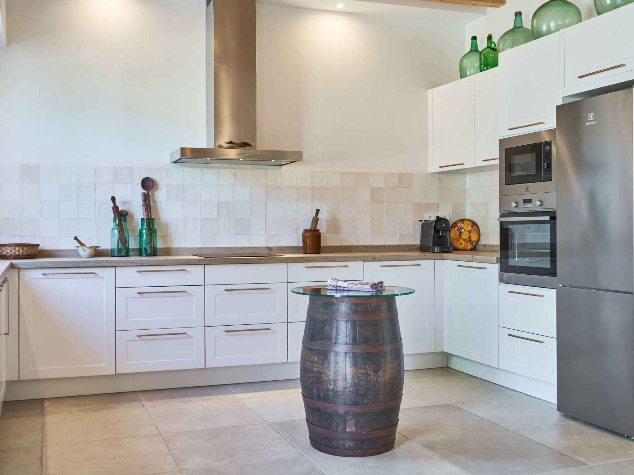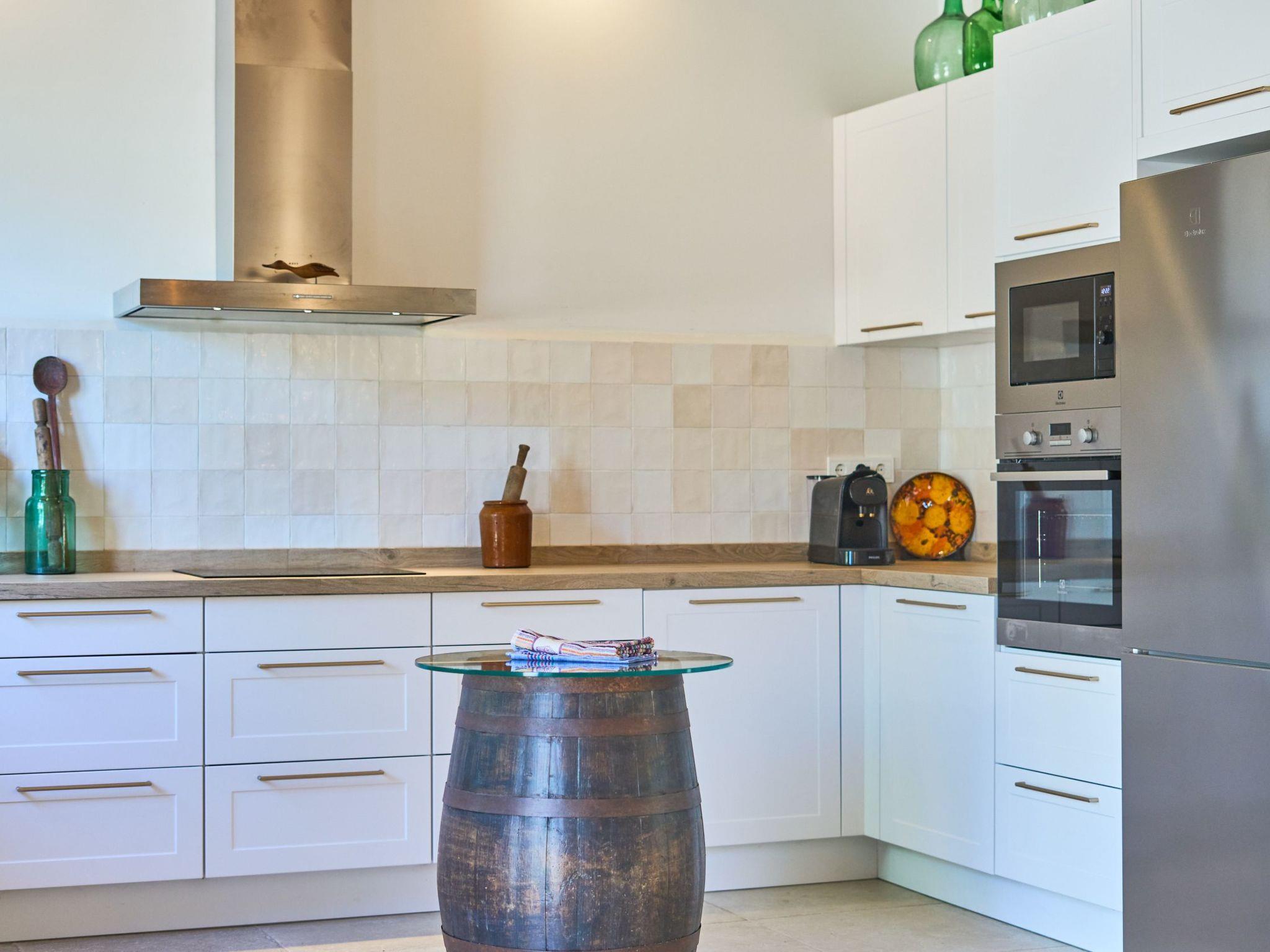 Upon entering the house, you enter the spacious entrance area. To the left is the living room with glass doors leading out onto the terrace. At the rear of the house is the open-plan and very spacious kitchen, which has a dining area. From the kitchen, a door leads to the rear terrace, with a sail-covered area where you can enjoy an aperitif in the open air. There are two old wine barrels that have been converted into bar tables and some stools.