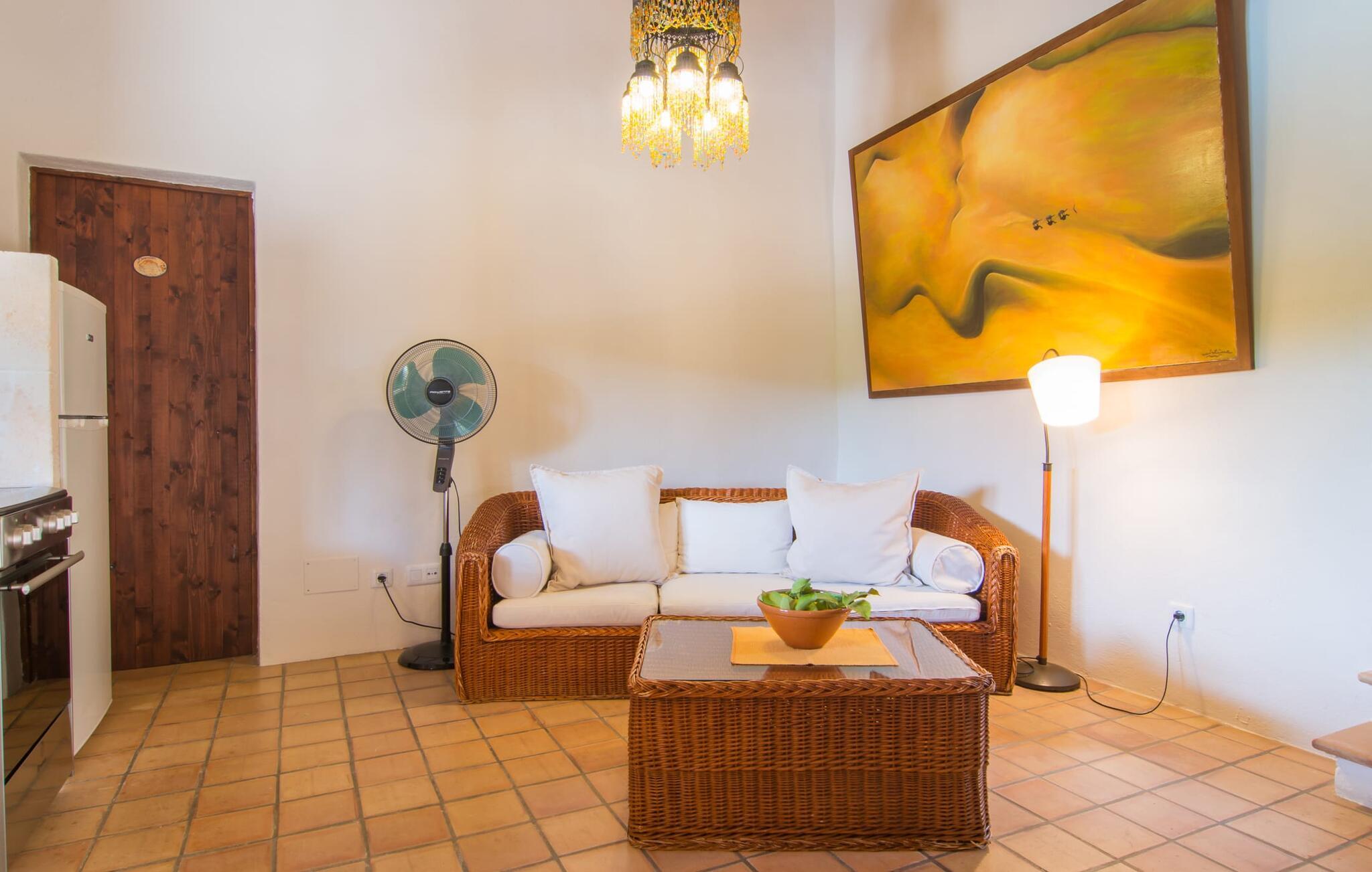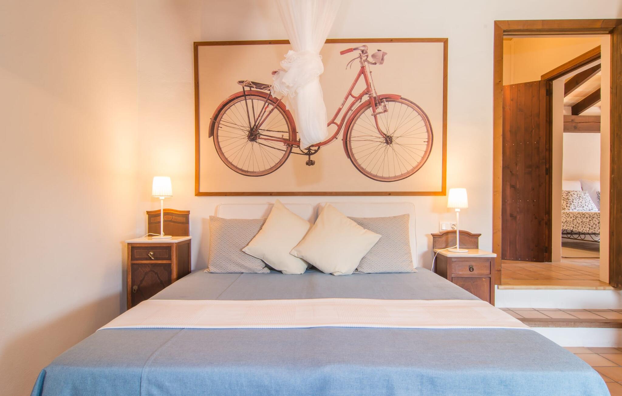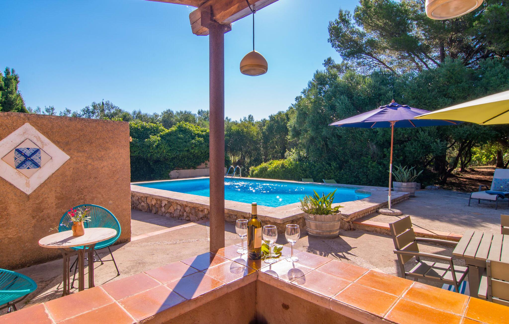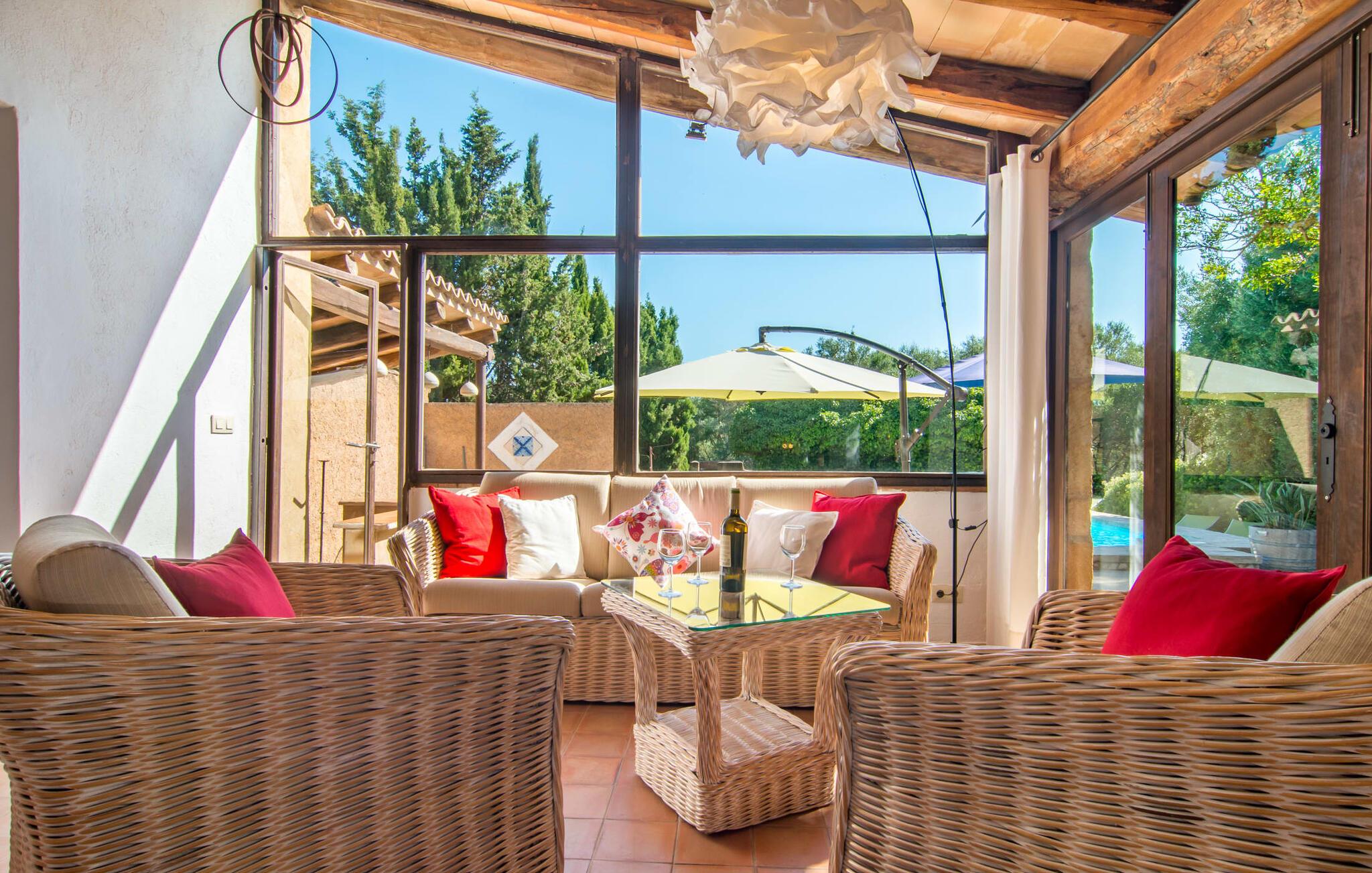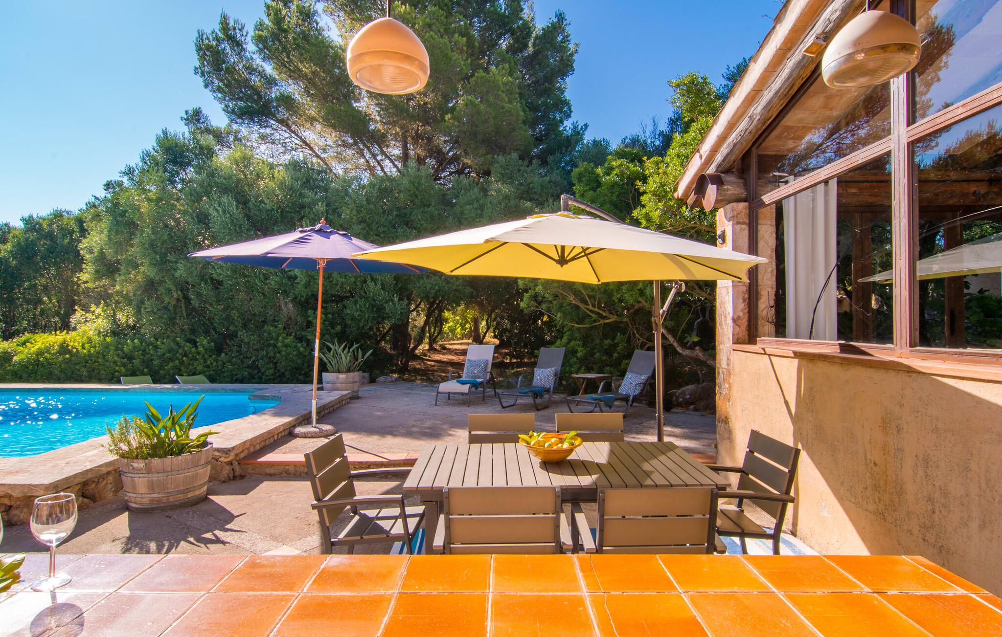 Store grupper, der ønsker at holde en skøn og uforglemmelig ferie sammen, har ofte svært ved at finde overnatning – sommerhuse med XXL-kapacitet er sjældne på øen. I denne henseende overgår Villa "Principal" EMF274 alle andre, og kombinerer vidunderlige naturlige omgivelser med en frodig grøn ejendom, der har tre separate bygninger at bo i. Haven, der forbinder villaerne, har flere kunstige små oaser, som I kan opdage, mens I går en tur. I kan også mødes til et improviseret spil tennis på den private bane - dette er tilgængeligt for jer mellem kl. 10.00 og 21.00 og deles af alle gæster. Når vinderen er kåret, giver de to pools i haven en kærkommen mulighed for at køle af, måske efterfulgt af et langt solbad. Har I lyst til at mødes igen, er I velkommen til at møde op til en grillfest. Villakomplekset er ideelt til sådan et møde, og et af husene har endda et udekøkken med pizzaovn. Derfor kan I tilbringe størstedelen af jeres ferie i den milde og friske ø-luft. I kan nyde noget af det på de hyggelige terrassearealer, som er ideelle til samvær. Om I foretrækker at slappe af på en liggestol eller krølle jer sammen på et af rattanmøblerne er helt op til jer - bare sørg for at gøre noget godt for jer selv og jeres kære. Alle faciliteterne i disse komfortabelt indrettede huse står til jeres rådighed. To af villaerne kan hver især rumme fire personer, hver i to soveværelser med udsøgt og originalt design. Da ejerne valgte møbler, herunder fine stykker lavet af træ af høj kvalitet, demonstrerede ejerne deres flair for indretning. Træbjælkerne under loftet giver karakter og en hjemlig atmosfære. Ud over to badeværelser har den tredje villa også tre soveværelser, hvoraf det ene har luksusen af sit eget badeværelse, hvilket sikrer komforten for seks gæster. Store vinduespartier i "Piscina" villaen sørger for, at rummene bliver oversvømmet med lys i løbet af dagen. Så før eller siden vil ø-solen helt sikkert lokke jer udenfor, selvom det er rigtig hyggeligt i sengen. Takket være den fantastiske beliggenhed kan I også udforske det særligt smukke østlige Mallorca under jeres ferie! Cala Ratjada eller Artà er kun 10 til 15 minutter væk i bil. Der kan I se travlheden på gaden med en espresso i caféen, inden I fylder op til aftenens madlavningsfest på det ugentlige marked eller i et af supermarkederne. Når det kommer til smukke strande, er I forkælet med valgmuligheder: Cala Torts og Cala Matzoc er mindre travle, mens de mere livlige Cala Agulla eller Cala Mesquida, med gode faciliteter, er ideelle til en typisk stranddag.