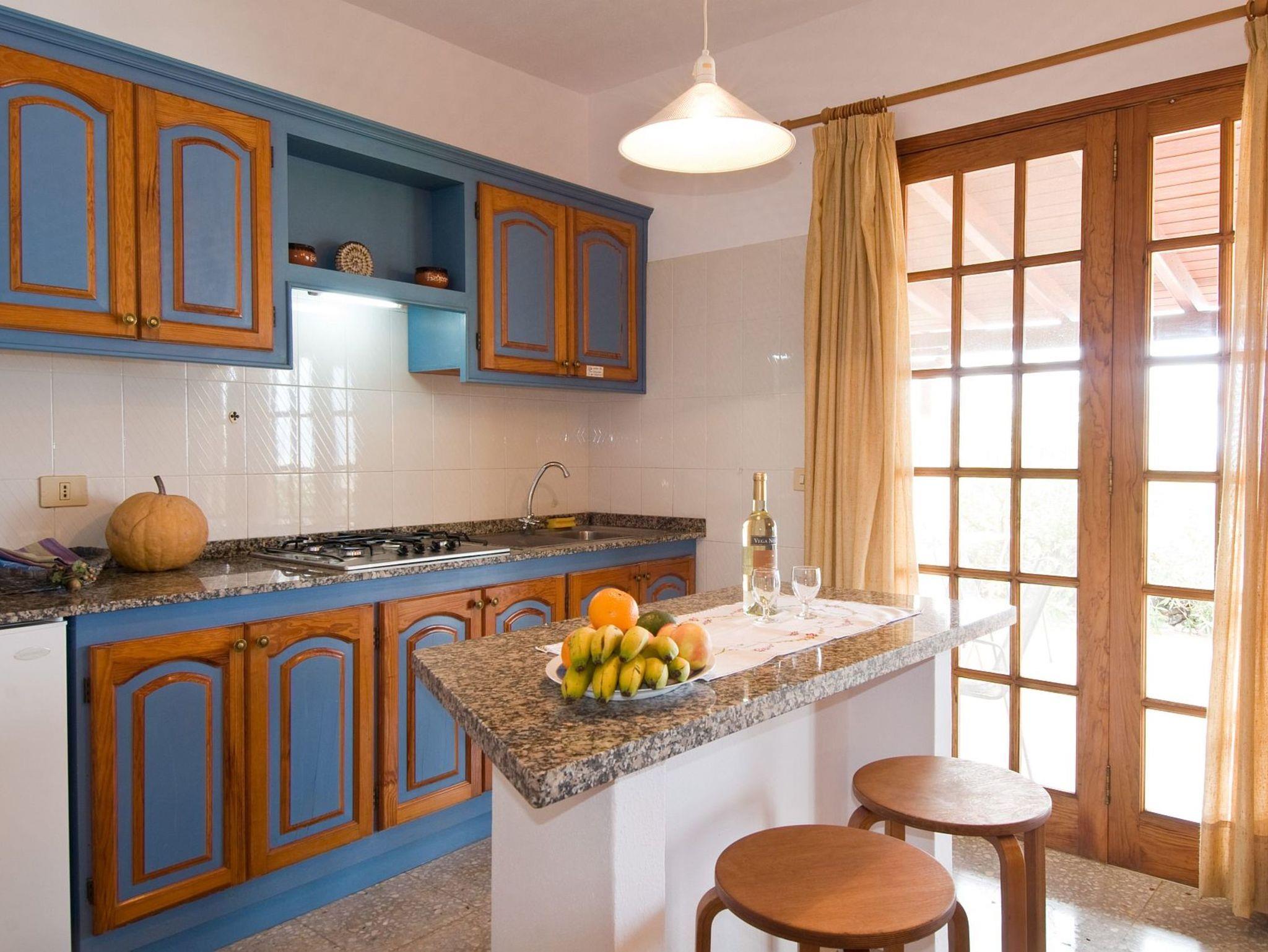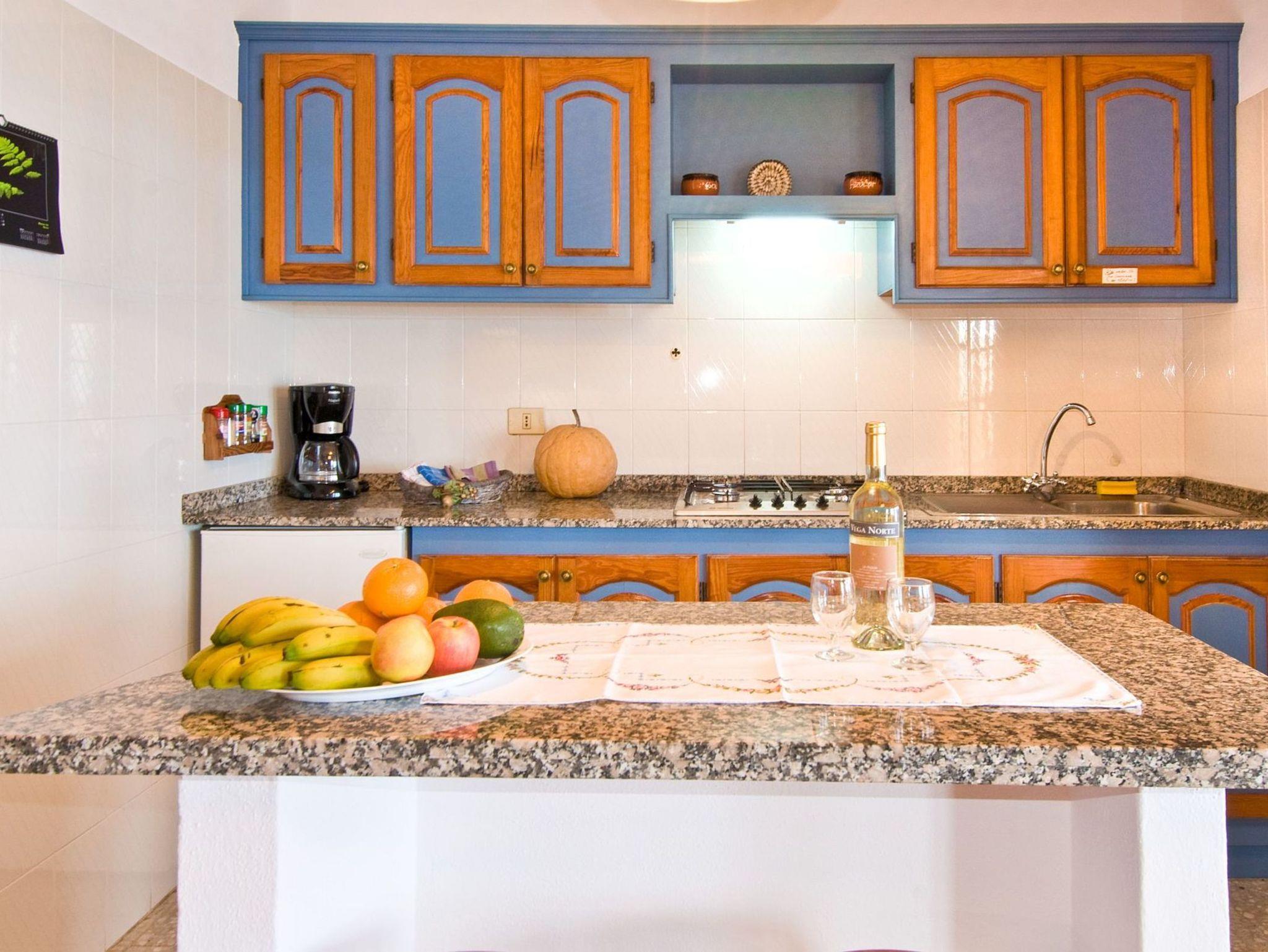 Die Küche grenzt, getrennt durch eine Bar (Esstisch) mit Hockern offen an den Wohnbereich an. Sie besteht aus einer Küchenzeile mit Gasherd (4-flammig), Kühlschrank mit Gefrierfach sowie gut bestückten Schränken mit reichlich Geschirr und Kochgerät.