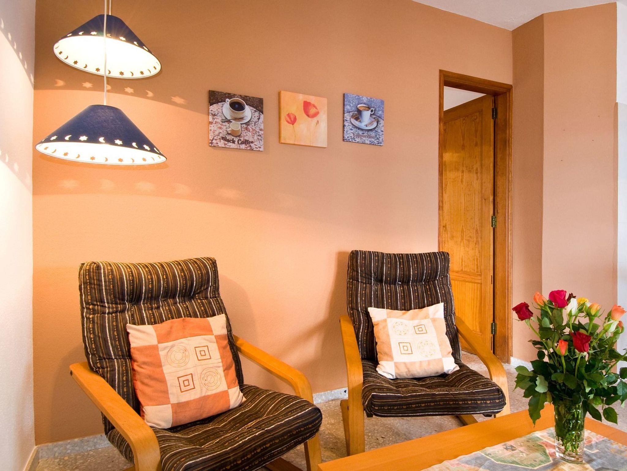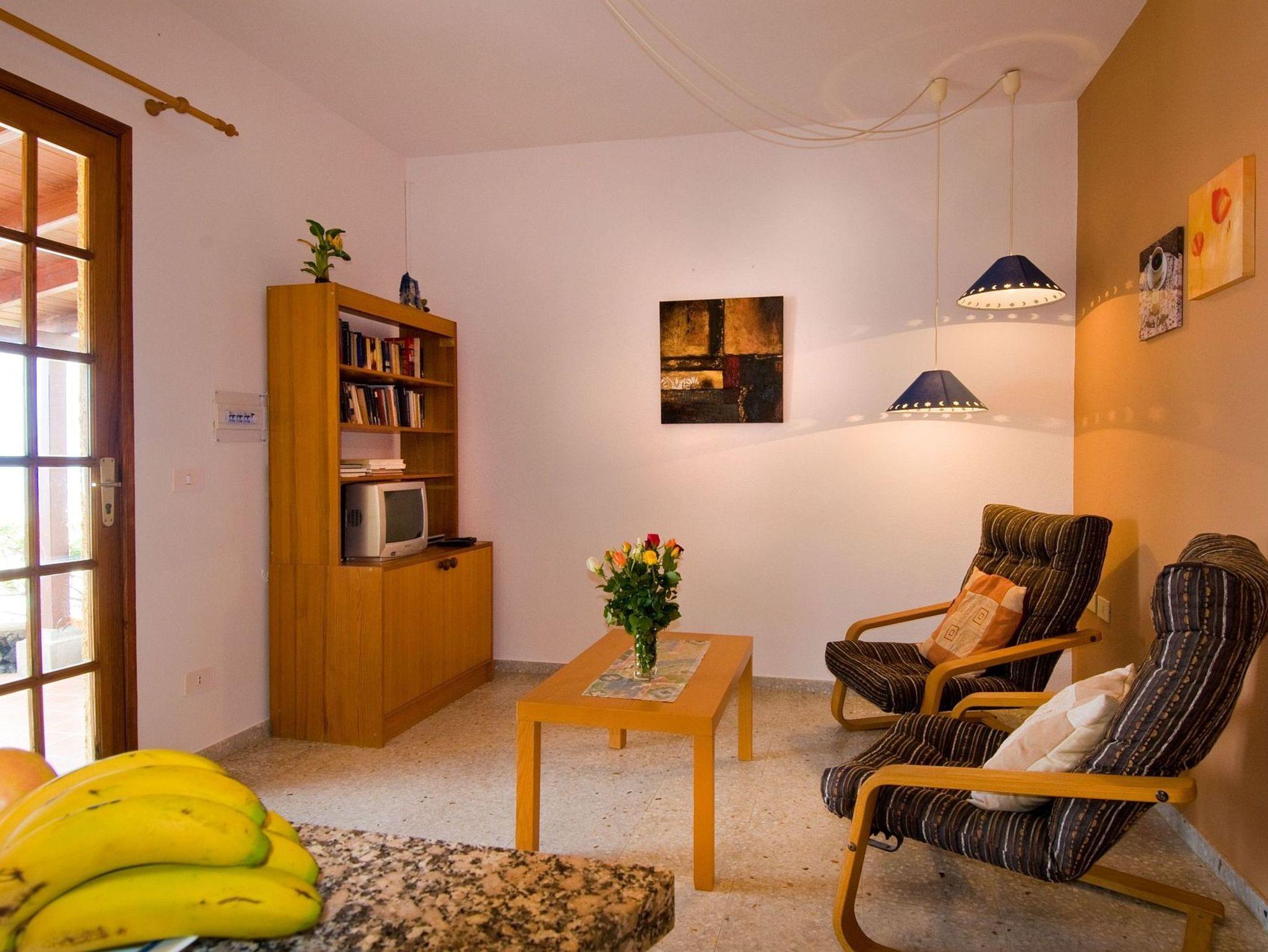 Der Wohnraum, den Sie über die Terrasse betreten, ist mit 2 Sesseln , einem kleinen Fernseher mit Sat-TV sowie Büchern und Spielen ausgestattet.
