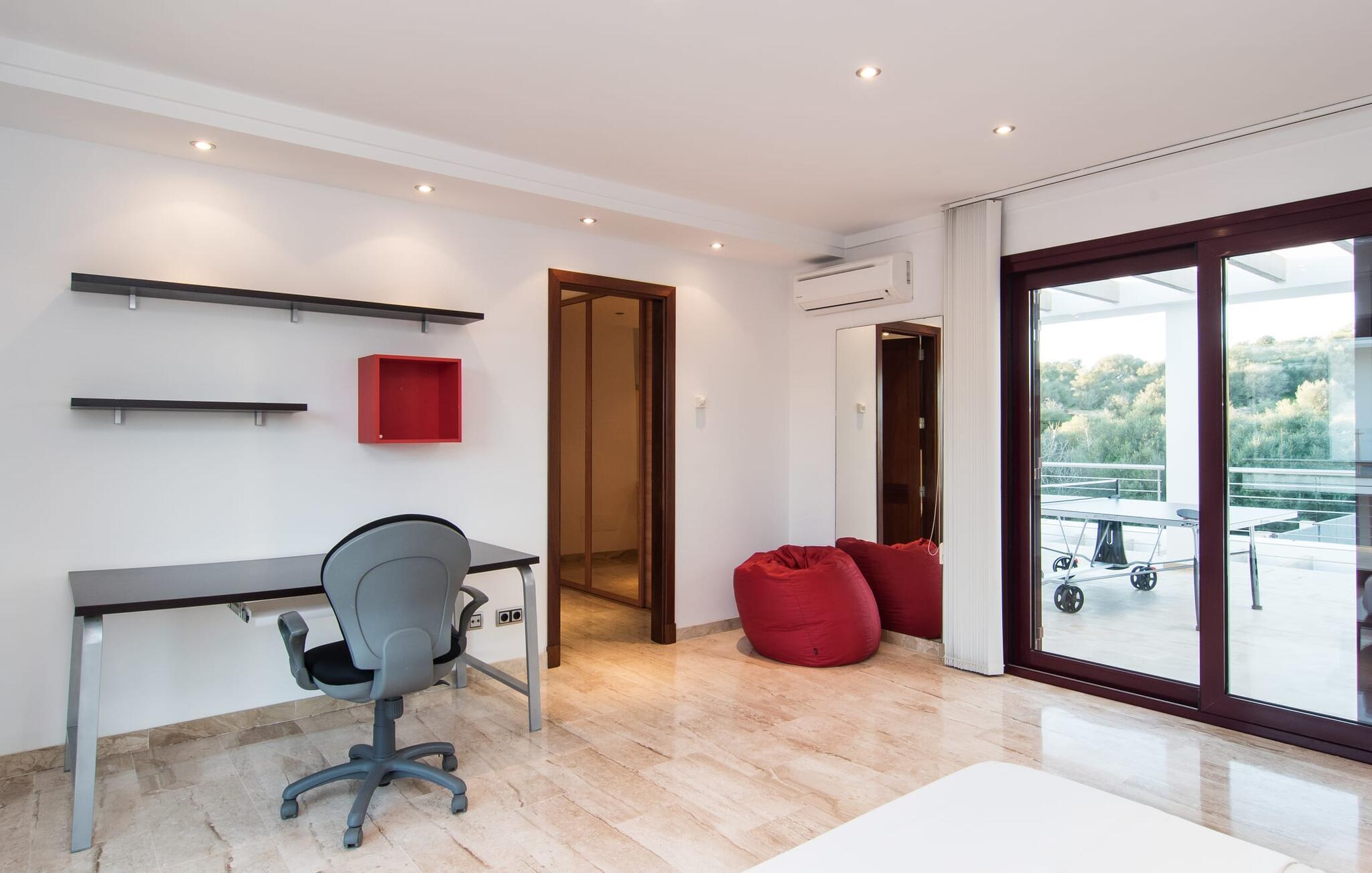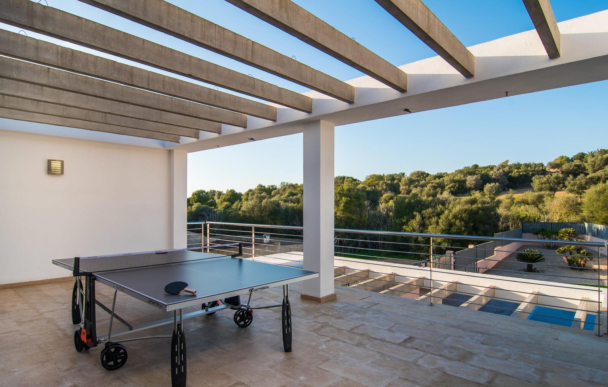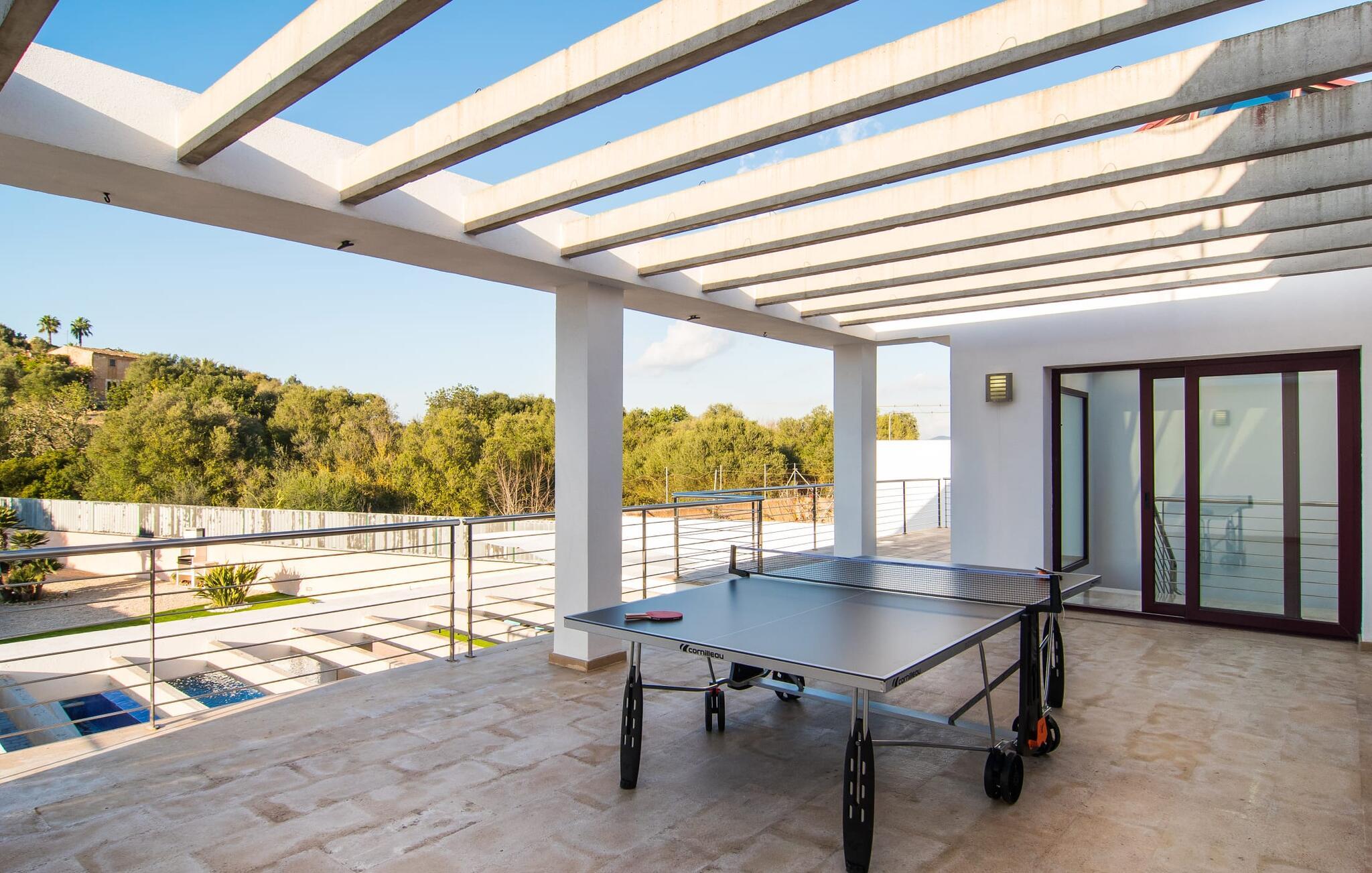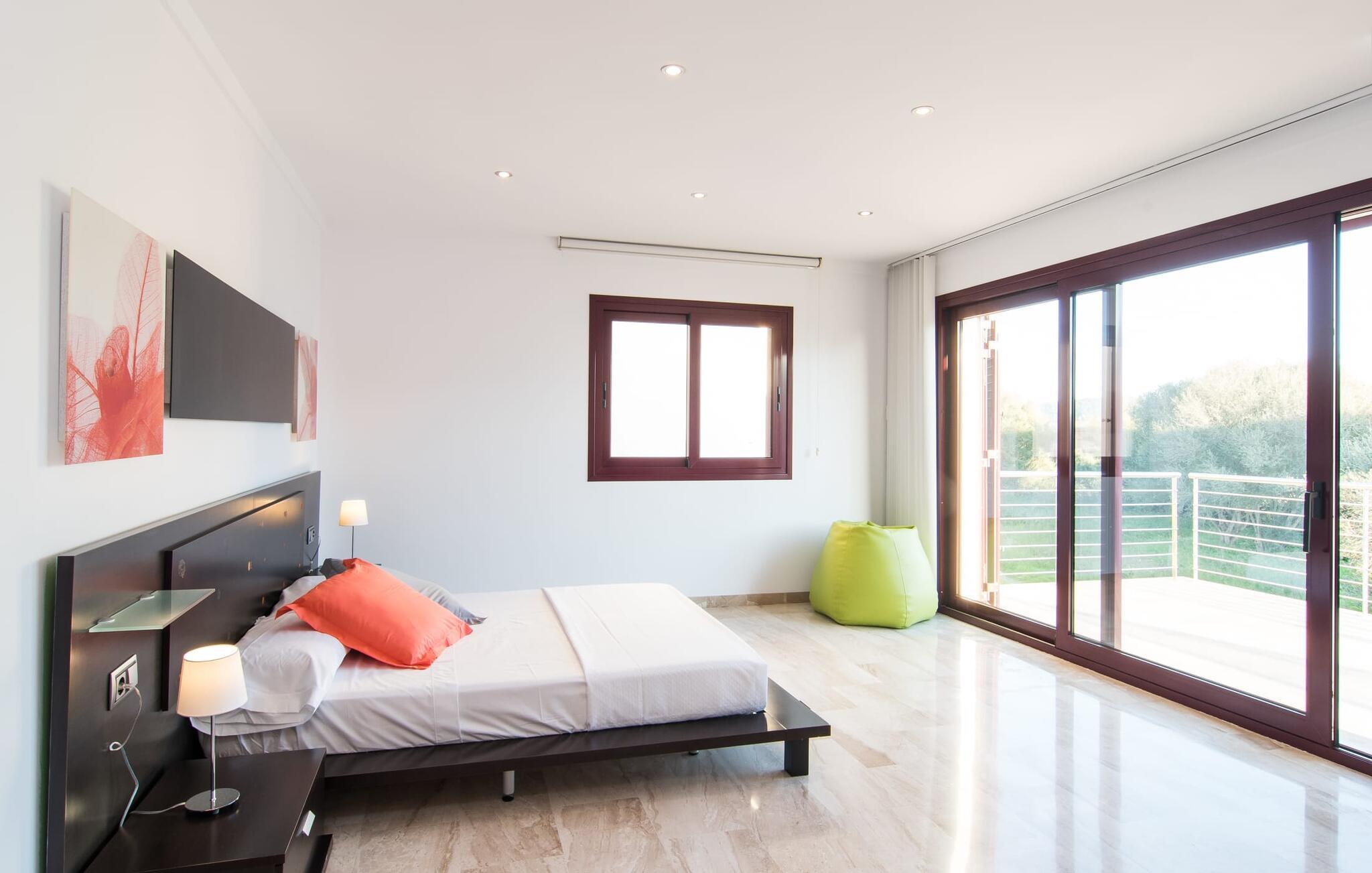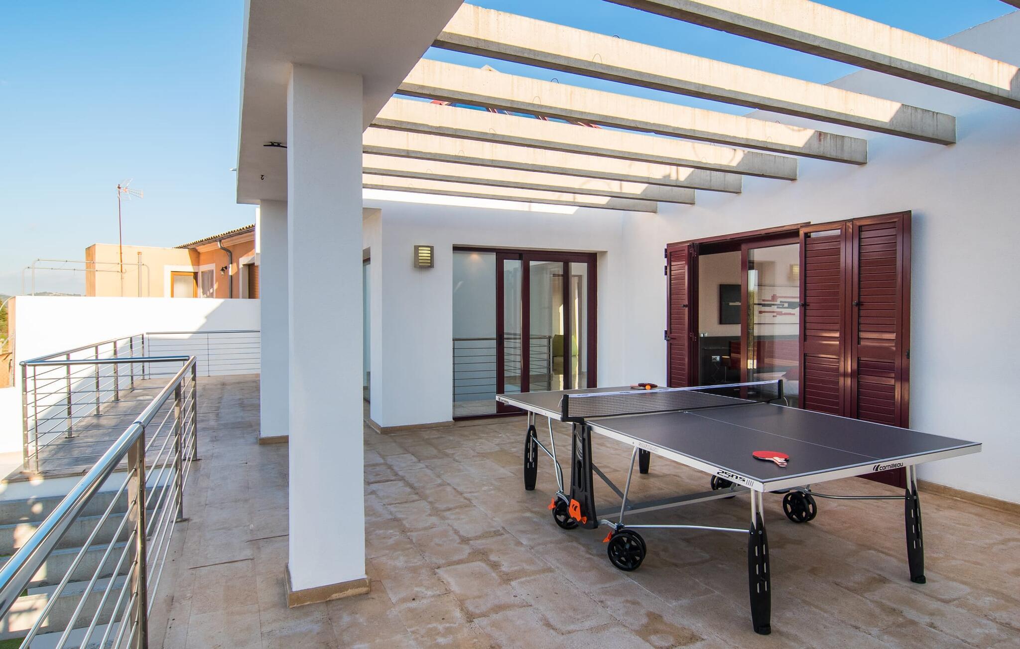 Har I en passion for moderne arkitektur? Kan I lide store, lyse rum og klare linjer? Og værdsætter I at have alt inden for rækkevidde, når I er på ferie – fra supermarkedet til restauranter og caféer til omfattende indkøbsmuligheder? Så er der en god chance for, at I vil føle jer hjemme i den super smarte villa “Puig Verd”! Det lyse hvide hus med sit spektakulære glastag ligger på en typisk villavej i Felanitx. Fra den overdækkede terrasse med spisebord og stole i stueetagen samt den delvist overdækkede tagterrasse kan I se ud over de skønt grønne omkringliggende bakker - og over den store infinity pool lige bag huset. I kan nyde den varmende sol på komfortable liggestole lige ud til det kølige vand eller fordybe jer i en spændende krimi under parasollen. Blot et par meter væk ligger den in-house grill, som inviterer jer til at tilberede kulinariske delikatesser i det fri. Og hvis I vil have lidt motion bagefter, er det bare at gå ovenpå og spille et spil bordtennis på den rummelige tagterrasse. Værelserne i jeres villa strækker sig over to etager. Store vinduer lukker det typiske middelhavslys ind overalt; Denne effekt forstærkes af de sprøde hvide vægge, der findes i de fleste rum. En rummelig spise- og opholdsstue venter på jer i stueetagen: med et elegant glas spisebord med stole, oplyst af en futuristisk udseende lampe og en indbydende sofa med hyggelige puder og et sofabord til snacks og drinks under en hyggelig aften med at se tv . Villaen byder dog på meget mere spænding end et fjernsyn - og bekvemt er der en blød lænestol lige foran den: ejerne af villaen har installeret et kæmpe tropisk akvarium i stuen, med eksotiske, farverige fisk, der svømmer mellem smukke koraller . Det stilrene køkken med højkvalitets hvidevarer er også farverigt indrettet i røde og grønne toner. To smagfuldt indrettede soveværelser og to badeværelser, hvoraf det ene er en-suite, fuldender boligarealet i stueetagen. Ovenpå er der yderligere to soveværelser med private badeværelser. "Puig Verd" ligger midt i Felanitx, en afslappet by i det sydlige Mallorca og også centrum for den næststørste vinregion på øen. Fra jeres sommerhus, der ligger direkte på villavejen, kan I nemt og bekvemt gå ind i landsbyen, shoppe eller besøge en eller to restauranter. Udover de gode egnsvine bør I bestemt prøve de aromatiske kapers, der dyrkes i området. Et besøg på det ugentlige marked om søndagen er altid umagen værd, især de kunstneriske keramiske stykker er meget populære her. Men det omkringliggende område af byen er også interessant: for eksempel klosteret St. Salvador, som ligger på en imponerende bakke i nærheden - I kan endda se det fra huset. Ikke alene er klostret med sin storslåede kirke et besøg værd, panoramaudsigten derfra vil også sikre et uforglemmeligt ferieminde! Hvis I foretrækker at tage til stranden, skal I blot køre cirka 14 km til Cala Murada eller Cala Tropicana. I øvrigt: Cykelforretningen "Els" ligger 100 m fra huset. Hvert ophold i villaen får 10% rabat på alle produkter og tjenester. Der er også gode forbindelser til cykelstierne omkring huset. Har I selv medbragt cykler, kan I parkere dem i det fredede område på den nederste overdækkede terrasse. Villa "Puig Verd" imponerer på alle niveauer: Det supermoderne hus med møbler af høj kvalitet er et sandt højdepunkt for arkitekturelskere, ikke kun med sine delvist overdækkede terrasser på flere niveauer og dets glashvælvede loft. Den scorer også point med sin store, skrånende pool og velholdte græsplæne – og sidst men ikke mindst sin fremragende beliggenhed i den afslappede lille by Felanitx på det sydlige Mallorca. For en dag på stranden skal I kun køre cirka 14 km, for eksempel til Cala Murada.